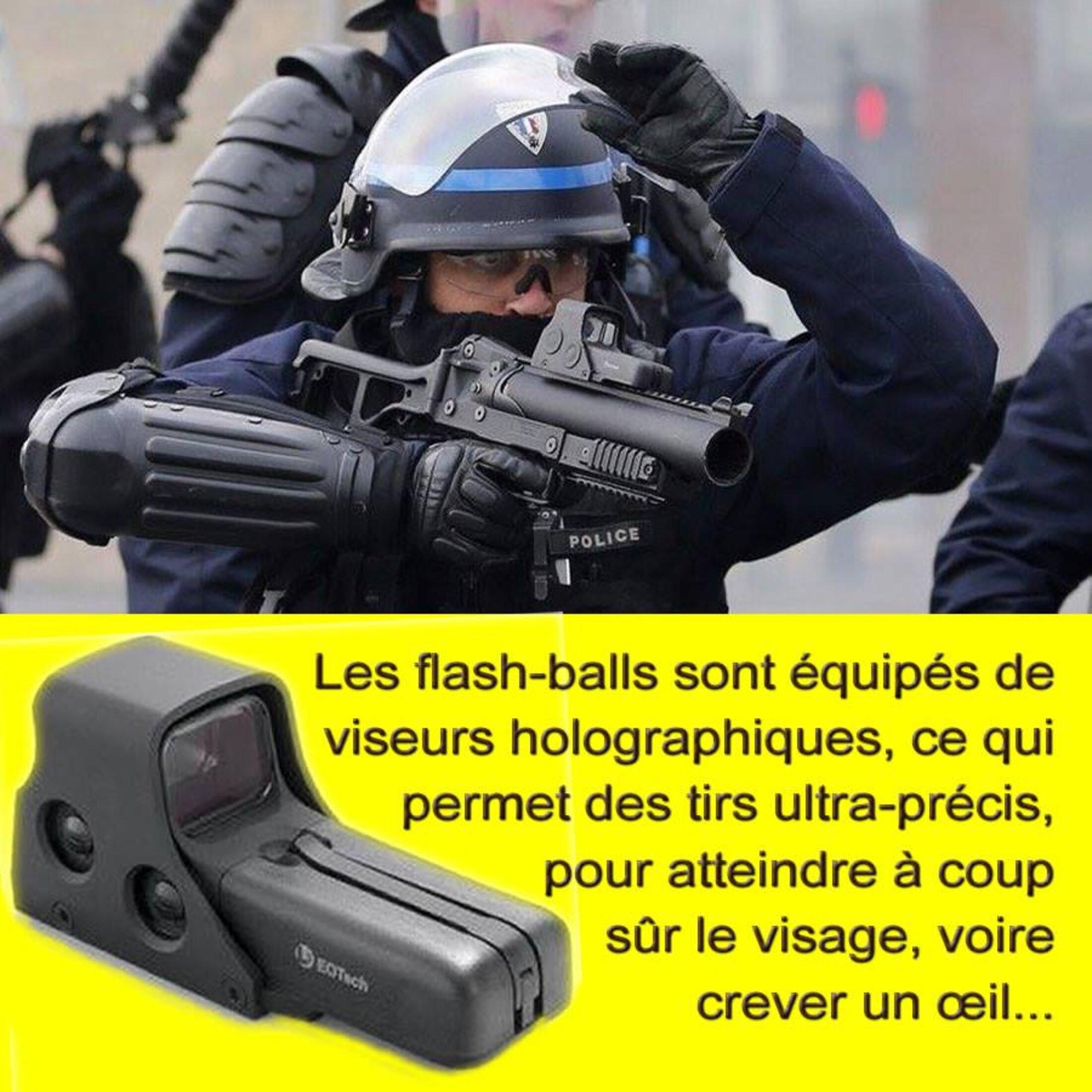 Les flash-balls utilisés par les fonctionnaires chargés de la répression des manifestants (les forces du désordre) sont équipés de viseurs holographiques... ce qui permet des tirs ultra-précis, par exemple pour atteindre à coup sûr le visage, voire crever un œil...