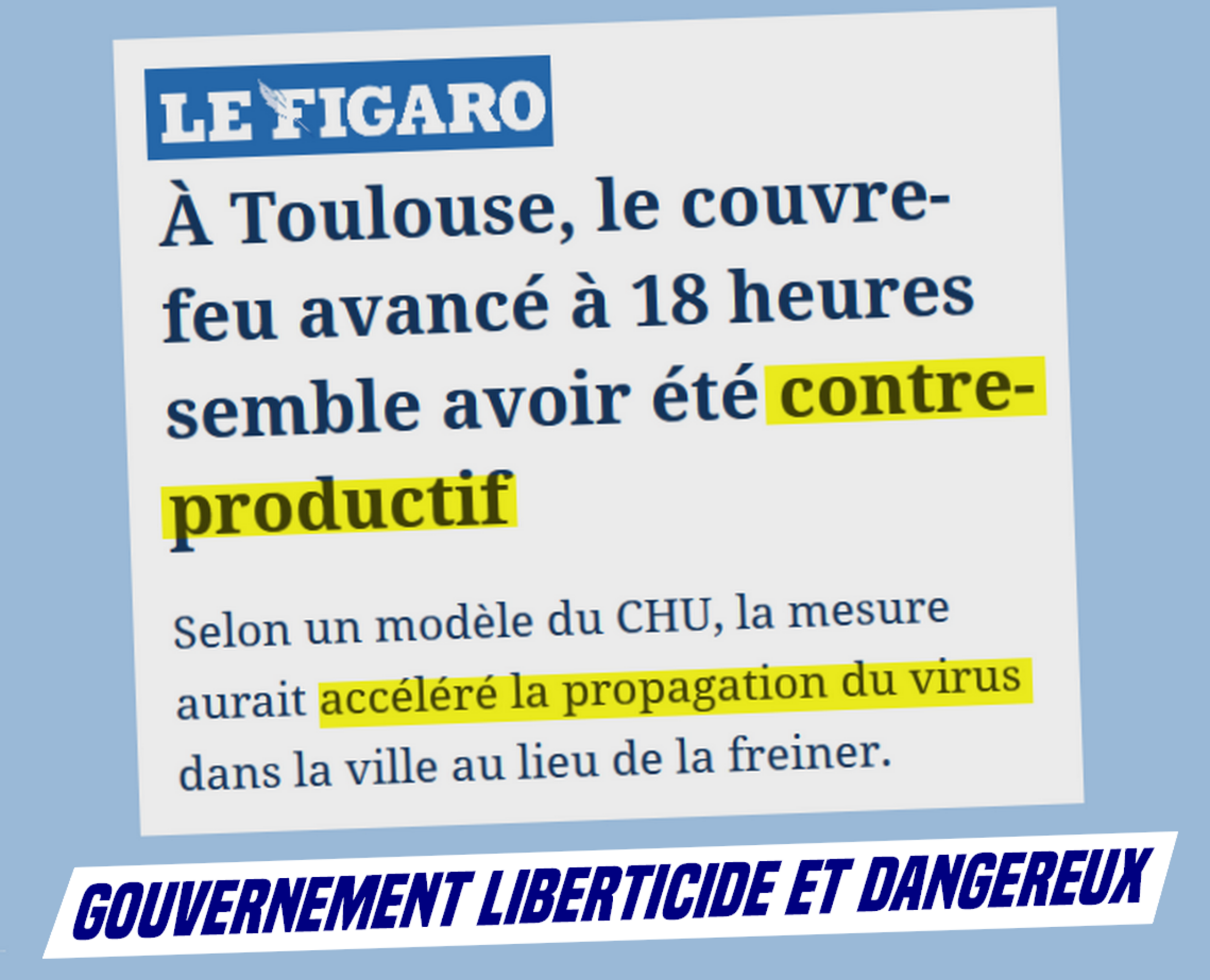 ➡︎ Cette mesure réservée aux périodes de guerre est donc très probablement inefficace voire néfaste sur le plan sanitaire, et totalement attentatoire aux libertés les plus fondamentales. Avoir peur de sortir prendre l'air en début de soirée, avoir peur de rentrer trop tard du travail et se priver de voir ses proches sur son temps libre est devenu une donnée de nos existences. L'épidémie de dépressions, de suicides, le mal être général, sont une conséquence immédiate de ces mesures autoritaires et absurdes. Le gouvernement en pompier pyromane irresponsable, ruine nos vies. Jusqu'à quand ?