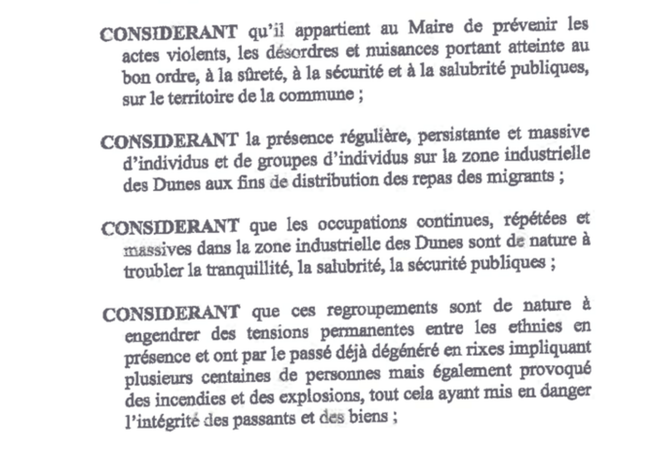 En décembre dernier, la rue Beaumarais dans laquelle elles se sont garées a été ajoutée à un arrêté préfectoral reconduit chaque mois depuis septembre 2020, qui interdit « les distributions gratuites de boissons et denrées alimentaires » dans une trentaine de lieux de la ville de Calais. Seule une association mandatée par l’État, « La Vie Active », est autorisée à distribuer, dans certaines rues. A la base, l’arrêté préfectoral trouvait sa justification dans des raisons liées à la crise sanitaire. Il entendait proscrire les rassemblements de personnes, ceux-ci étant favorables à la diffusion du Covid-19. Aujourd’hui, alors que les restrictions sanitaires sont petit à petit levées dans le pays, il ne trouve sa justification que dans la prévention de troubles à l’ordre public. Les termes de l’arrêté sont clairs : « Pour mettre fin aux troubles à l’ordre public liés à des rassemblements non déclarés, sont interdites les distributions gratuites de boissons et denrées alimentaires dans les lieux cités ci-après ».