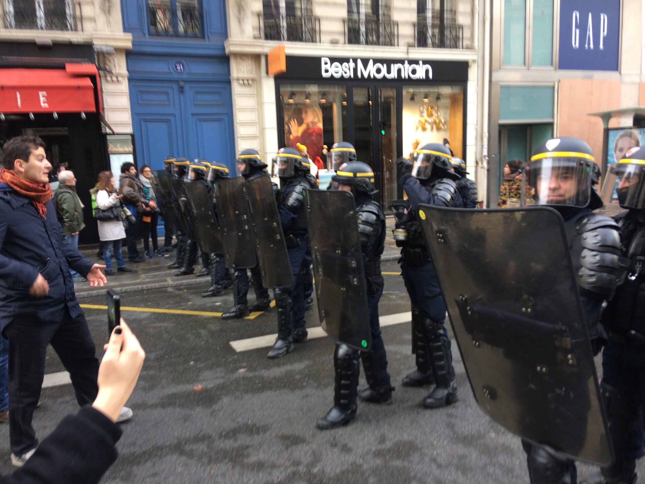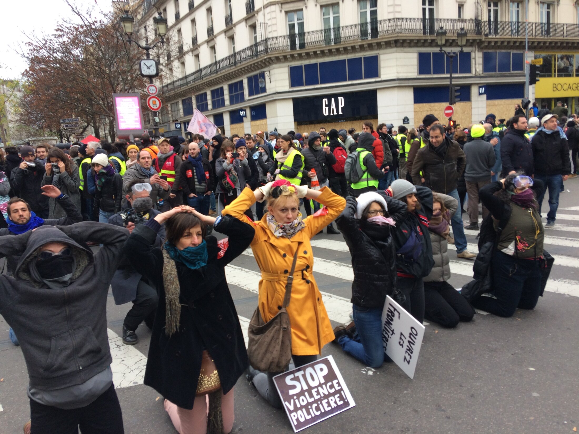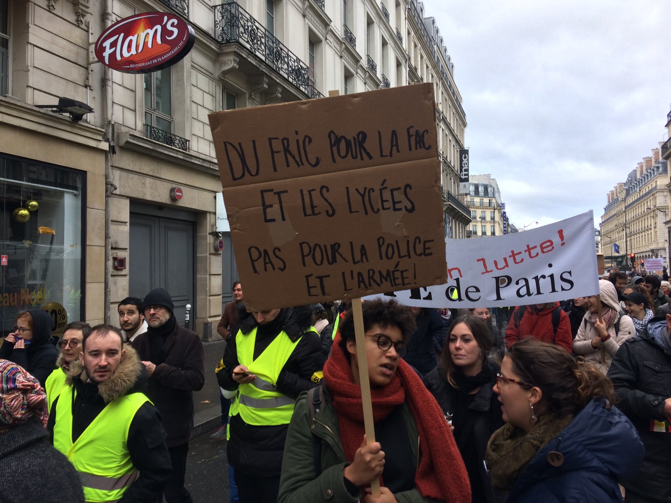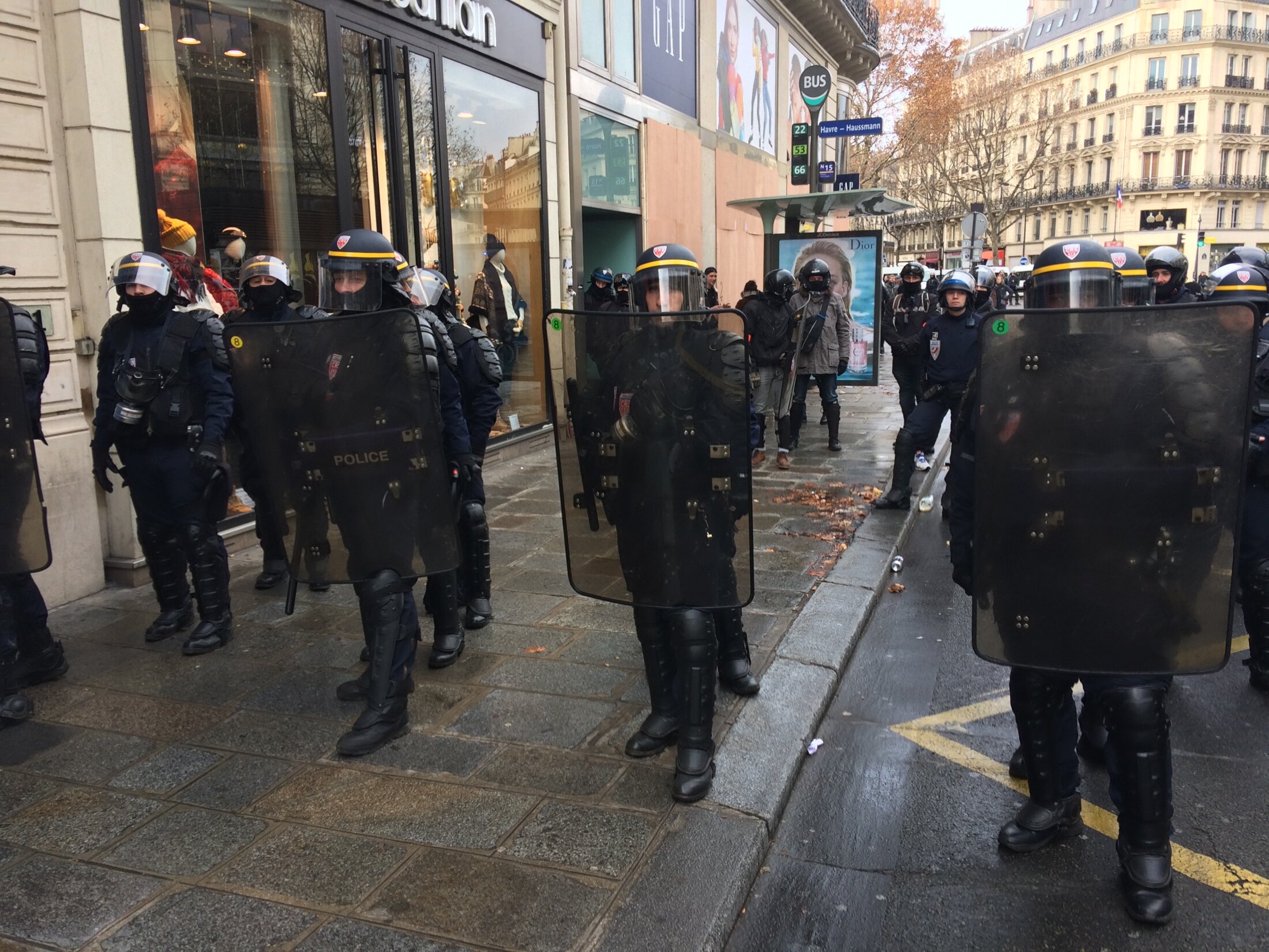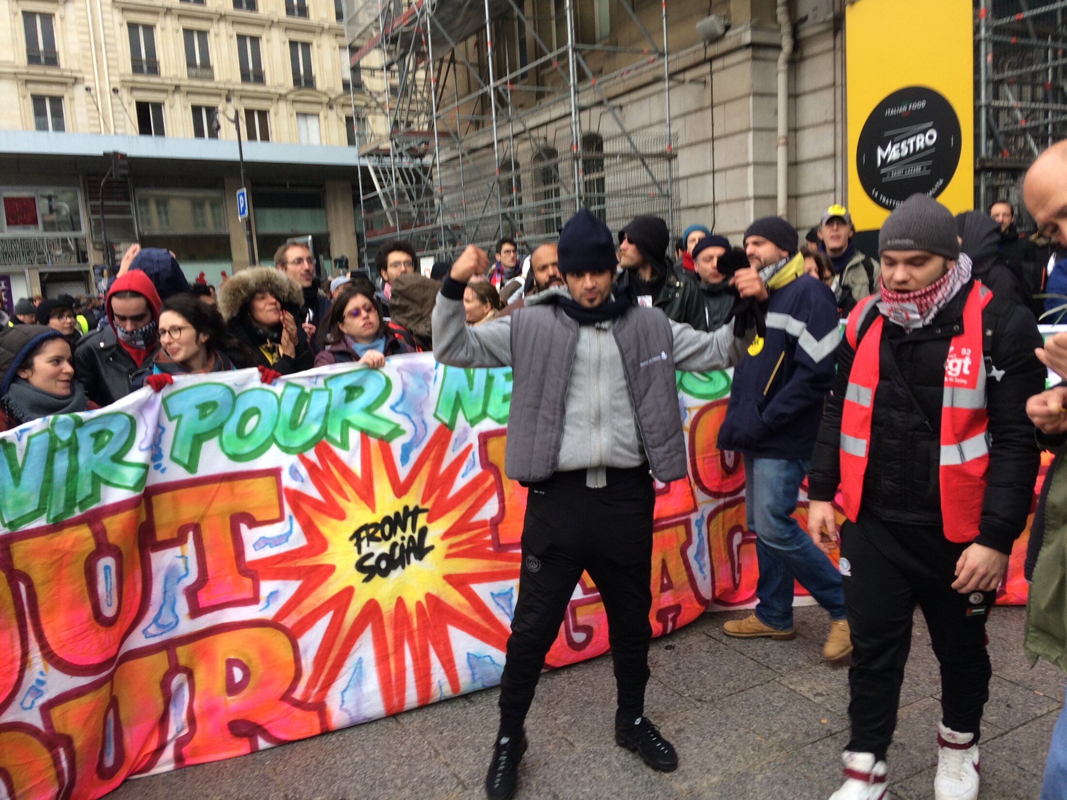« Police de Macron, police du capital ! Laissez-les passer, cassez-vous, cassez-vous ! Tout le monde déteste la police ! Police partout, justice nulle-part, Macron démission ! »