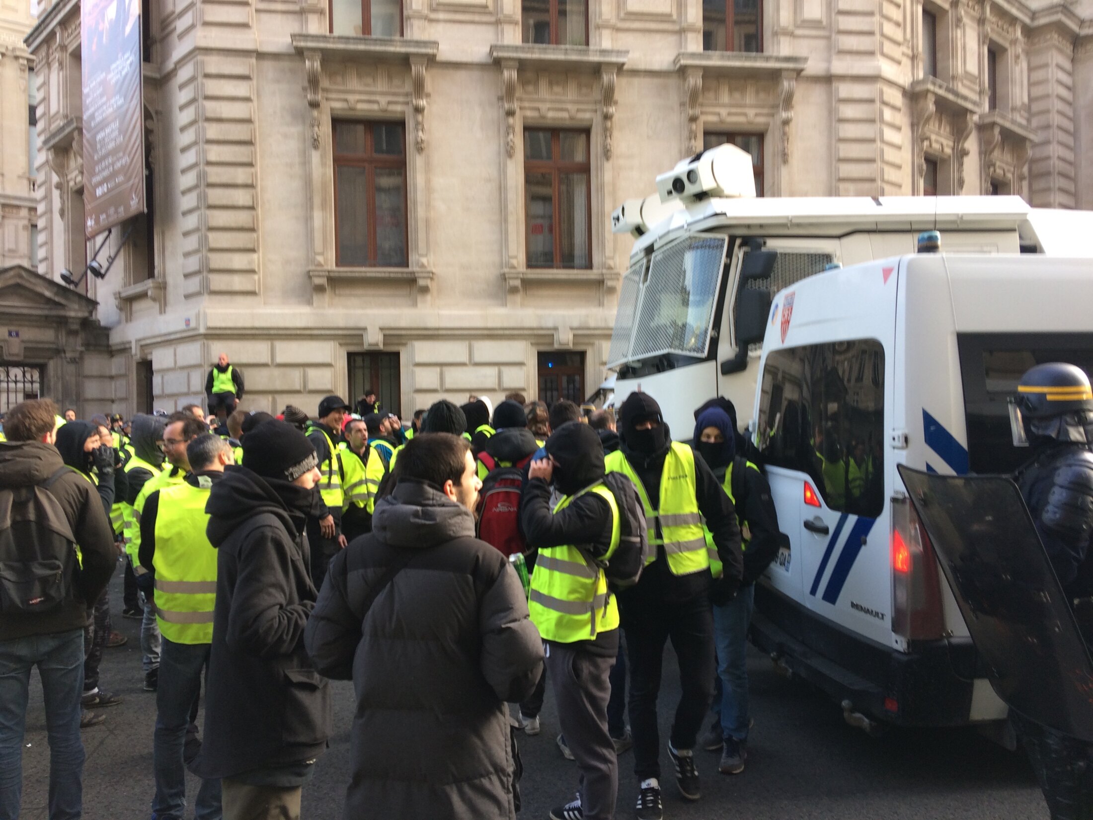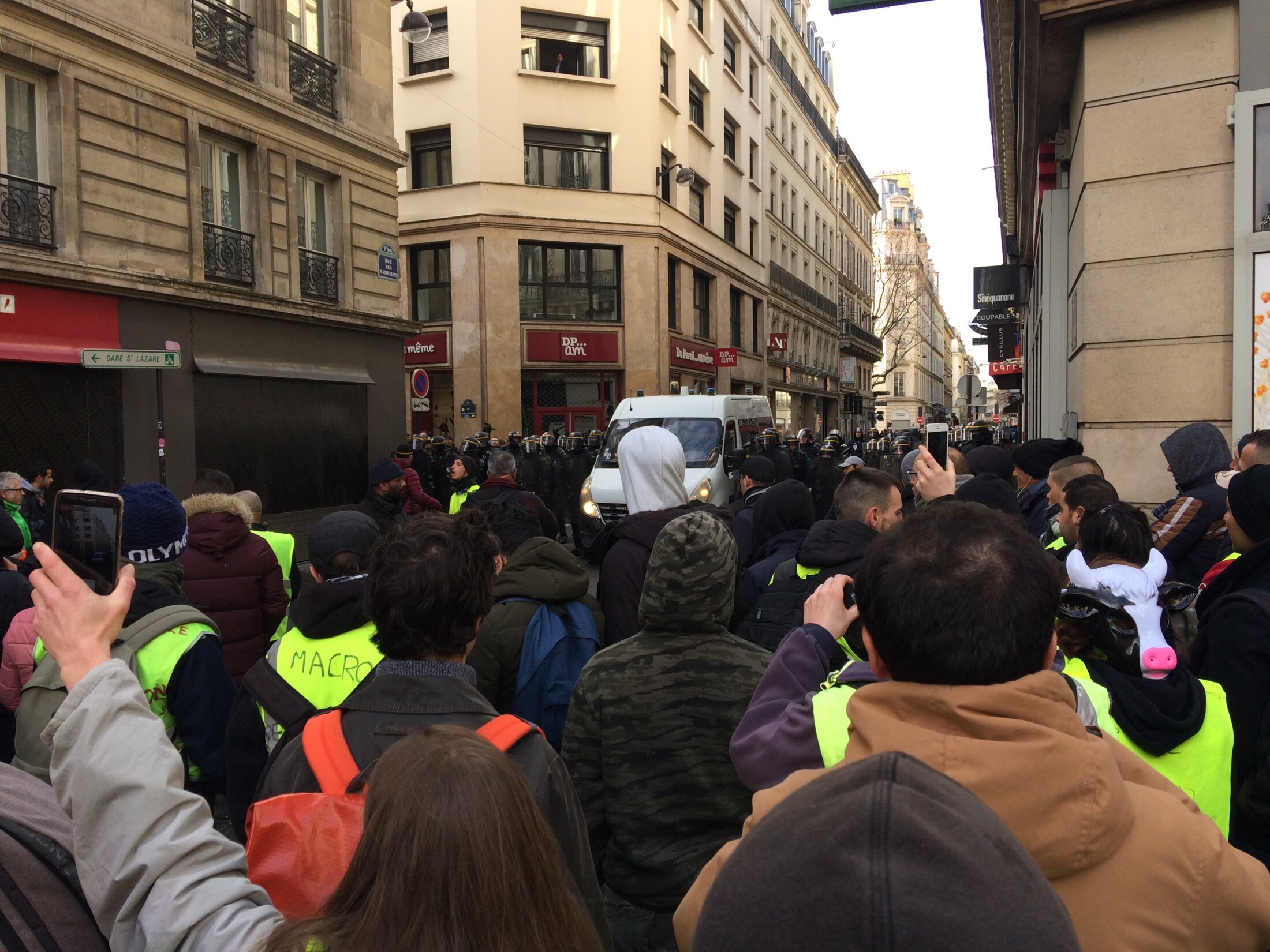 Côté êtres humains, on s'interroge. A ce moment, nous ignorions qu'à Bastille, il y avait "confrontation", comme ils disent à Radio-Paris... Donc, va pour le 8ème, c'est là que Macron et ses riches parrain habitent. Sans surprise, leur soldatesque nous bloque 100m plus loin, tirs de barage, canons à eau... Pour éviter une nouvelle nasse, nous tournons immédiatement à droite : petites rues autour du Forum des Halles. Le dédale étant propice aux attaques sournoise du Guêt, nous invitons nos meneurs (dont le camarade Joël) à continuer via RATP, en ces temps difficiles, c'est plus sûr...