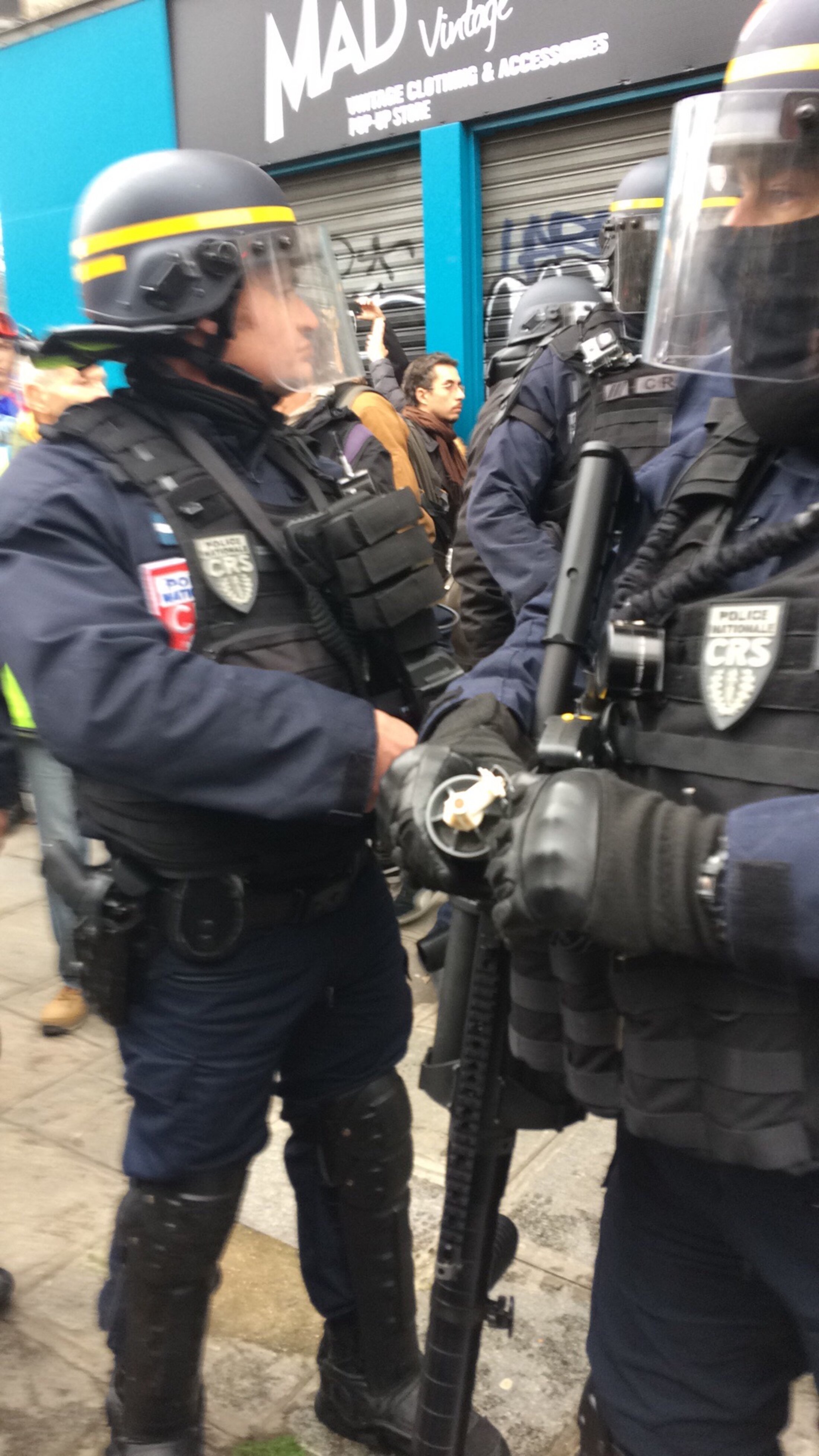 « Ne courez pas, camarades ! »... « Ne respirez pas ! Attention, ils chargent ! »« T'as de l'eau ? »... « Les putains de lunettes, ça sert à rien, le un masque, y'a que ça de vrai »... « Tiens poto, j'ai des gouttes »... « Par ici les gars ! »... « Non, par là, 22 v'là le canon ! »... « Salut camarade de la CGT, nous on est du Schnord, y'a pas un troquet d'ouvert, par ici , ah les Parisiens ! »