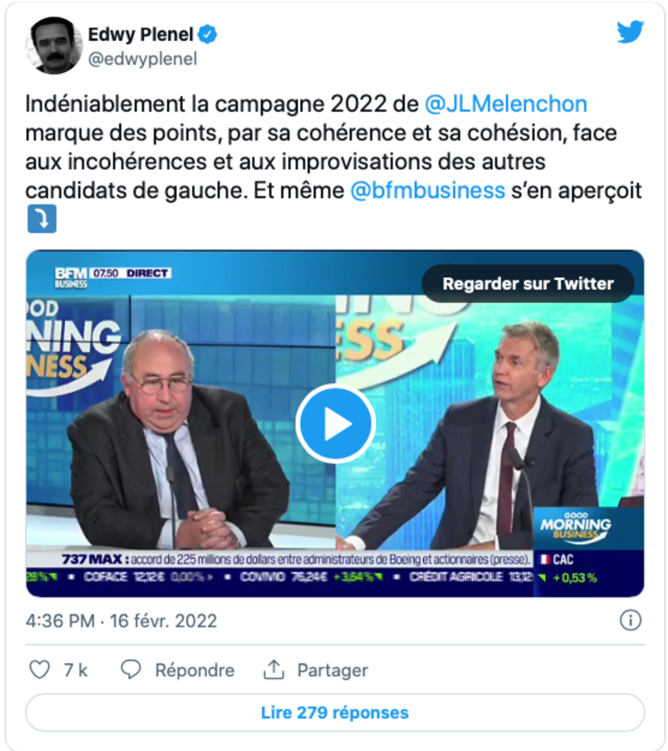Sur Twitter hier, Edwy Plenel a repris un extrait de BFM Business où l’éditorialiste Emmanuel Lechypre saluait le programme de Jean-Mélenchon et sa prestation dans l’émission Face à BFM le 25 novembre 2021. Oui, même BFM Business a noté que Jean-Luc Mélenchon fait une bonne campagne.