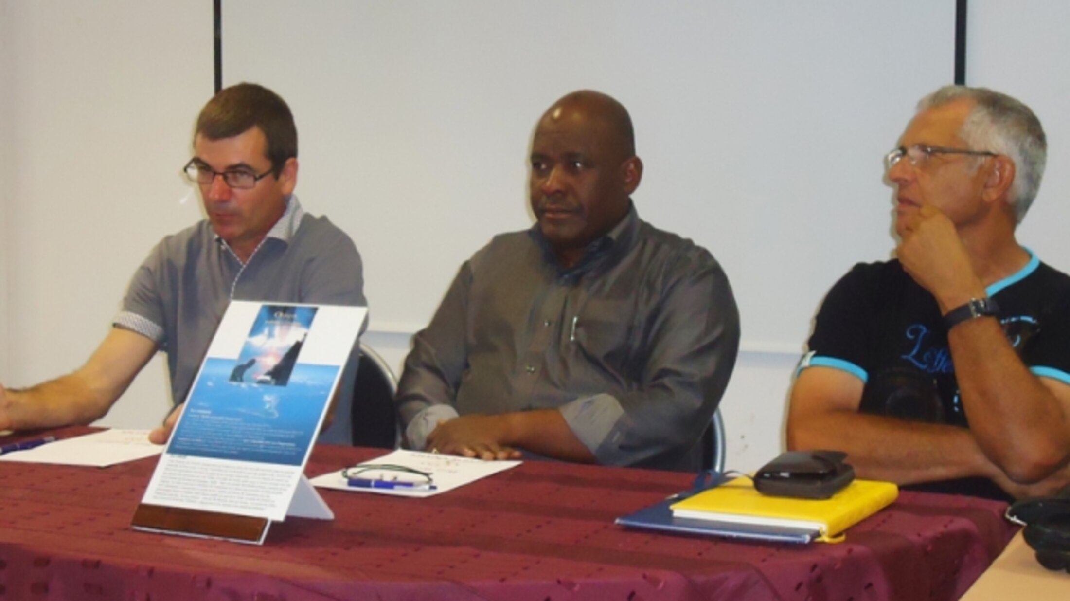Jean-Michel Fillol (au centre, entre Georges Gauvin et Olivier Bancoult) recevait ce jour-là le président du Groupe Réfugiés Chagos. C’était en mars 2013. (photo A.D.)