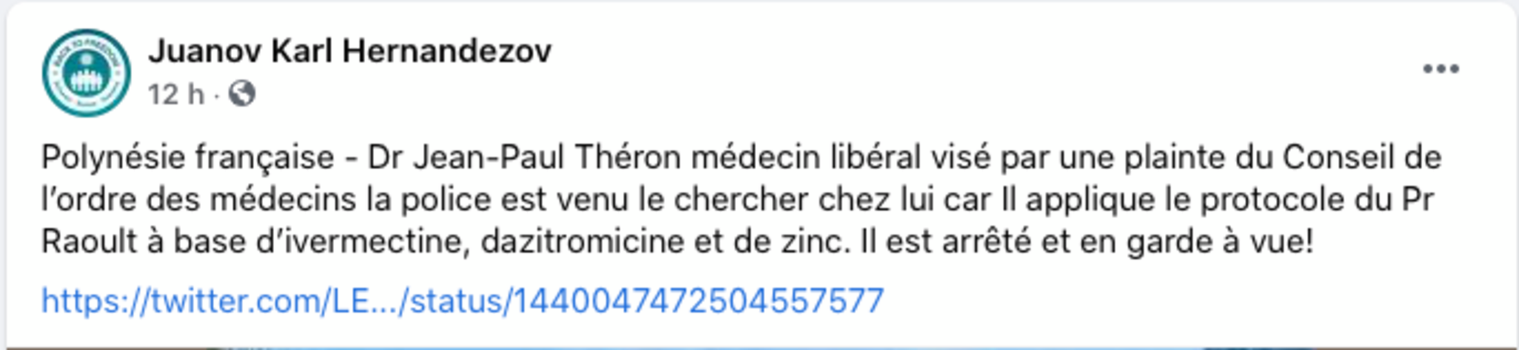 20 septembre - Le docteur Jean-Paul Théron, médecin référent du centre Manu iti de Paea et partisan des traitements à base d’Ivermectine ou d’Hydroxy chloroquine, a été violemment interpellé par les gendarmes de l'État colonial.