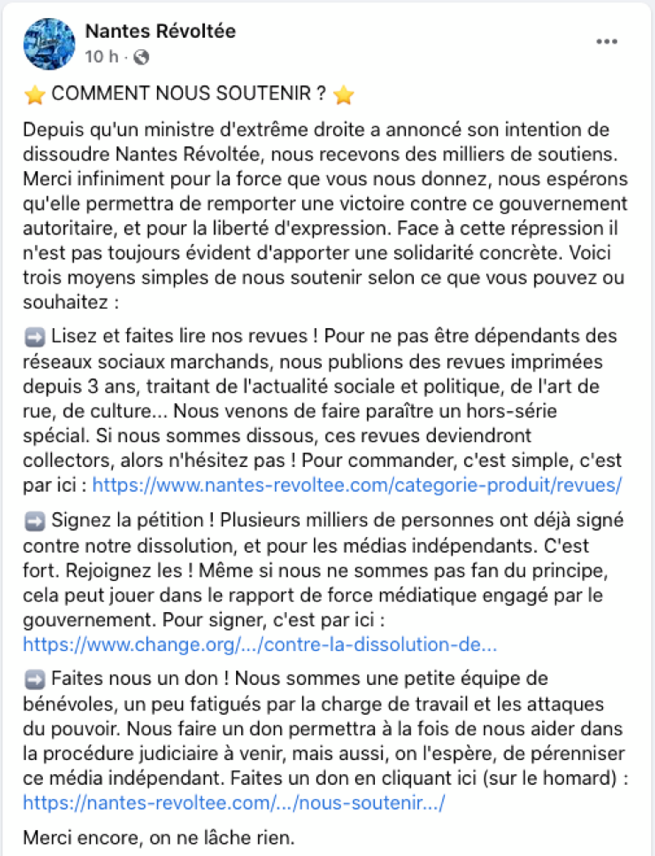 Si relayer des appels à manifester est un motif de dissolution, alors le gouvernement va devoir dissoudre plusieurs dizaines d'organisations, syndicats, pages Facebook. Si s'opposer aux violences d’État comme le fait Nantes Révoltée est un motif de dissolution, il va falloir «dissoudre» aussi des centaines de journalistes, de pages Facebook, de médias qui travaillent sur ces questions. Et après ?
