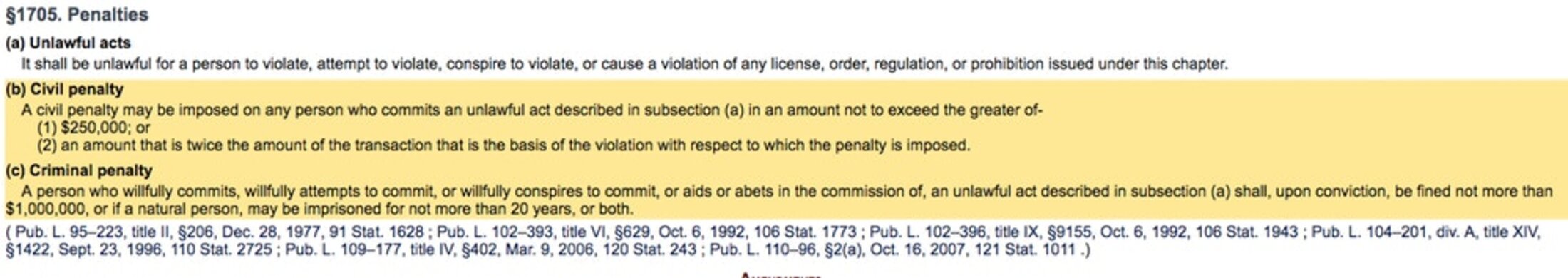 Ainsi, pour voir combien les peines sont sévères, et comment elles sont imposées, on peut comparer le texte de la Section 8(a), qui indique que les contrevenants seront punis, « selon la section 206 du International Emergency Economic Powers Act (50 U.S.C. 1705) », au tarif des dispositions pénales de cette loi, qui disent :