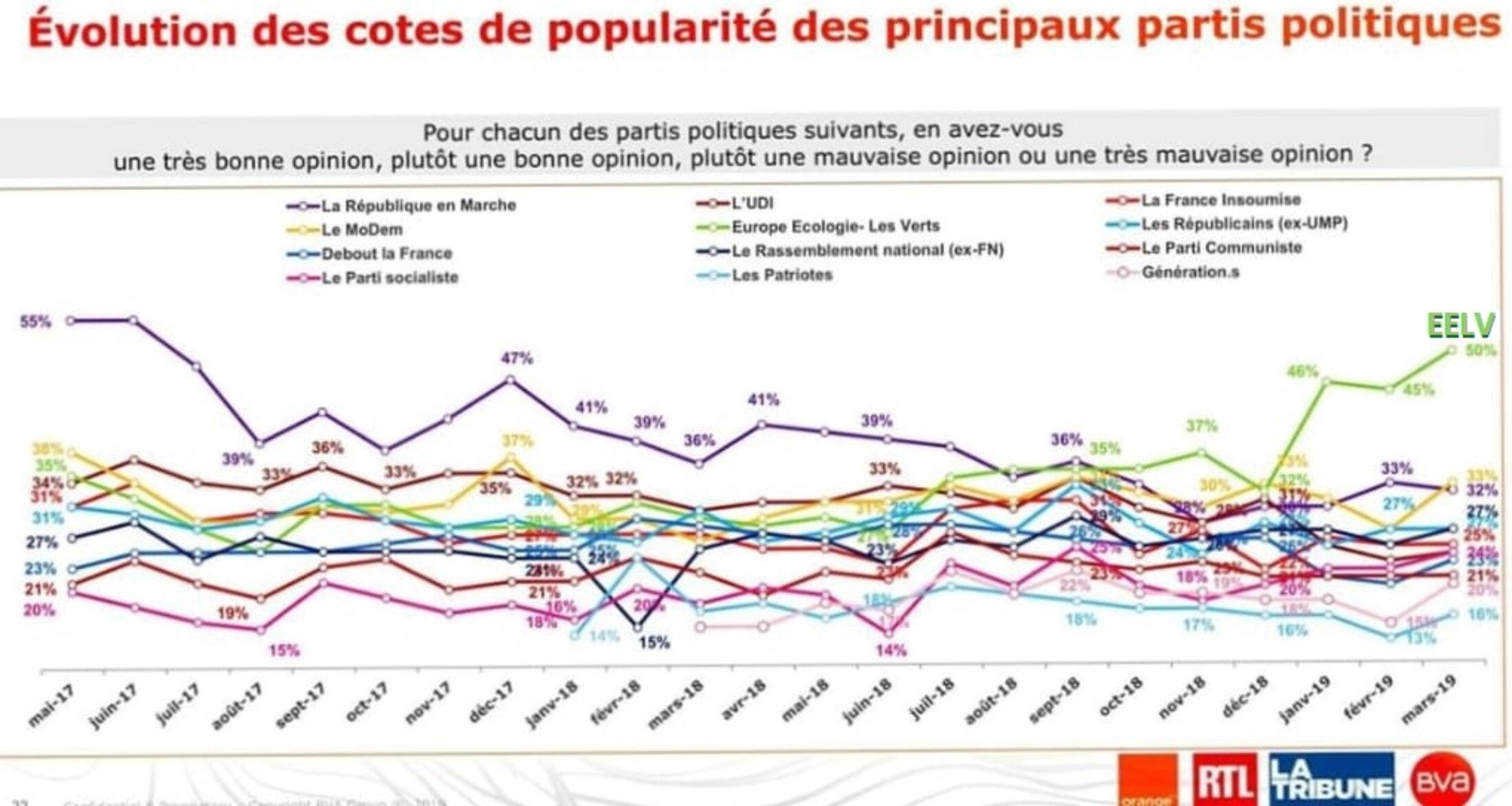 Au niveau des partis politiques, Europe-Ecologie-les-Verts tire son épingle du jeu avec 50% (5 points) de bonnes opinions contre 33% pour le MoDem et 32% pour la République en marche (32%). Le Rassemblement national (RN) tourne autour de 27% d'opinions favorables. Outre l'écart avec les autres organisations politiques, le parti des Verts a réalisé un bond spectaculaire au fil des enquêtes passant de 32% de bons résultats en décembre contre 46% en janvier et 45% en février... et 50% en mars 2019 ! [La Tribune]