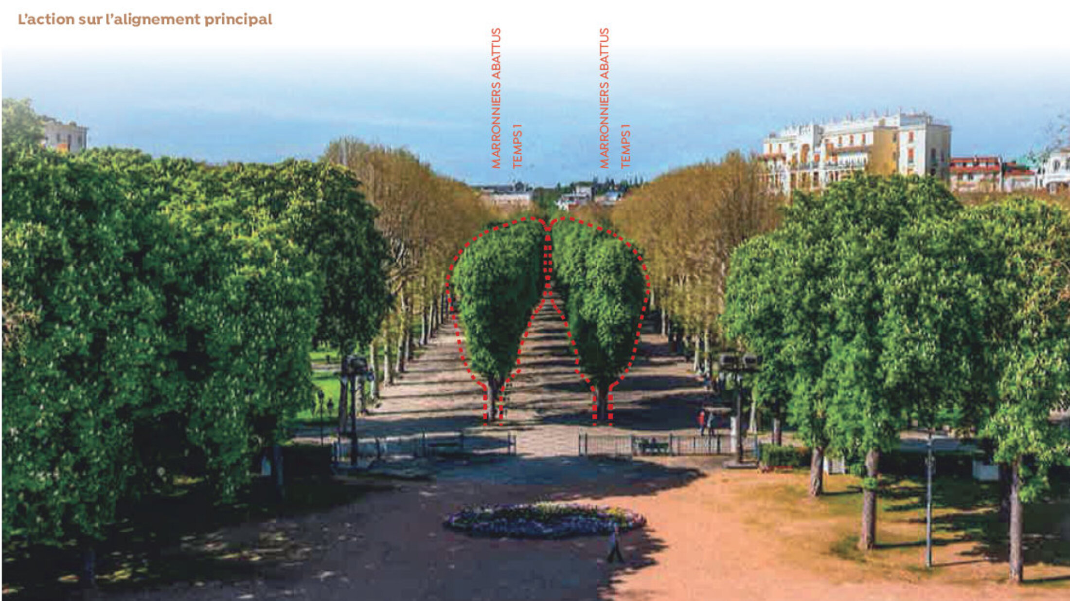 La double allée de marronniers qui mène au Théâtre sera abattue pour laisser une ouverture de 14 mètres (au lieu des 8,50m actuelle) propre à dégager la vue sur ce théâtre … et dégager la canopée des marronniers pour laisser entrer le soleil et chauffer cette allée et ceux dessous. Il est prévu de compenser. On abat les grands arbres pour les remplacer par de petits qui vont mettre des dizaines d'années, si tout se passe bien (c'est pas gagné d'avance avec sécheresse et maladie) pour seulement approcher la hauteur de ces arbres centenaires et offrir enfin un nouveau couvert frais (sauf celui définitivement perdu au centre de l'allée principale et autour du kiosque à musique). Il sera donc planté une rangée de petits marronniers en place de l'allée actuelle pour compenser mais dans quelques années, il faudra couper d'autres arbres sains et hauts (la deuxième double rangée) pour laisser la place à la croissance de ces jeunes pousses !