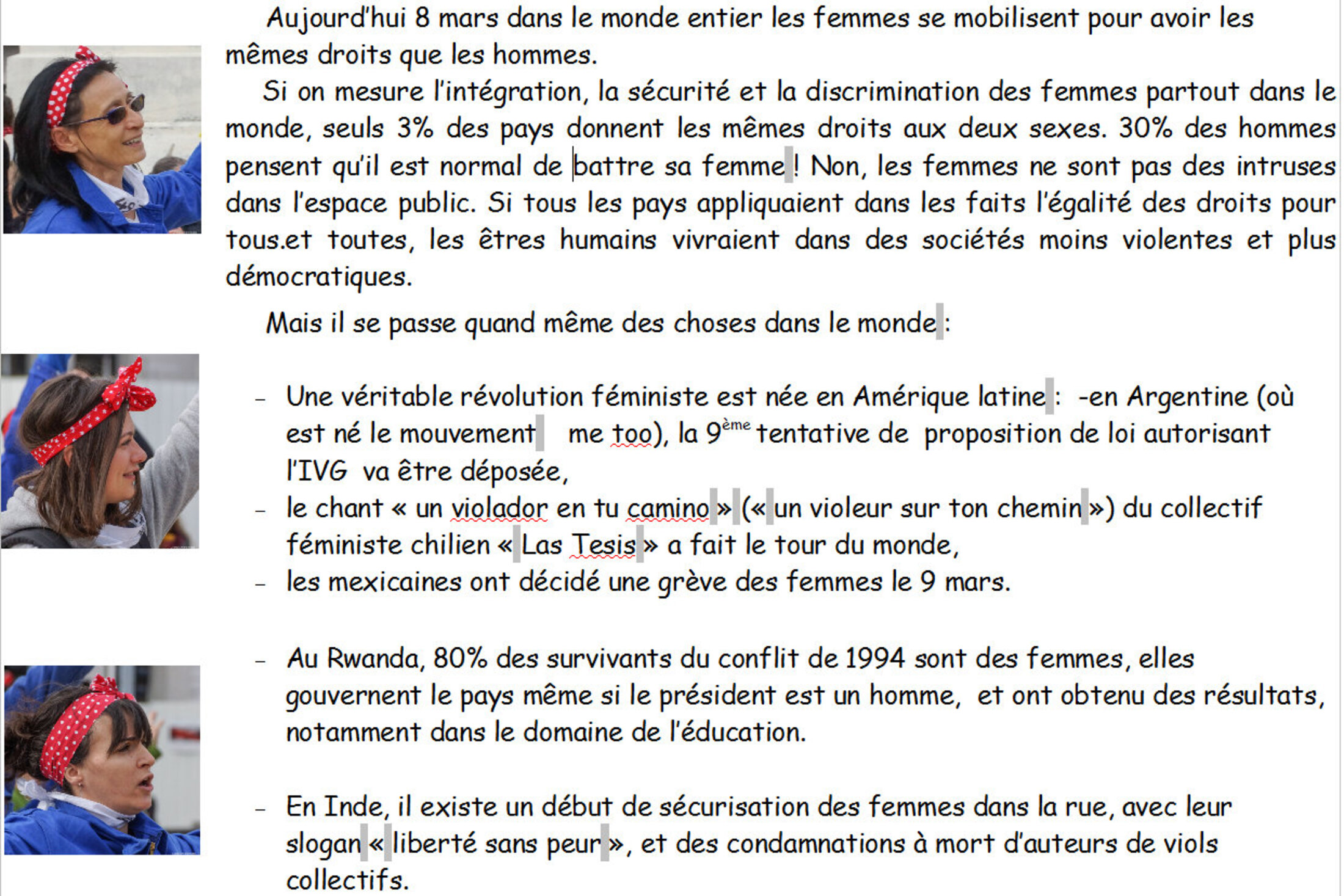 Peut-être, serait-il envisageable ou possible d'organiser un « 8 mars » mensuel pour avancer vers tous les jours comme chacune le réclame pour n'en pas rester à un jour par an ? La réponse appartient à ce collectif.