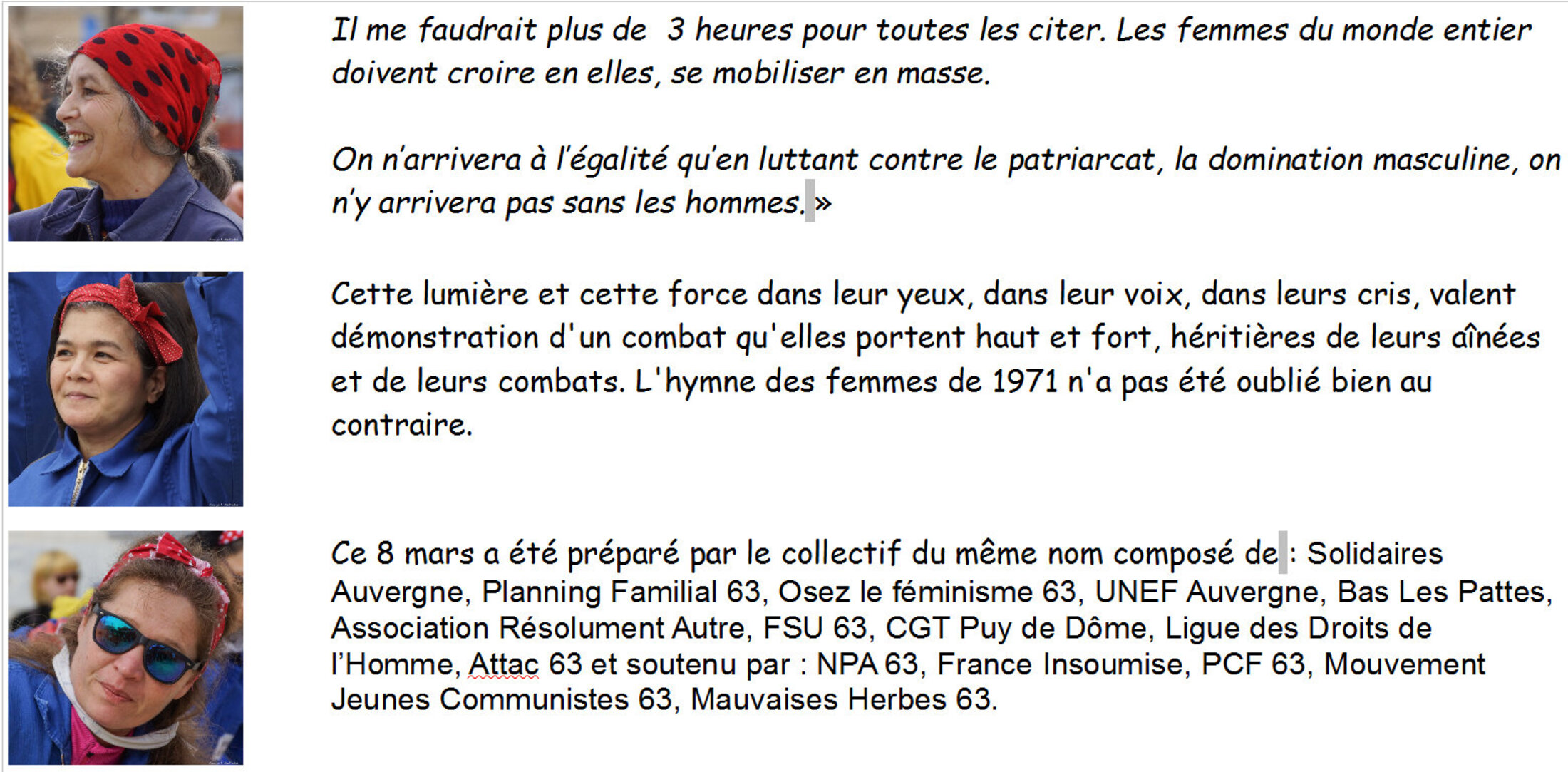 Ce 8 mars à Clermont-Ferrand, un temps radieux pour soutenir cette lutte pour les droits des femmes. Et ce sont bien les femmes qui l'ont organisée avec leurs associations et le collectif 8 mars. Des enfants - du bambin au collégien -, des ados - du lycéen aux étudiants de premières années de fac, des femmes de tous âges, en colère, joyeuses, rieuses, criant, indignées ont investi en nombre, rues, boulevards et jardin Lecoq pour des pauses fréquentes des « chiliennes » contre viols et agressions sexuelles, les Rosies avec moult chorégraphies anciennes et nouvelles contre patriarcat et loi retraite.