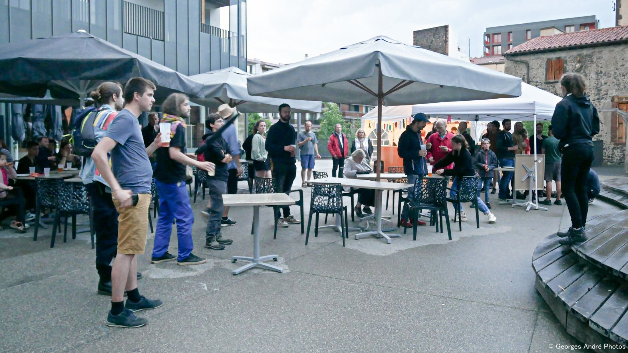 En ce samedi soir de juin, dès 19h30, place Louise-Bourgeois à Clermont-Ferrand, il était possible de déguster des tartines - dont une vegane - et boire au choix parmi des boissons sous un barnum comme de profiter du mobilier, tables, chaises et parasols, prêtés par la cave à vin de la place, fermée à cette heure. Cette place n'a pas été choisie par hasard, témoin d'événements festifs et revendicatifs nombreux. Elle réunit dans un petit périmètre le tiers-lieu « LieUtopie », l'Ecole d'art qui a massivement manifesté durant ce printemps en cortège-retraite et feue-la maison de la Résistance et de la Résilience d'avant Covid dont il ne reste qu'un écriteau sur une fenêtre rigoureusement clôturée.