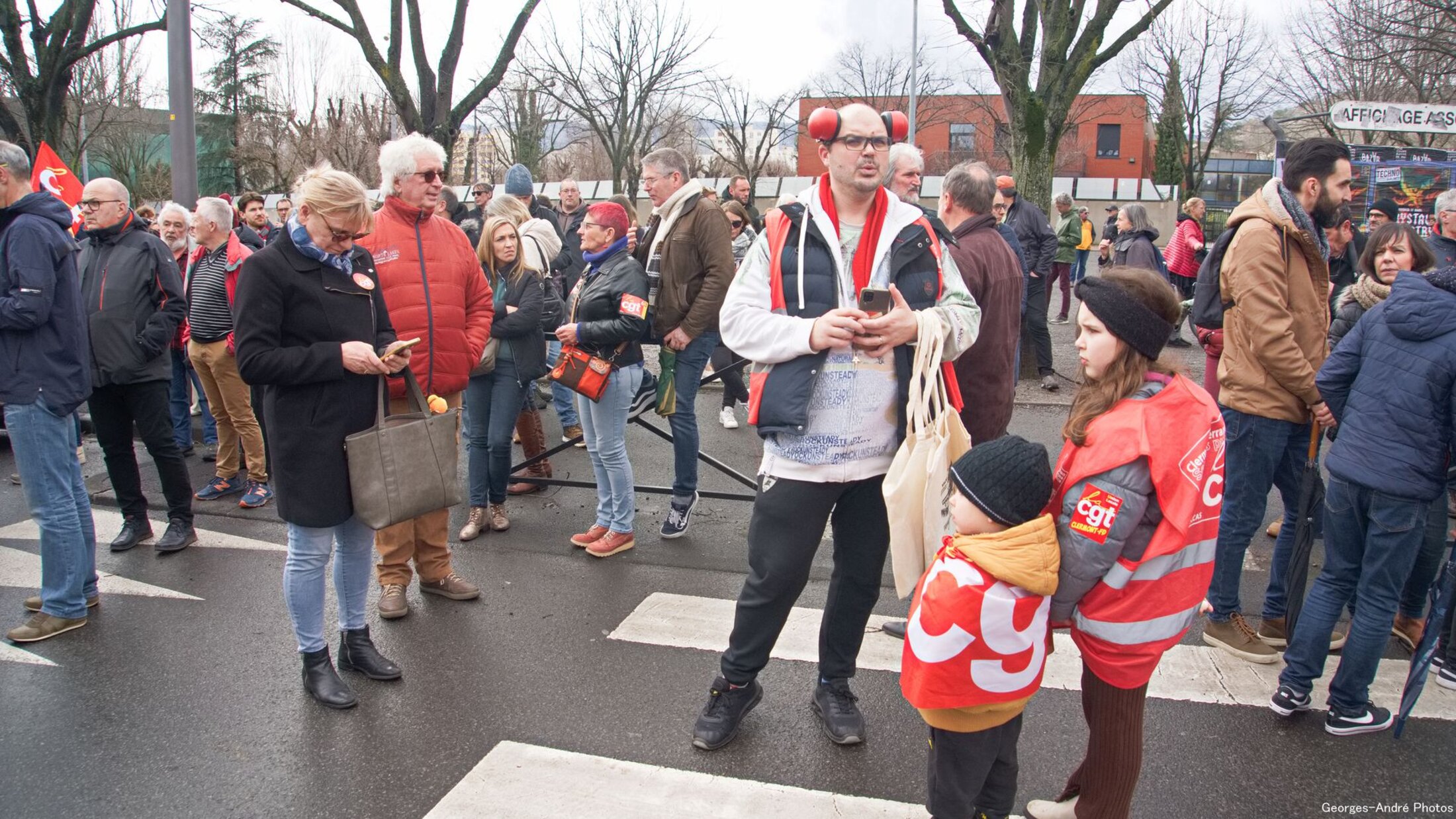 Pour cette 7ème manifestation contre la réforme des retraites à Clermont-Ferrand ce samedi 11 mars, le rassemblement de 5000 personnes a eu lieu sur la vaste place des Bughes, histoire de varier les itinéraires. Des manifestant·es qui ont fait parfois 3 ou 4 manifestations dans la semaine plus déterminé·es que jamais. Aucun abattement, aucun défaitisme dans les conversations malgré la possibilité non exclue d'un non-retrait. Chacun·e sent que la lutte ne s'arrêtera pas au vote de la loi. Certain·es lucides craignent une montée d'actes et de pratiques violentes face à ce mur de déni qui procède d'une double violence : violence déniée de ce texte par gouvernement et parlementaires qui le votent mais aussi par celle d'une procédure cadenassée, bridée par un exécutif aux pleins pouvoirs constitutionnels pour imposer un texte rejeté par l'immense majorité de la population et dicter sa loi à la Représentation Nationale avec l'assentiment des moutons.