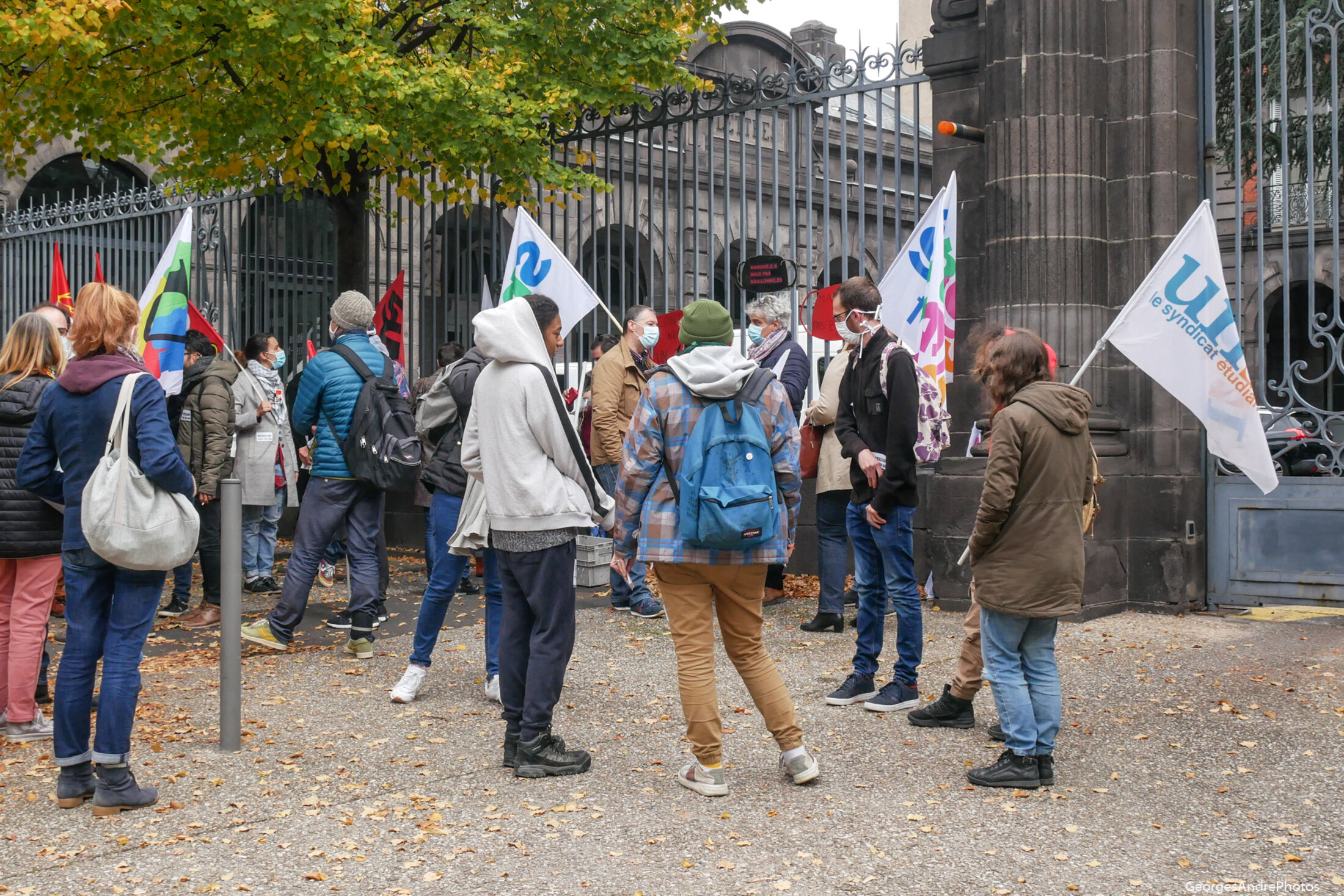 En soutien aux 4 de Melle, sous la menace des poursuites possibles sur Clermont-Ferrand suite à l'action syndicale du 18 janvier à Blaise-Pascal, une manifestation intersyndicale CGT Educ-action 63, SNES-FSU 63, Sud-éducation 63, SNALC Auvergne et UNEF Auvergne s'est déroulée devant le rectorat à 14h ce 14 octobre pour dénoncer la répression syndicale « partout à l'oeuvre ». Une délégation a été reçue au rectorat pour réclamer « l'abandon des plaintes et des menaces de procédures disciplinaires » contre ces responsables syndicaux. Les militants ont attendu avec peu de cris ou de slogans, mais dans un bruissement intense de conversations et d'échanges sur la situation, tous masqués. Une ambiance particulière de front commun et nécessairement solidaires.