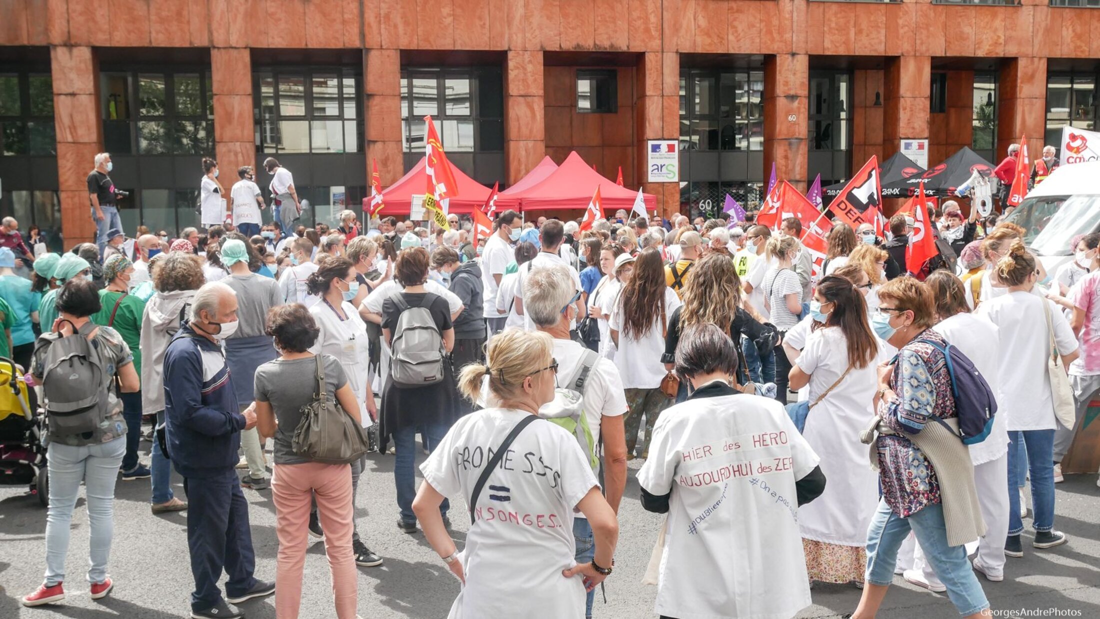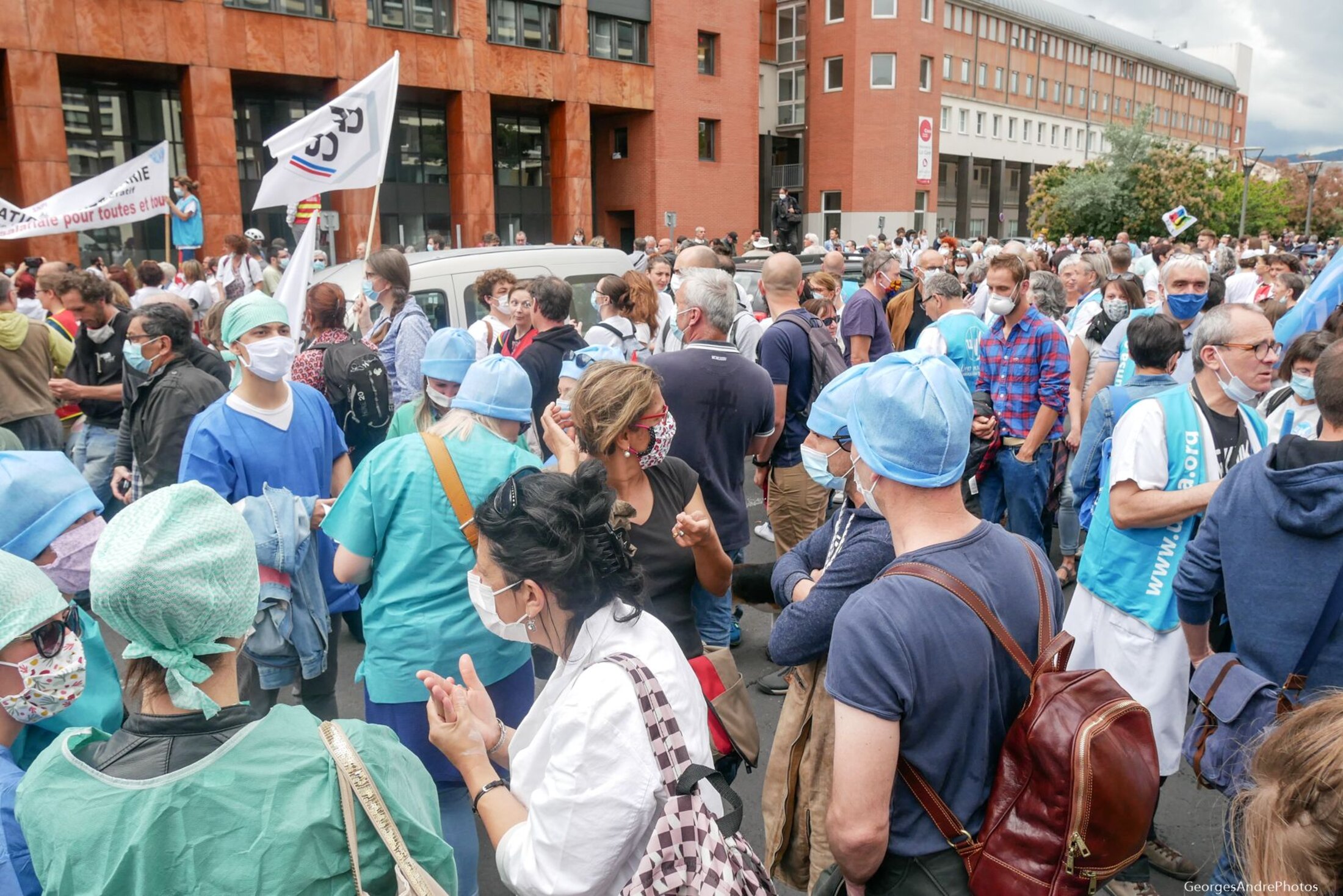 Sous la grande halle de l'entrée au CHU Estaing, peu à peu les soignants et autres personnels médico-sociaux ou associatifs se rassemblent avant le départ vers l'avenue de l'Union Soviétique, siège de l'ARS.