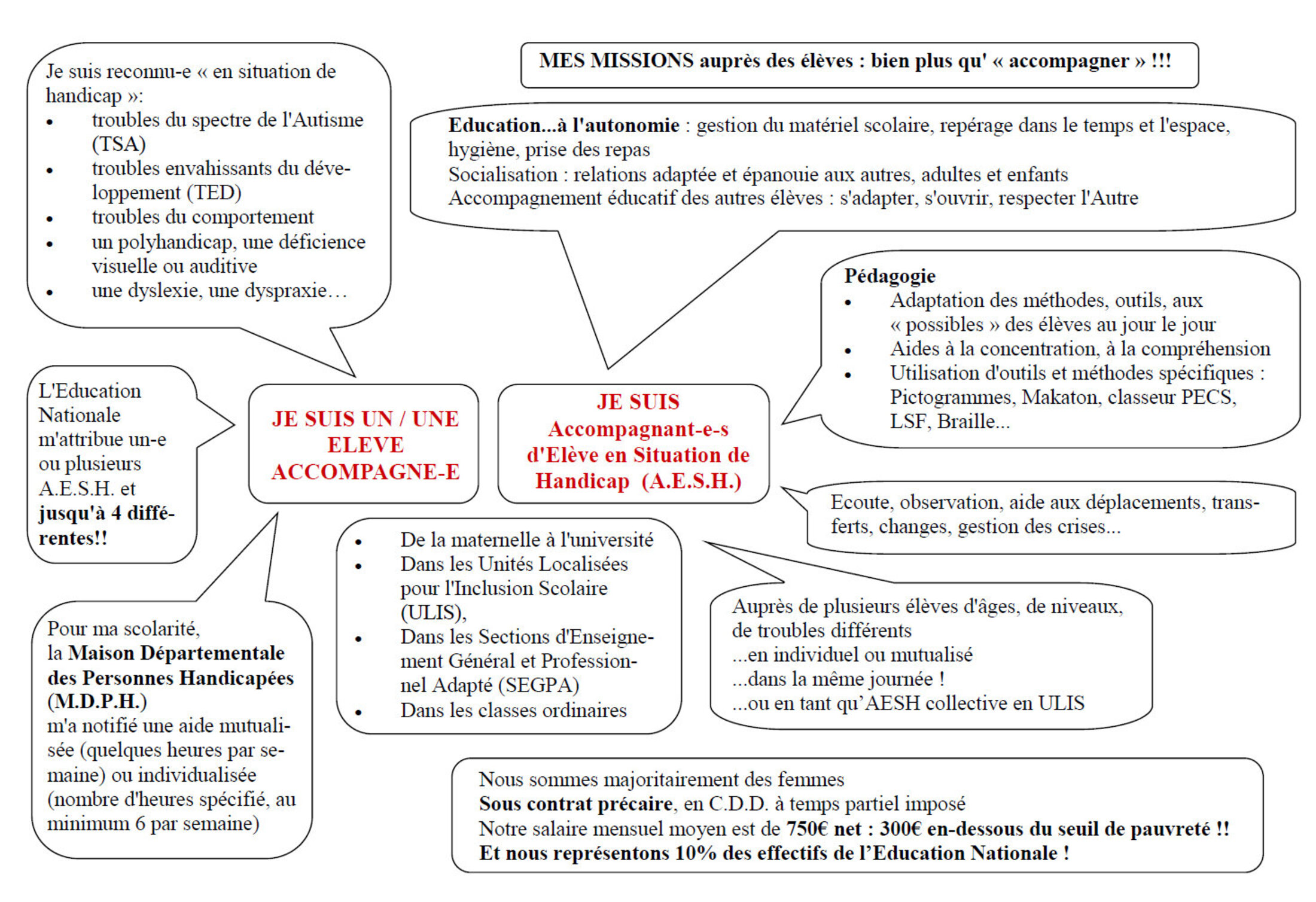 Les familles des centaines de milliers d'enfants inclus, les associations ne s'y trompent pas et sont solidaires. Il faudra que la Nation (et le pouvoir quel qu'il soit) sache enfin reconnaître la compétence acquise et nécessaire dans ces situations complexes, le professionnalisme de ces intervenantes et enfin, élever cet emploi au rang de profession (recrutement, formation, salaire) en milieu éducatif à égalité avec les auxiliaires médicaux de la santé.