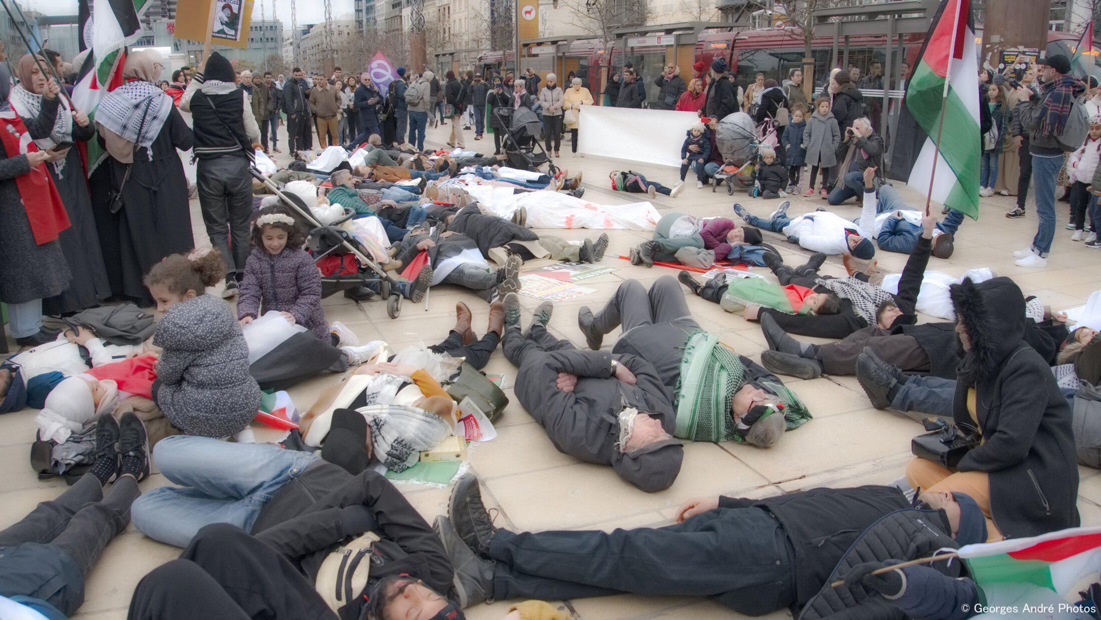 Ce collectif propose de frapper les esprits par un « die-in » : « vous allonger par terre pour symboliser toutes ces victimes décédées. Nous ferons une minute de silence, puis prendrons le temps de penser à chacune d’elle. Nous rendons hommage aux 70 180 blessés, aux 36 671 personnes assassinées, aux 6 000 enfants morts sous les décombres, aux 4 000 femmes tuées, aux 127 journalistes tués pour nous transmettre la vérité, aux 732 soignants pris pour cibles, aux 317 d’entre eux morts pour avoir voulu protéger des vies. »