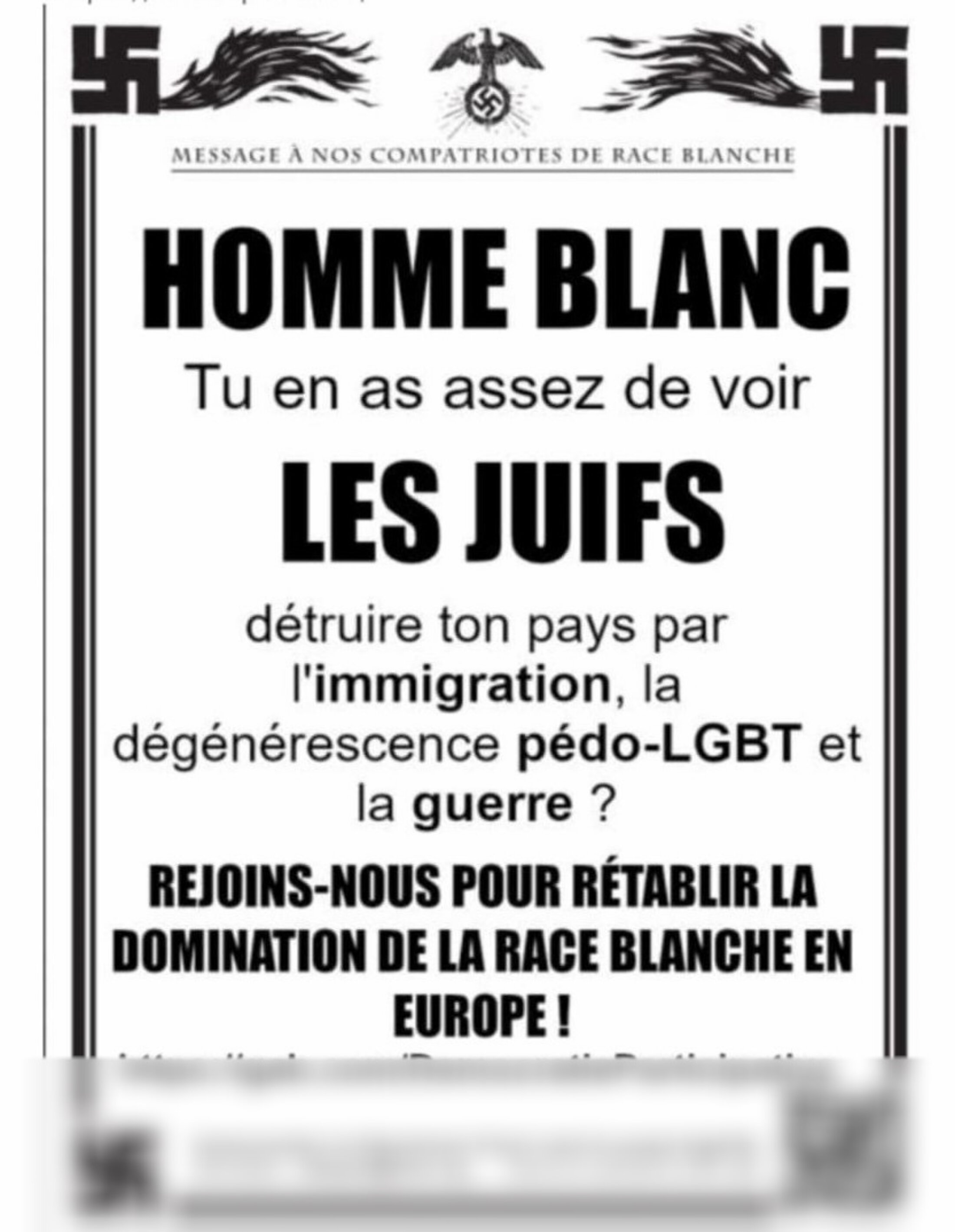 Tandis que l'extrême-droite désormais bicéphale (RN et Reconquête) caracole en haut des sondages pour les élections européennes de juin prochain, les groupes néo-nazis se livrent à toute sortes d'exactions dans la rue du plus grand nombre possibles de territoires, spécialement en Auvergne Rhône-Alpes. Clermont-Ferrand n'y échappe pas entre slogans racistes et anti-tout-ce-qui-n'est-pas-cisgenre, tagués sur les murs, intimidations, menaces, déambulation, collage, mel antisémite...