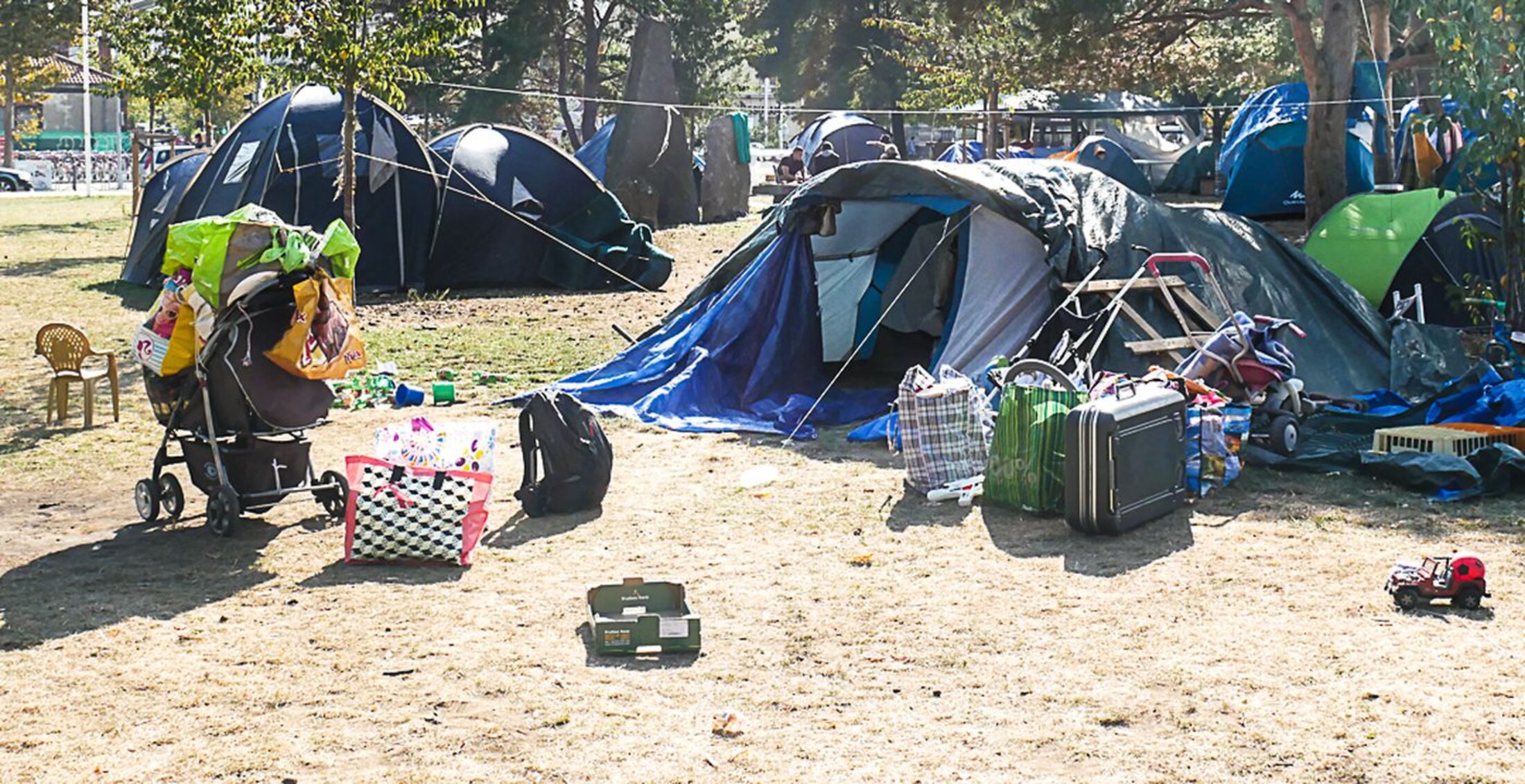 (2) Le Secours Populaire a apporté des tentes début septembre. La plupart viennent de bénévoles et d'une enseigne. Face caméra, une représentante de cette association s'est déclarée « ravie de l'endroit » (les nouveaux « hébergements » des migrants).