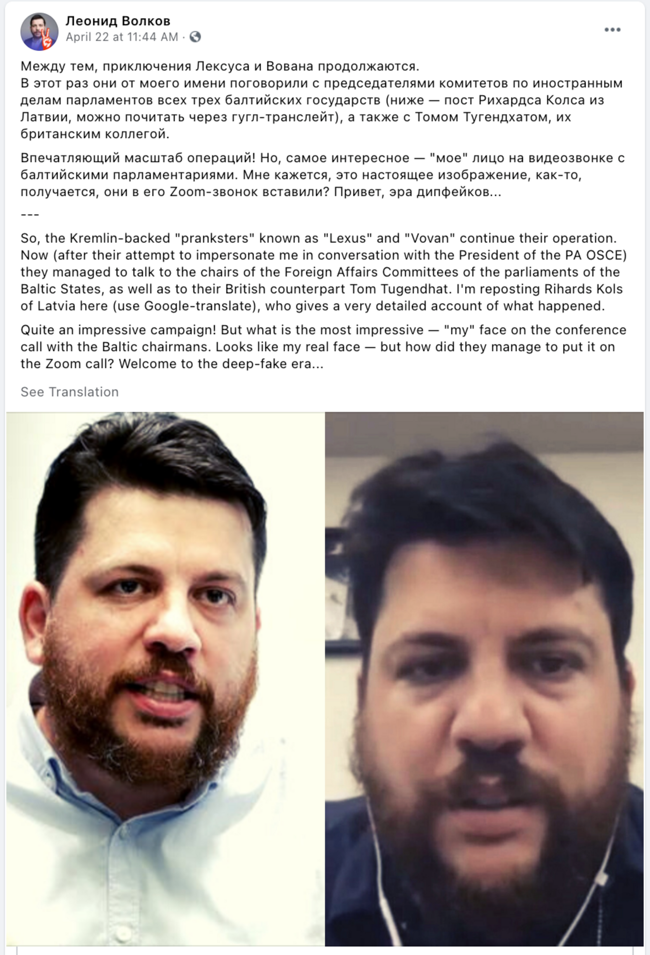 Passé les gros titres, le lecteur avisé décèlera rapidement la prudence des journalistes néerlandais qui couvrent cette affaire depuis quelques jours. Pour rappel, l’histoire se déroule entre mars et fin avril de cette année ou différents représentants de parlements européens (Lettonie, Lituanie, Estonie, Pays-Bas) affirment avoir eu une conversation avec un individu se faisant passer pour Leonid Volkov. La manipulation aurait été réalisée à l’aide d’un filtre Zoom, similaire à celui employé pour le filtre d’Elon Musk 1 qui a tant fait parler de lui à sa sortie.
