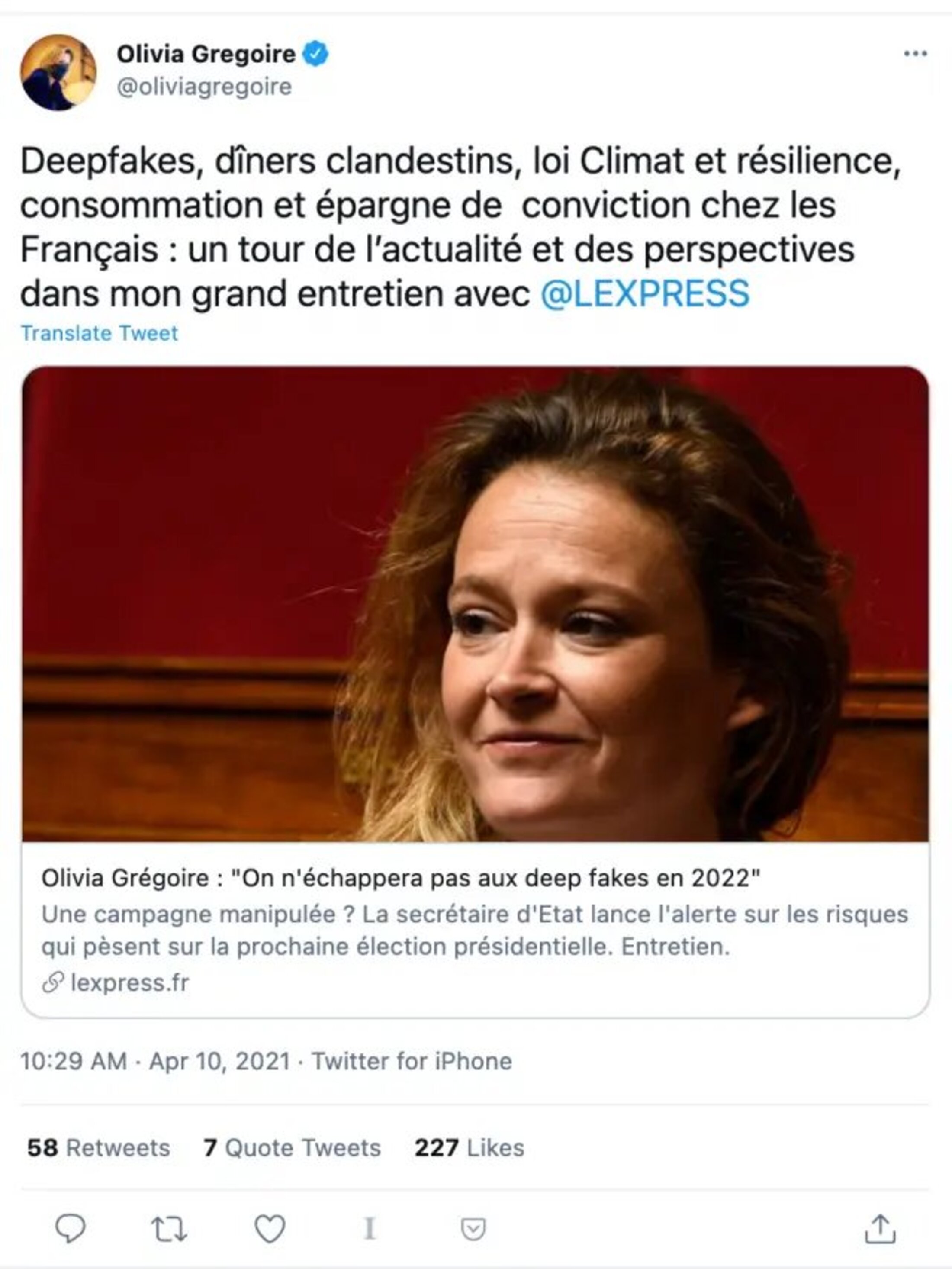 1. « Olivia Grégoire : “On n’échappera pas aux deepfakes en 2022”, L’Express, le 10 avril 2021
