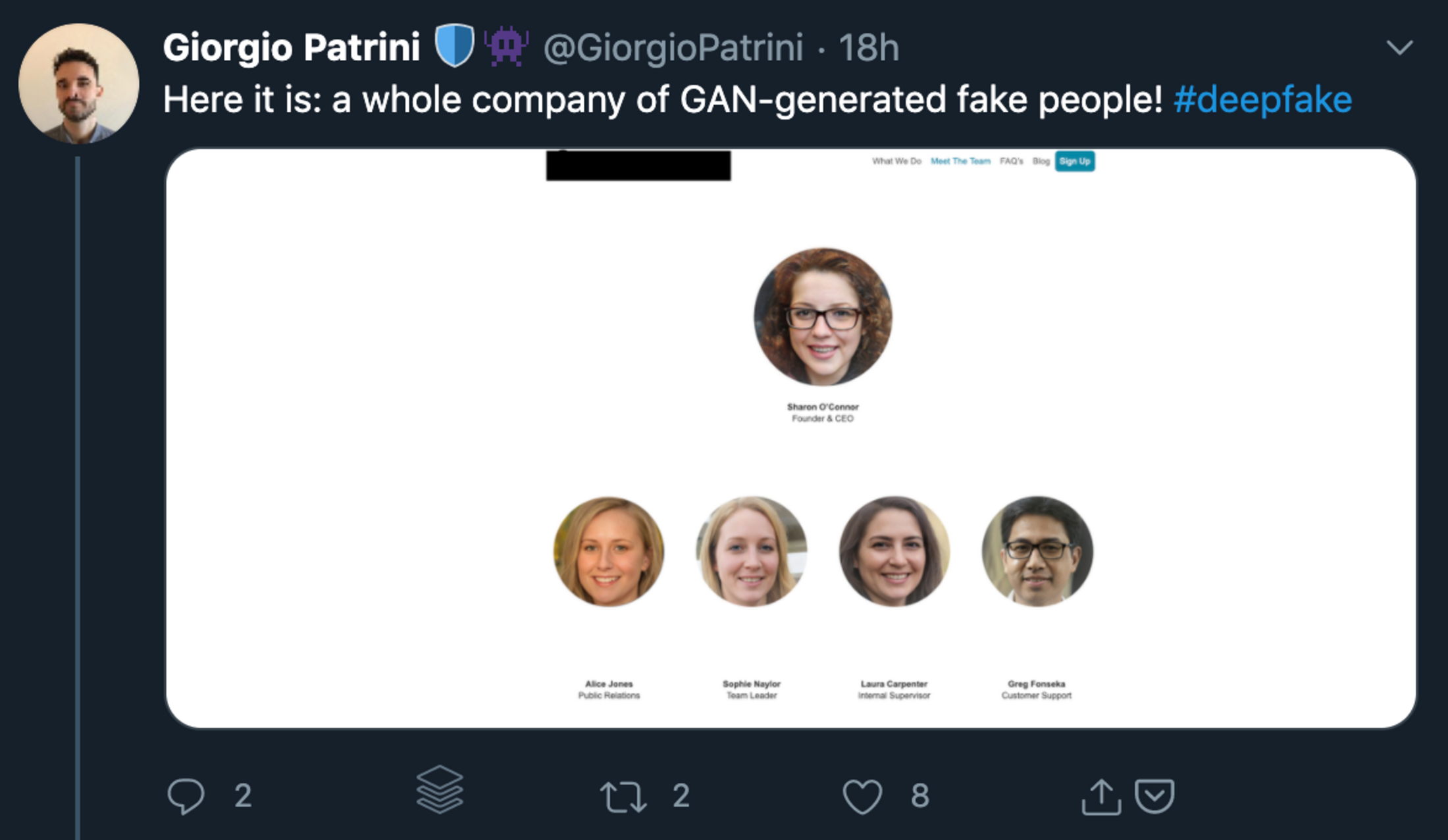 Dernière découverte en date, une entreprise entière dont les profils ont été générés artificiellement puis manipulés sur un service bon marché de retouche d'images. C’est Giorgio Patrini, le CEO de Deeptrace, une société spécialisée dans la détection de deepfakes, basée à Amsterdam, qui lève le lièvre.