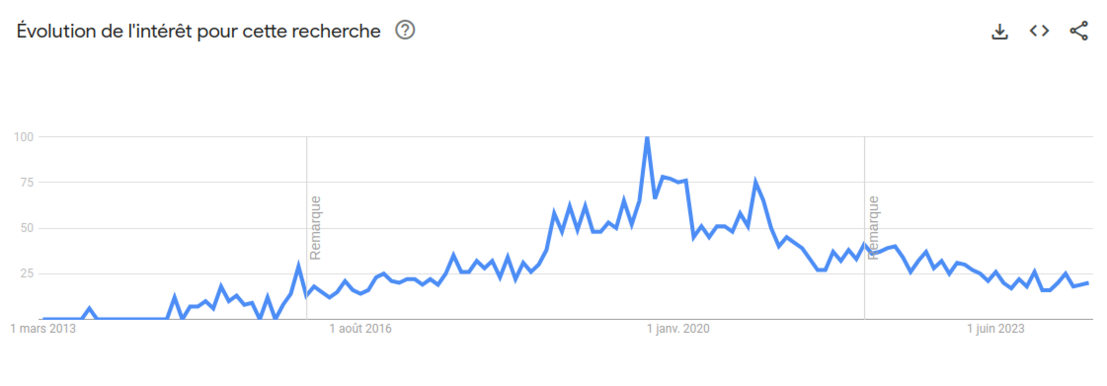 Sur les réseaux, quelqu’un demande ce qu’est devenu le mouvement zéro déchet. Et de fait, il a perdu sa nouveauté et intéresse moins. Si je n’en faisais pas partie, j’aurais peut-être moi aussi l’impression qu’il a disparu. Selon Google Trends, l’intérêt pour le terme “zéro déchet” augmente à partir de 2016 et atteint son pic en 2019 (données France). Depuis, les recherches pour ce mot-clé sont en baisse : elles sont même retombées au niveau de 2016. Le Covid-19 a durement touché le mouvement, et de nombreux commerces zéro déchet ont fermé (les épiceries vrac en particulier).
