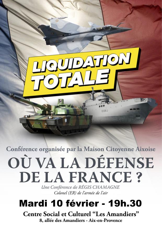 Le mardi 10 février 2015, la Maison Citoyenne Aixoise à Aix-En-Provence vous invite au Centre Social et Culturel « Les Amandiers », pour une conférence de Régis Chamagne, ancien Colonel de l’armée de l’air et pilote de chasse, d’abord dans la défense aérienne, puis dans la reconnaissance et enfin dans le bombardement sur Mirage 2000 D.
