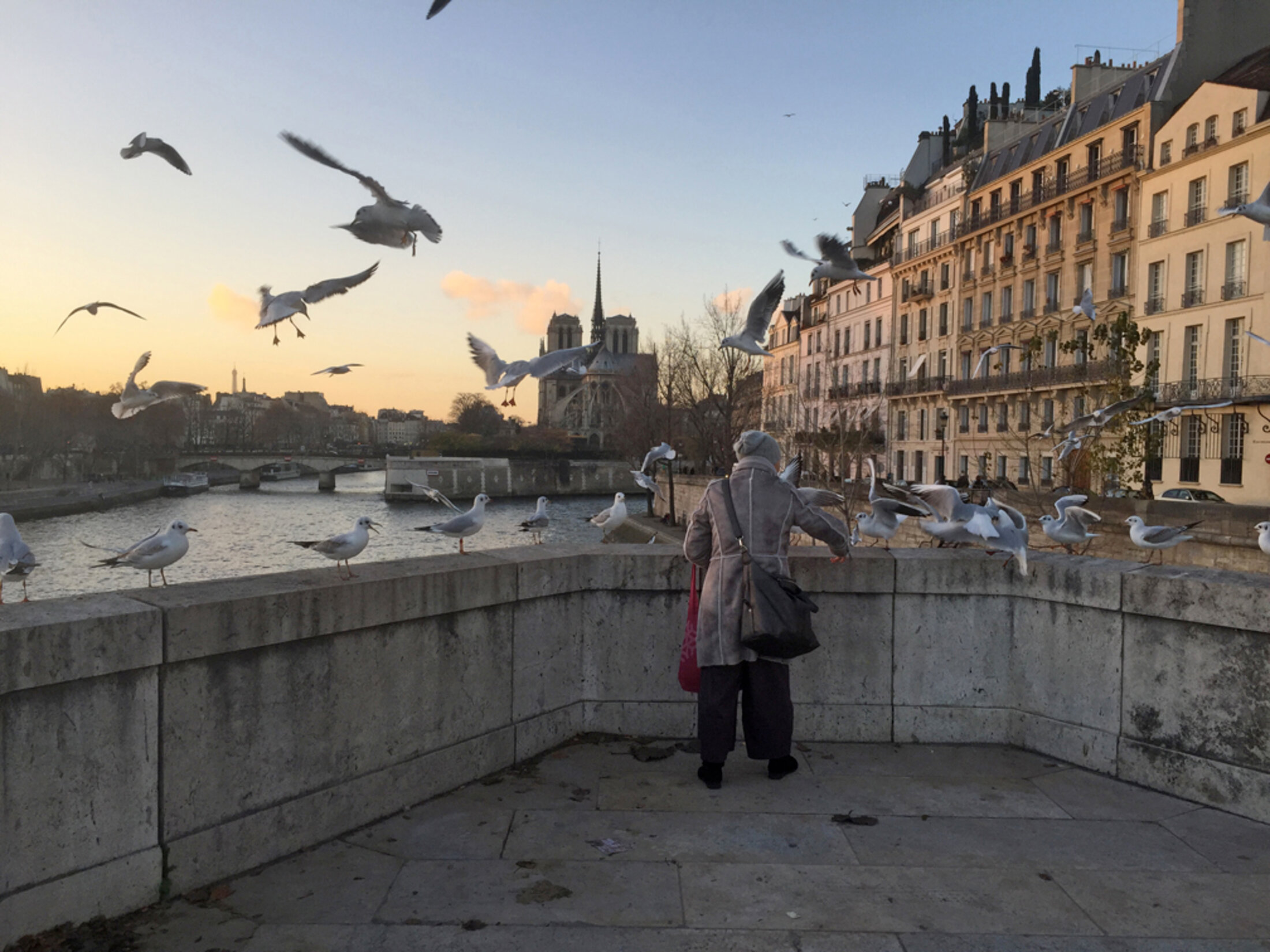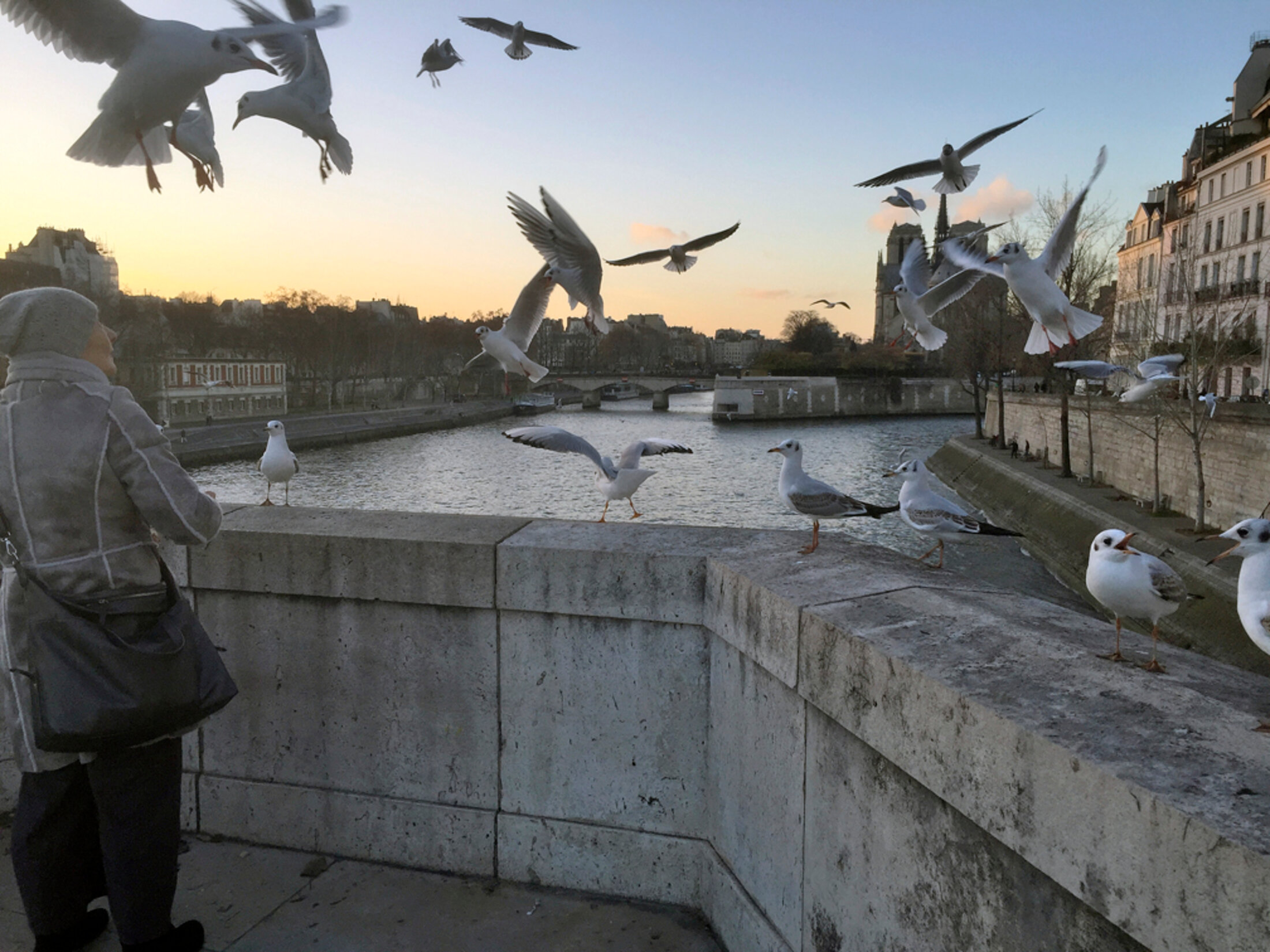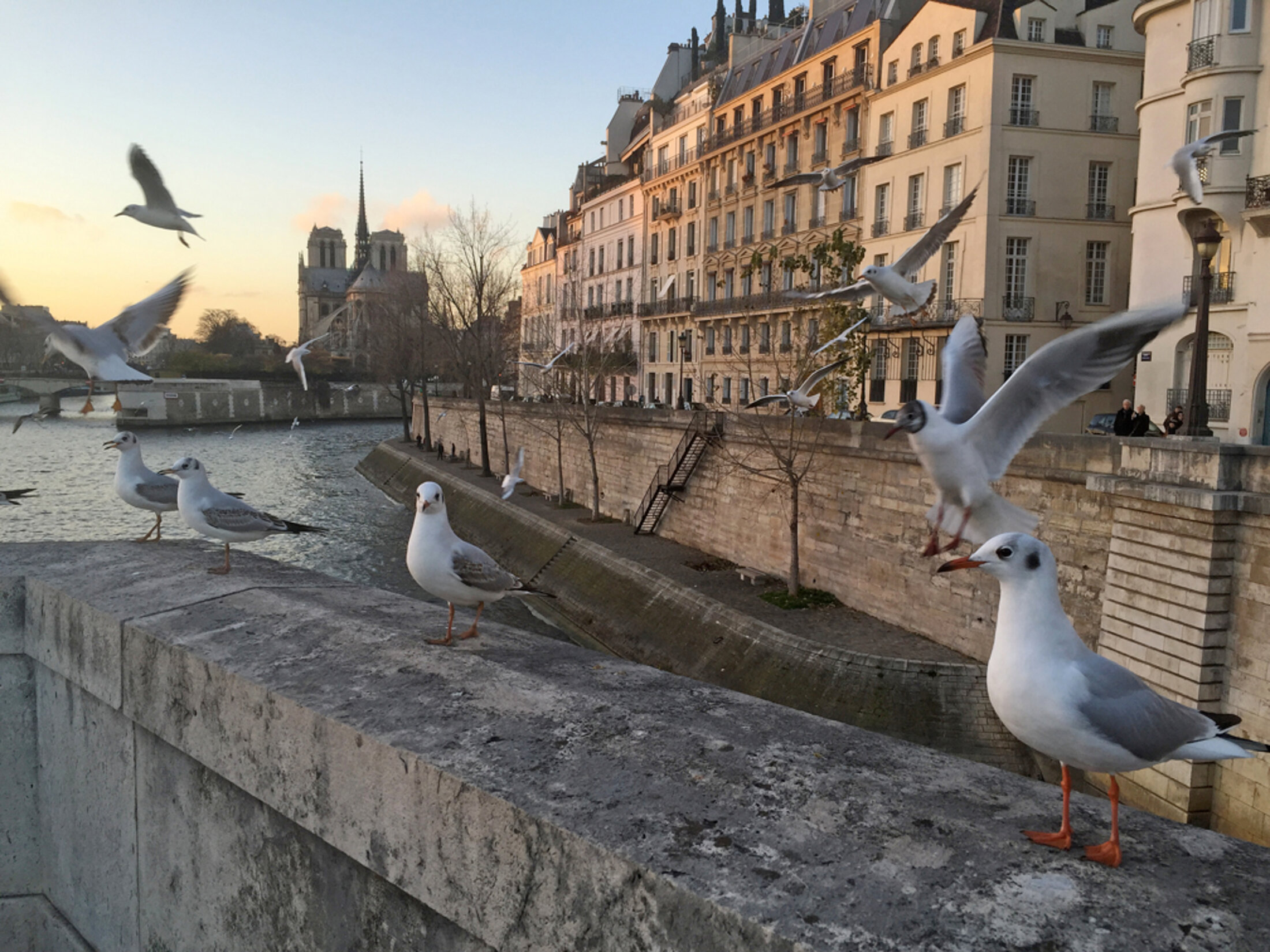 Je ne sais si les icebergs en fondant feront vite de Paris une ville littorale, baignée d'une onde fraîche. Je ne sais si les oiseaux de mer, écœurés de marées noires et de dégazages sauvages, se replient dans les centres urbains pour voler du poisson en bocal. Je ne sais si la folie du tourisme et des selfies devant Notre-Dame atteint aussi les animaux. Ou si le séjour est assez tempéré pour s'épargner de plus épuisantes migrations. Mais les mouettes, en automne, débarquent à la capitale. Le promeneur des rives de la Seine déambule le long des échoppes des bouquinistes dans une ambiance acoustique de plage normande. Cri mélancolique et lent vol plané dans le ciel par-dessus les toits ; virgules blanches rayant l'azur d'une clémente arrière-saison. Émergeant du métro à Pont-neuf, on est à Honfleur sur l'Île de la Cité.