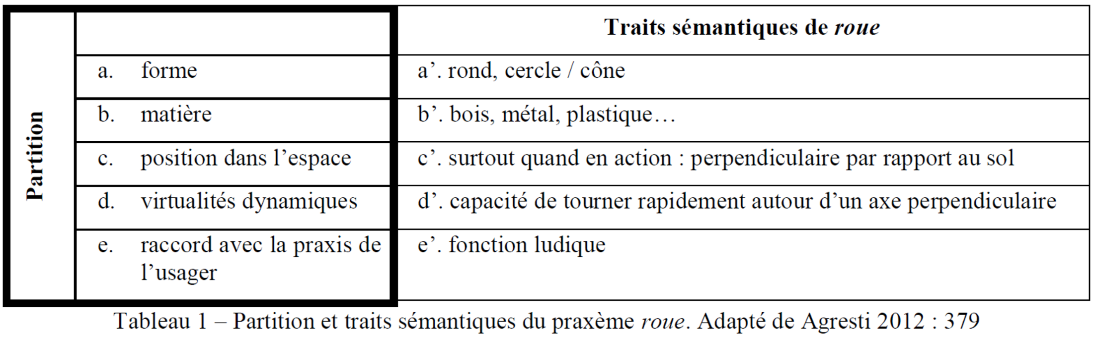 Or, ces traits sémantiques sont hiérarchisés dans la perception du sujet. Des tests (Agresti 2012 : 381-384) nous ont montré que c’est le trait d’) qui est celui qui, de loin, saisit le plus la perception de l’observateur lorsque celui-ci parle, voit ou pense une trottola. À partir de là, pour vérifier la motivation de ce praxème, il s’agit de vérifier la nature du lien existant entre les éléments consonantiques de la racine du signifiant (T+R+TT) et le(s) trait(s) sémantique(s) dominant(s) de l’objet, du signifié. Or, puisque la polyvibrante /r/ est « en phase » avec les « virtualités dynamiques » de la trottola, trait sémantique dominant, on peut en conclure que le praxème trottola est plutôt motivé, sans plus.