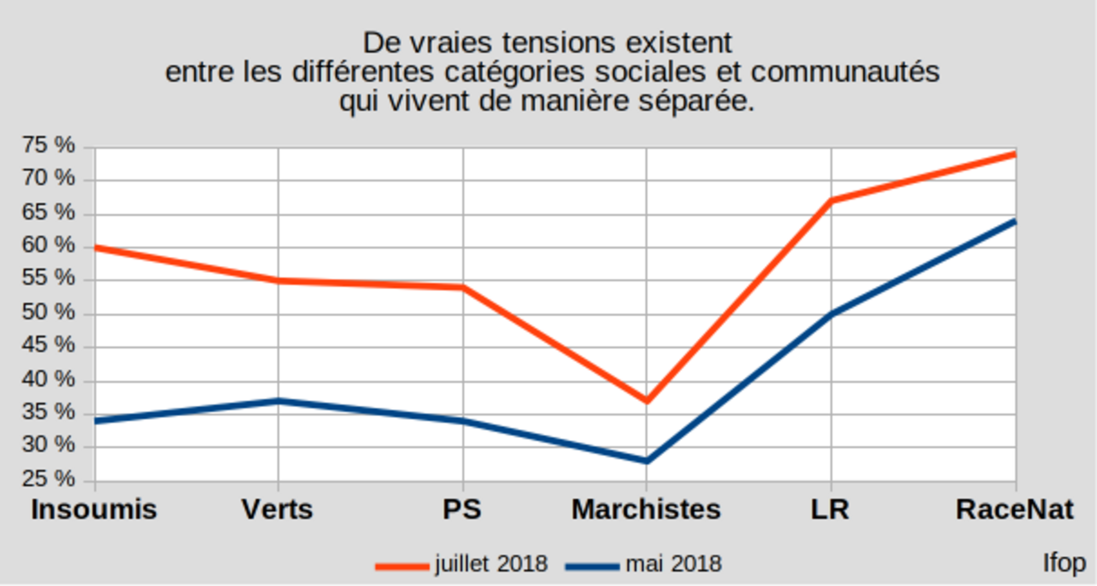 D'abord, il y a bien peu de français qui croient à une belle harmonie nationale, 7 à 8%. La stabilité sur ce chiffre laisse penser que ces deux enquêtes peuvent être comparées, et que les autres différences sont significatives. En seulement trois mois, le contexte de la coupe du monde n'a pas du tout éveillé la concorde mais la conscience des fractures. En mai, la moitié des sondés pensaient que les différences ne provoquent pas de tensions ; après la coupe du monde, ils ne sont plus qu'un tiers. De plus en plus de gens pensent qu'il y a « des tensions » entre les « communautés » et « catégories sociales ». Cette formulation prudente évite de marquer les différences politiques entre droite (communautarismes) et gauche (classes sociales). Pour la paix civile, il est même souhaitable que les fissures de la population restent confuses et nombreuses, afin de ne pas structurer les deux camps d'une guerre civile. Mais il semble bien que l'effet social le plus mesurable de la couple du monde, c'est une prise de conscience des tensions.