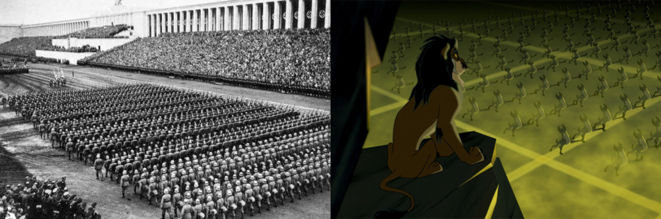A des fins similaires, le cinéma fut tout de suite perçu comme un outil de propagande des plus efficaces par Goebbels8 et instrumentalisé en particulier grâce à la réalisatrice officielle du troisième Reich : Leni Riefenstahl. La réalisatrice insufflera une grandiloquence divine et dominatrice dans sa mise en scène, en particulier dans Le triomphe de la volonté, qui inspirera esthétiquement de nombreux films comme Citizen Kane, Star Wars ou encore Le Roi Lion*. Dans son documentaire Les Dieux du Stade, elle développa des techniques inédites, encore aujourd’hui utilisées dans la mise en image des événements sportifs. Le cadrage en particulier s’inspirant des statues de dieux grecs et mettant en exergue le virilisme et la musculature des athlètes. Le cinéma de Propagande nazi façonnait une image divine du régime et de ses hommes.