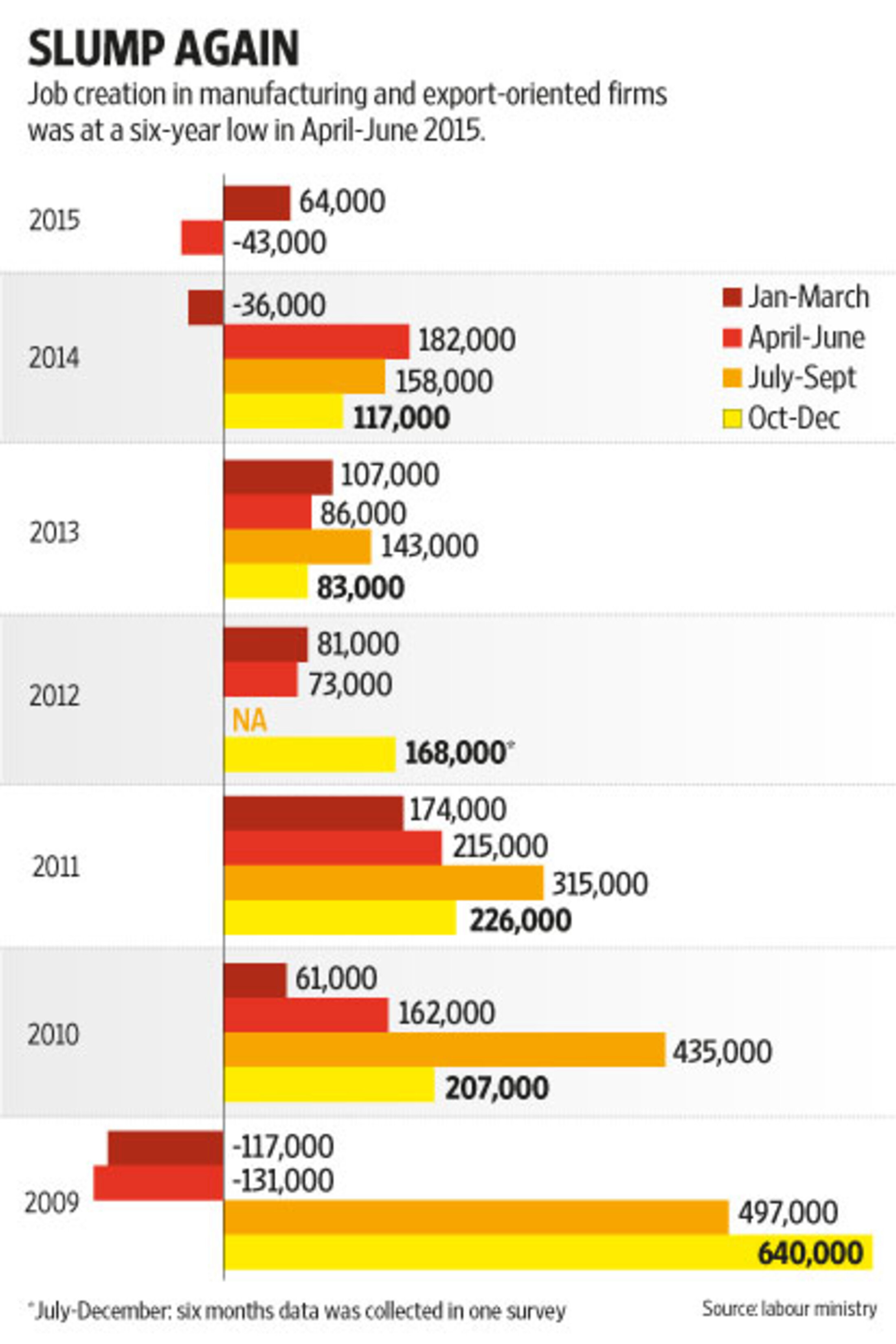 Près de deux ans après son arrivée au pouvoir, le représentant de la droite nationaliste hindoue est néanmoins en échec sur l’emploi. Durant les premiers mois de son mandat, les créations de postes ont doublé (+118%) dans les huit secteurs les plus dynamiques, tels que la métallurgie, les biens de consommation, le textile ou les transports. Mais globalement, 2014 a terminé au même niveau que 2013, avec 420.000 créations d'emplois, indique le ministère du travail. Et au premier semestre 2015, les créations ont été quasi nulles (21.000) pour un pays où 42 millions de personnes doivent entrer dans la vie active d'ici à 2020, selon les calculs de l’Organisation mondiale du travail, ce qui nécessiterait la création de 8,4 millions de postes chaque année.