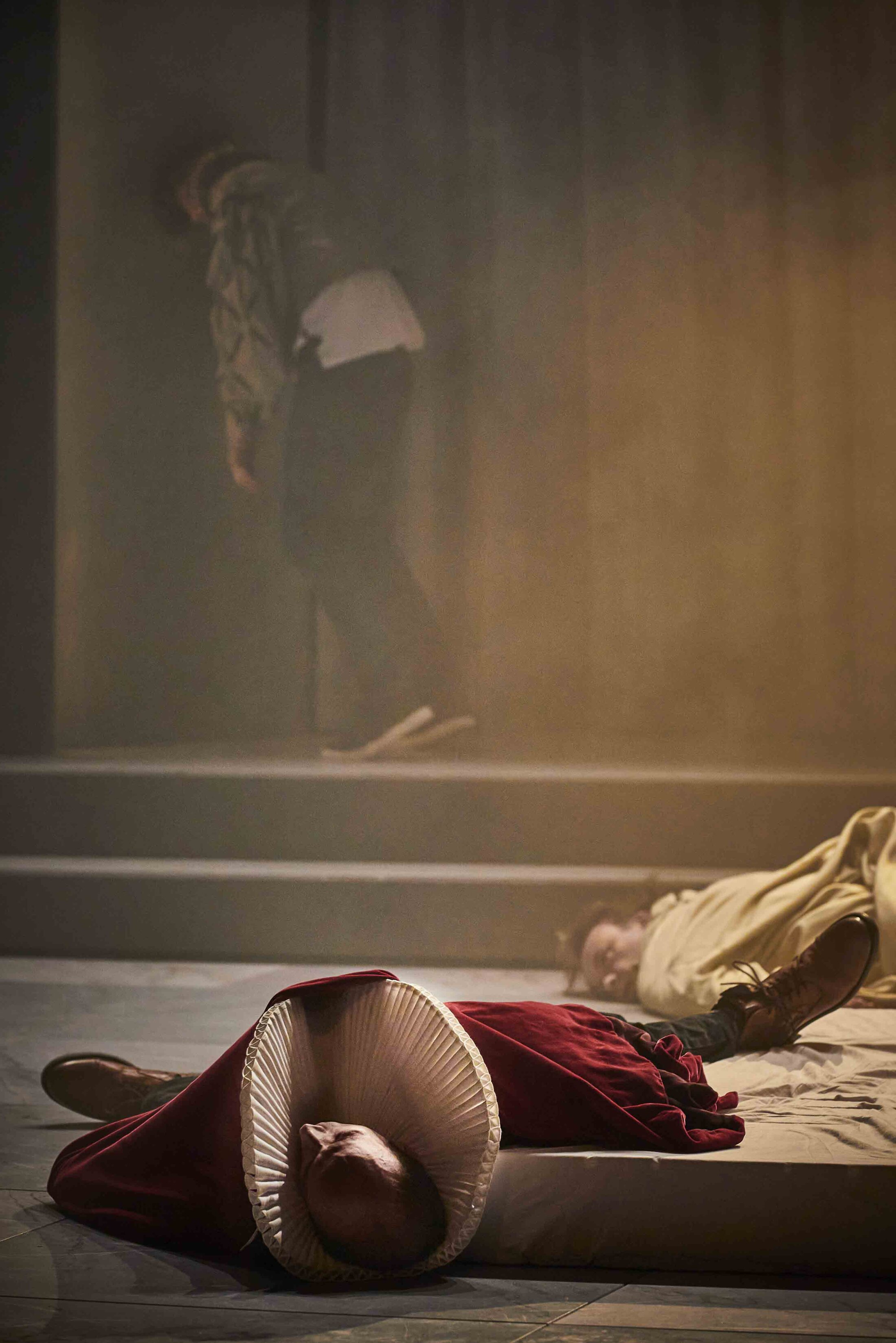 La pièce elle-même se divise en trois parties. Une première éminemment théâtrale enquête sur la question de la mort sur scène, du décès le plus naturel jusqu’au suicide en passant par le meurtre, d’Ibsen à Hugo, d’Euripide à Racine. Les comédiens expérimentent ainsi la quasi-totalité de la gamme des morts possibles. La deuxième partie prend place à l’hôpital, là où ont lieu quatre-vingts pour cent des décès en France aujourd’hui. Inspirés du film documentaire « Near Death[4] » de Fréderick Wiseman et de la somme des entretiens menés dans l’enquête initiale, mis en récits et en dialogue, les scènes sont autant de cas pratiques autour du droit des patients à décider de leur fin de vie. La dernière partie s’inspire du centre d’éthique clinique[5], lieu de conseil à la disposition des patients, de leurs proches et des équipes soignantes, en cas de difficulté éthique sur une décision médicale. Les outils de pensée qu’il développe sont en lien avec la pratique théâtrale mais également avec une partie de notre héritage philosophique. Ainsi voit-on Socrate, entouré de ses élèves tels que les imagine le peintre Jacques-Louis David dans son tableau de 1787, « La mort de Socrate », accusé d’impiété et de corruption de la jeunesse, accepter la sentence qui le condamne à mort, et boire volontairement la cigüe. Le théâtre s’envisage alors comme un lieu de consolation.