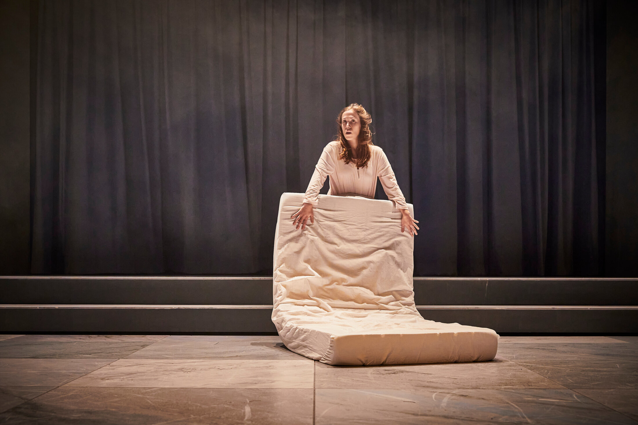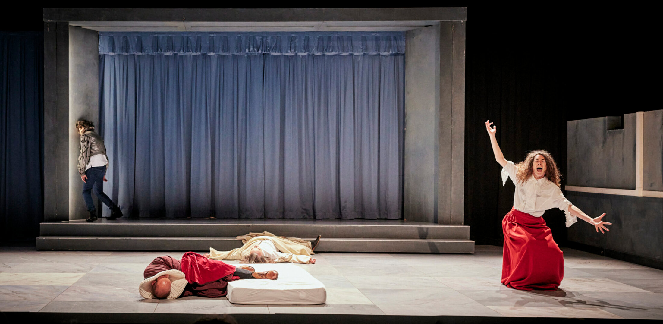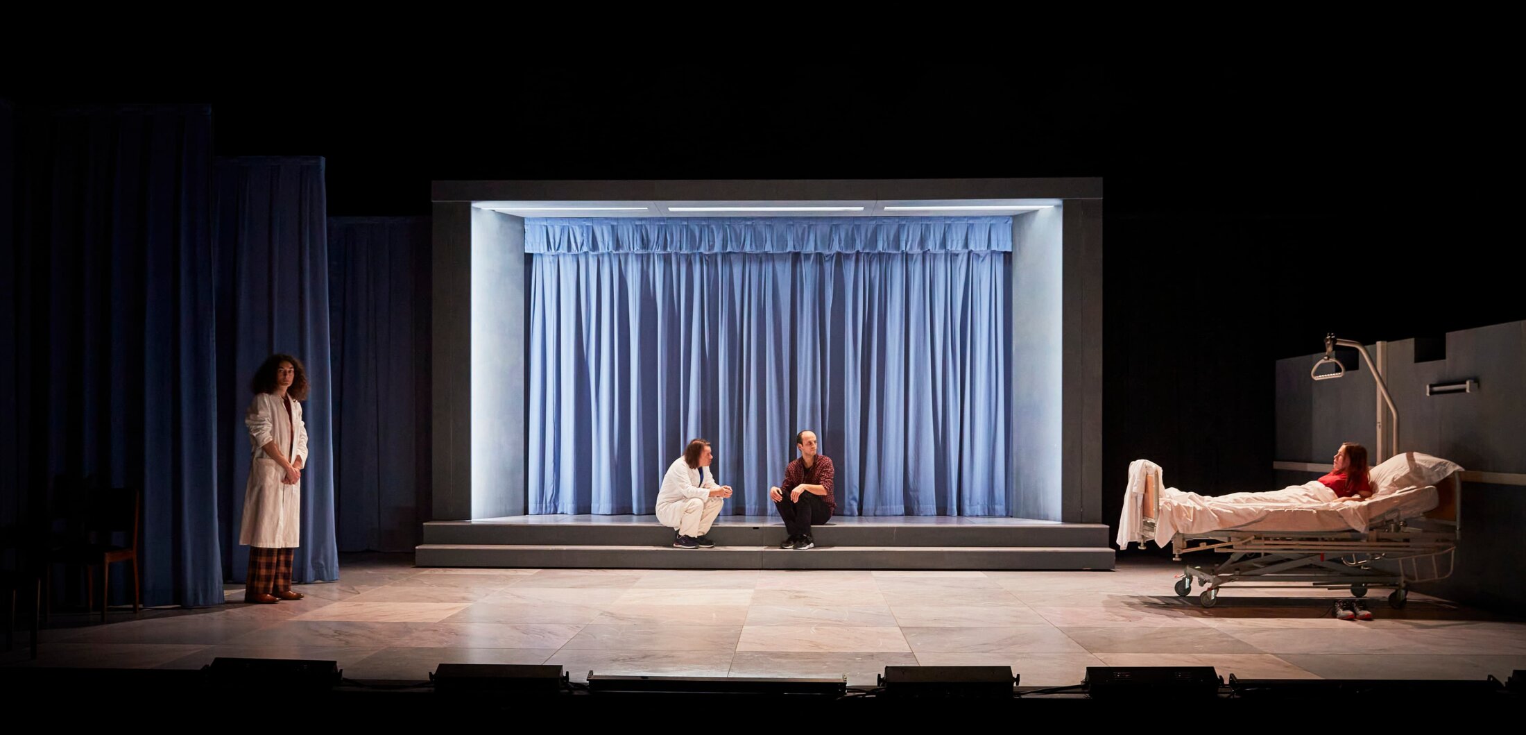 Sur scène, une autre scène, de carton-pâte celle-ci, fermée d’un épais rideau qu’une comédienne entrouvre de force en poussant un matelas qui, une fois installé à la place adéquate, va servir d’amortisseur aux acteurs qui tombent les uns après les autres dans un hommage aux scènes de morts théâtrales célèbres, souvent spectaculaires et finales, revisitées ici avec beaucoup d’humour comme pour dédramatiser ce moment qui, de toute façon, sera le nôtre un jour. Dans cette anthologie morbide mais néanmoins hilarante, les interprètes semblent rivaliser de trouvailles pour incarner le meilleur mourant, quitte à parfois agoniser longtemps, dans des râles aux variations gutturales infinies, avant de s’entretuer dans une joyeuse foire d’empoigne. Le théâtre, « lieu de la plus grande illusion », peut jouer et rejouer la mort à foison. Après cette tentative de réhabiliter la mort en quelque sorte, de la replacer dans la vie à laquelle elle est intrinsèquement liée via le répertoire théâtral, « À la vie ! » se déplace vers une écriture documentaire élaborée à partir d’une enquête en milieu hospitalier et au centre d’éthique clinique à Paris. La pièce met ainsi en jeu à la fois les questions de représentation et les grandes interrogations éthiques et légales qu’engendrent la fin de vie au moment même où en France le sujet est débattu à l’Assemblée nationale. Un simple lit que l’on déplace et replace suffit à faire prendre des allures d’hôpital au plateau pour donner à voir, à travers un enchainement de scénettes qui sont autant de cas singuliers, le quotidien d’un service confronté à la fin de vie sous quelque forme que ce soit. Si la vie est un combat, en choisir la fin lorsqu’elle devient inéluctable devrait être un droit universel.