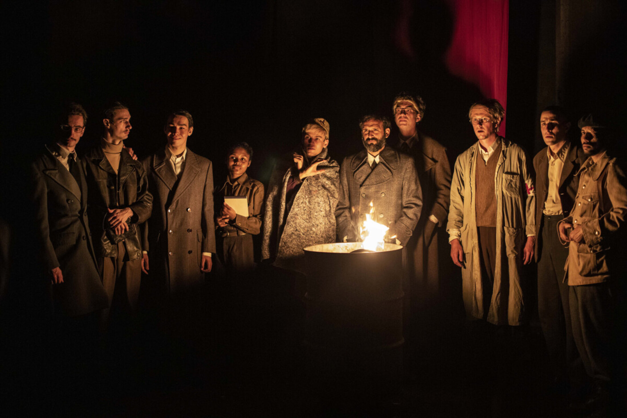 Pendant que des tranches de livres posées sur les étagères d’une bibliothèque sont projetées en vidéo sur le voile noir devenu écran, symbolisant l’autodafé à venir, « le narrateur » quitte l’Allemagne et ses parents pour rejoindre l’Espagne alors en pleine guerre civile et s’engager dans les Brigades internationales. Il sera infirmier à l’arrière des lignes républicaines, avant de gagner la France et Paris où, dans les bas-fonds d’un club pour noctambules dénommé « désespoir », il fera la rencontre d’Otto Katz – époustouflante Charlotte Issaly –, espion antinazi que l’on loue autant que l’on craint, ayant le pouvoir de faire apparaitre les morts et qui se confond ici avec une figure queer que l’on croirait plutôt issue d’un « kabarett » berlinois du temps de la République de Weimar. Envoyé en Suède par Katz, il est petit porteur de valises au côté des membres du parti communiste allemand en exil. Bientôt, à Stockholm, il rencontrera Bertolt Brecht, lui aussi en exil, répétant sa nouvelle pièce : « Mère Courage ». Il envoie Charlotte Bischoff, l’une des comédiennes de Brecht, à Berlin en tant qu’agent de liaison auprès des membres du réseau international de l’Orchestre rouge. Tout au long de ses pérégrinations, le « narrateur » pose la question – utopique – d’une possible union communiste.