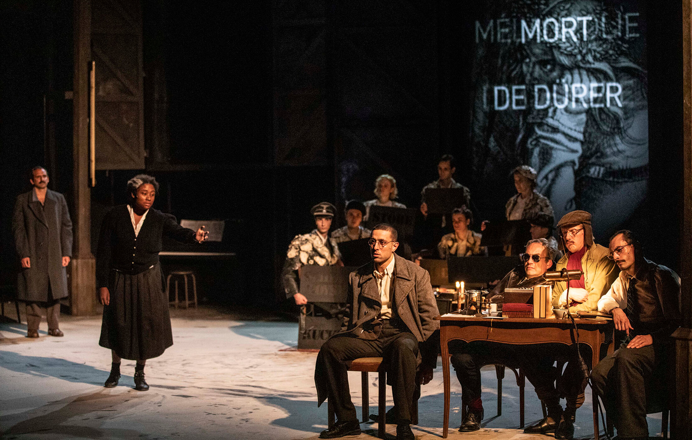 « L'ESTHÉTIQUE DE LA RÉSISTANCE » - d’après le roman de Peter Weiss, adaptation et mise en scène Sylvain Creuzevault, avec Juliette Bialek (Hélène Weigel, Ilse Stöbe), Yanis Bouferrache (Horst Heilmann, Svård, un acteur de Brecht), Gabriel Dahmani (le narrateur), Valérie Dréville (la mère de Hans Coppi, Ruth Berlau, Mildred Harnack), Vladislav Galard (Peter Weiss, Willi Münzenberg, Richard Stahlmann), Pierre-Félix Gravière (Jacques Ayschmann, Arvid Harnack, un acteur de Brecht), Arthur Igual (le père du narrateur, José Díaz Ramos, Bertolt Brecht, Kurt Schumacher), Charlotte Issaly (Marcauer, Otto Katz, Margarete Steffin, Karin Boye, Libertas Schulze-Boyzen), Simon Kretchkoff (Hans Coppi, un acteur de Brecht), Frédéric Noaille (Max Hodann, Jakob Rosner, Wilhelm Vauck), Vincent Pacaud (un·e associé·e de Katz, un acteur de Brecht, Herbert Wehner, Adam Kuckhoff), Naïsha Randrianasolo (la mère du narrateur, une actrice de Brecht, Anna Krauss), Lucie Rouxel (Charlotte Bischoff, une actrice de Brecht), Thomas Stachorsky (Nordahl Grieg, Maurice Chevalier, Haro Schulze-Boyzen, Harold Poelchau), Manon Xardel (un·e associé·e de Katz, Lise Lindbæk, Rosalinde von Ossietzky, Elisabeth Schumacher), scénographie et accessoires Loïse Beauseigneur Valentine Lê, costumes, maquillage et masques Sarah Barzic Jeanne Daniel-Nguyen, maquillage et perruques Mityl Brimeur, lumière Charlotte Moussié, en complicité avec Vyara Stefanova, musique originale Loïc Waridel Pierre-Yves Macé, machinerie Léa Bonhomme, vidéo Simon Anquetil, dramaturgie Julien Vella, assistanat à la mise en scène Ivan Marquez. Créé le 23 mai 2023 au Théâtre national de Strasbourg, production Théâtre national de Strasbourg coproduction et production déléguée Le Singe, avec la participation artistique du Jeune théâtre national, avec le soutien du Théâtre des 13 vents centre dramatique national de Montpellier, de Bonlieu scène nationale d’Annecy, de la MC93 Maison de la culture de Seine Saint- Denis, du Théâtre national de Strasbourg et de l’Odéon-Théâtre de l’Europe pour la reprise du spectacle en tournée, la compagnie Le Singe est soutenue par le ministère de la culture / Direction régionale des affaires culturelles d’Île-de-France et la région Île-de-France. Spectacle vu le 1er mars 2025 à l'Odéon - Théâtre d l'Europe.