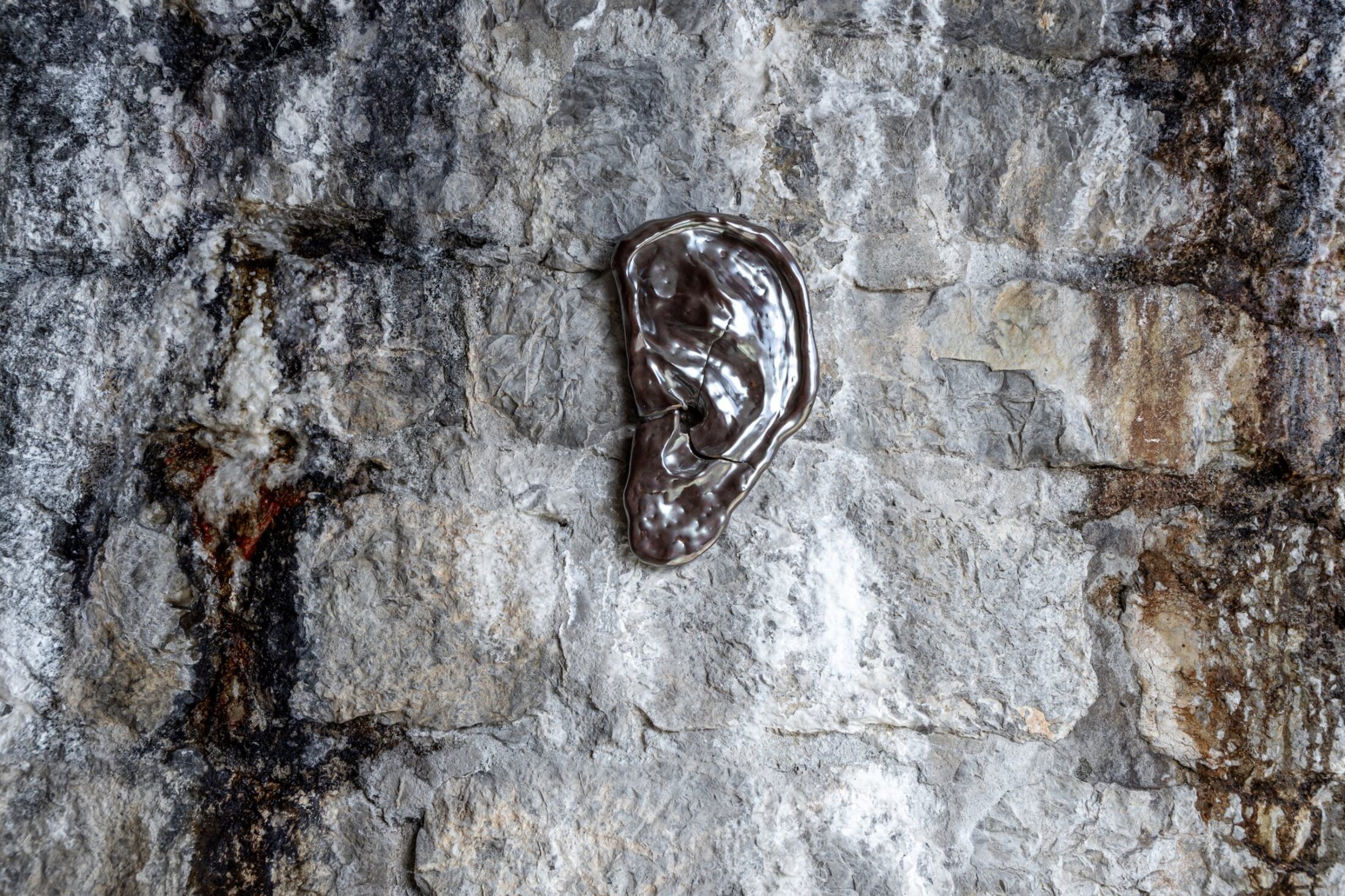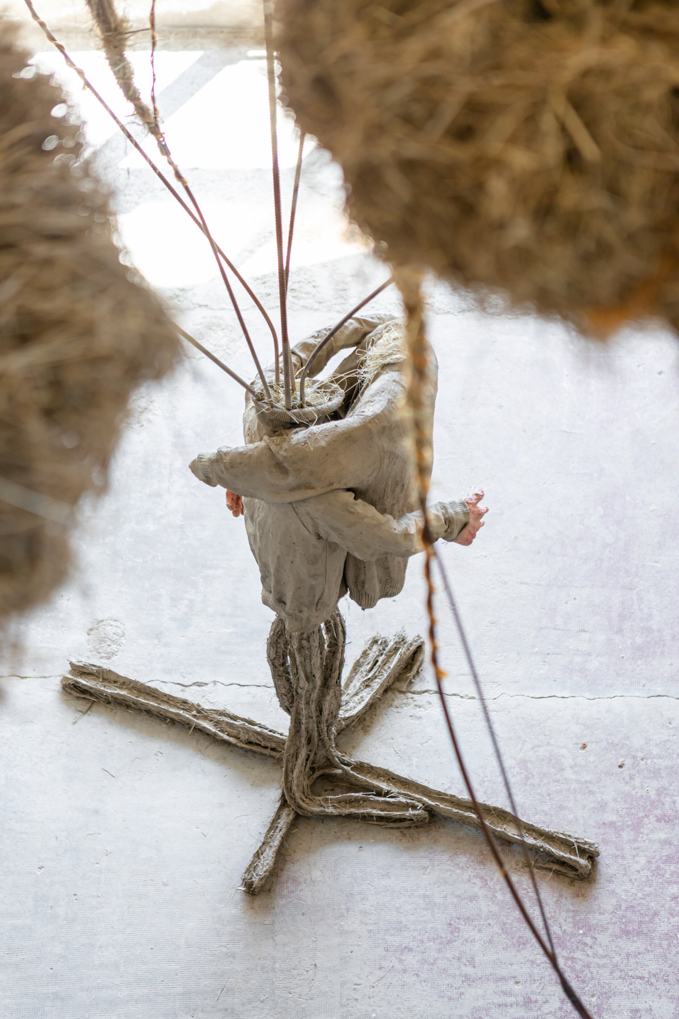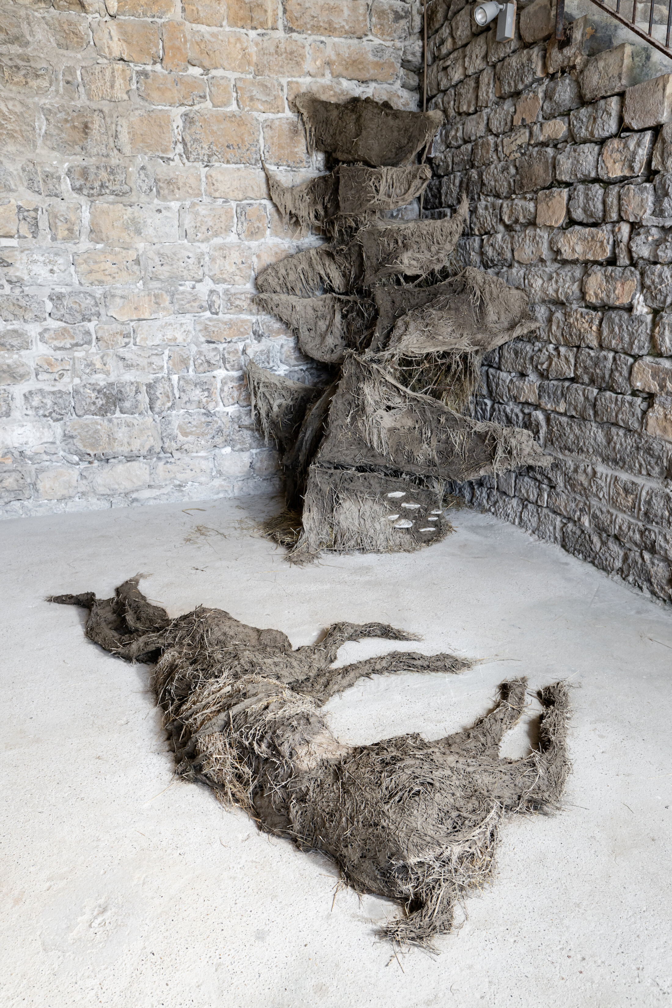 L’exposition s’articule autour de quatre axes – deuil, isolement, folie, tabou – qui ne sont jamais abordés de manière littérale, mais suggérés par des textures, des silences et des présences. Ferruel & Guédon poursuivent leur exploration sonore par le biais intime de la parole abordée pour la première fois lors de l’exposition « Nouaison » en 2023. Un son de rivière, subtil mais omniprésent, tisse un fil conducteur à travers l’espace. L’exposition est ainsi bercée par l’eau, le fond de rivière amenant tout doucement à une sinuosité. Deux installations sonores composées de témoignages recueillis auprès de proches des artistes – agriculteurs, artisans, membres de leur communauté rurale –, donnent voix à des récits de perte, de solitude, mais aussi de solidarité. Ces bribes de paroles, parfois à peine audibles, s’écoutent derrière les portes, à l’abri de la honte. Elles évoquent la transmission intergénérationnelle, un thème cher au duo, qui ancre son travail dans une mémoire collective tout en le projetant vers l’avenir. Les deux pistes sonores servent à construire un espace de confiance, et même de bienveillance. Une sculpture en torchis, matériau vivant et friable, incarne cette fragilité des liens humains : ses contours irréguliers, prêts à s’effriter, semblent pourtant défier le temps, comme une métaphore de l’amitié elle-même, toujours en devenir. La bande sonore qui s’échappe de son antre est composée du témoignage d’une voisine de Florentine qui raconte le moment de bascule vers la folie. Comme une mort lente ou extase, un moment mystique. La sculpture rappelle la forme d’une colonne vertébrale.