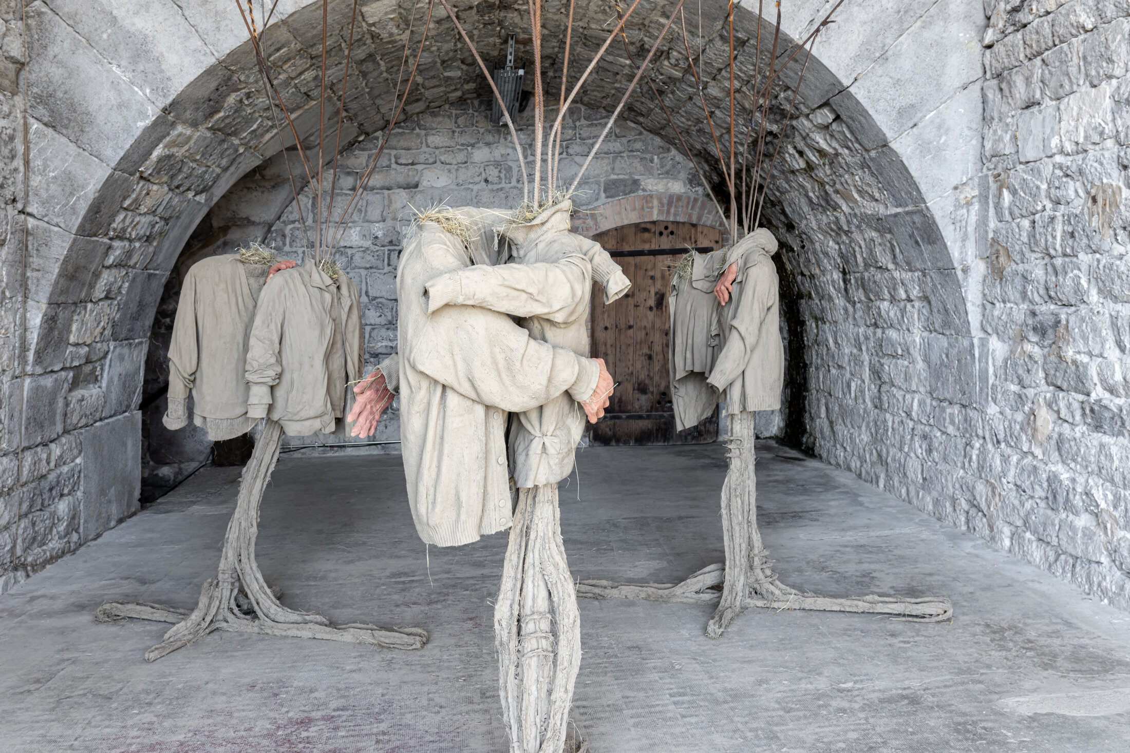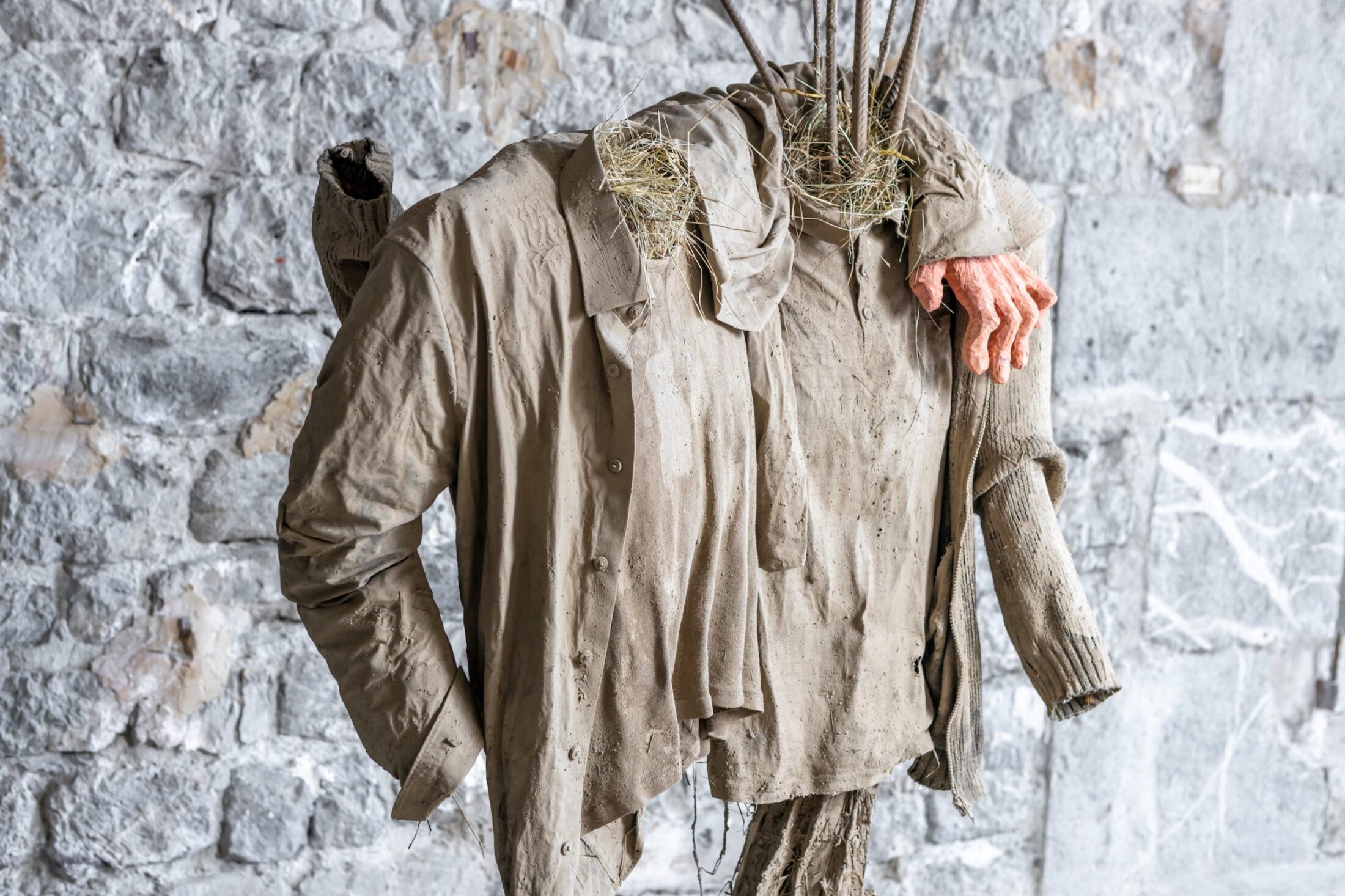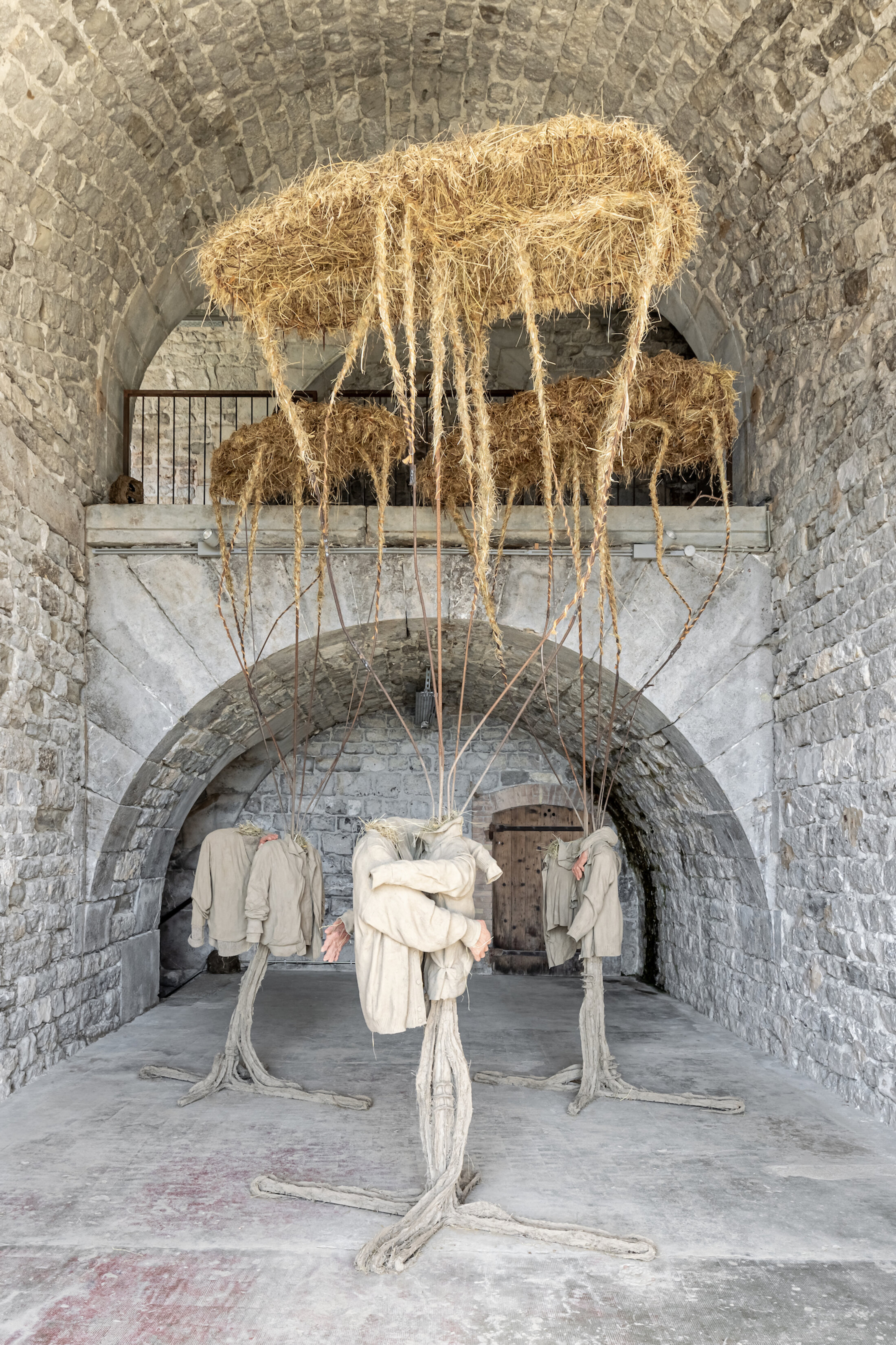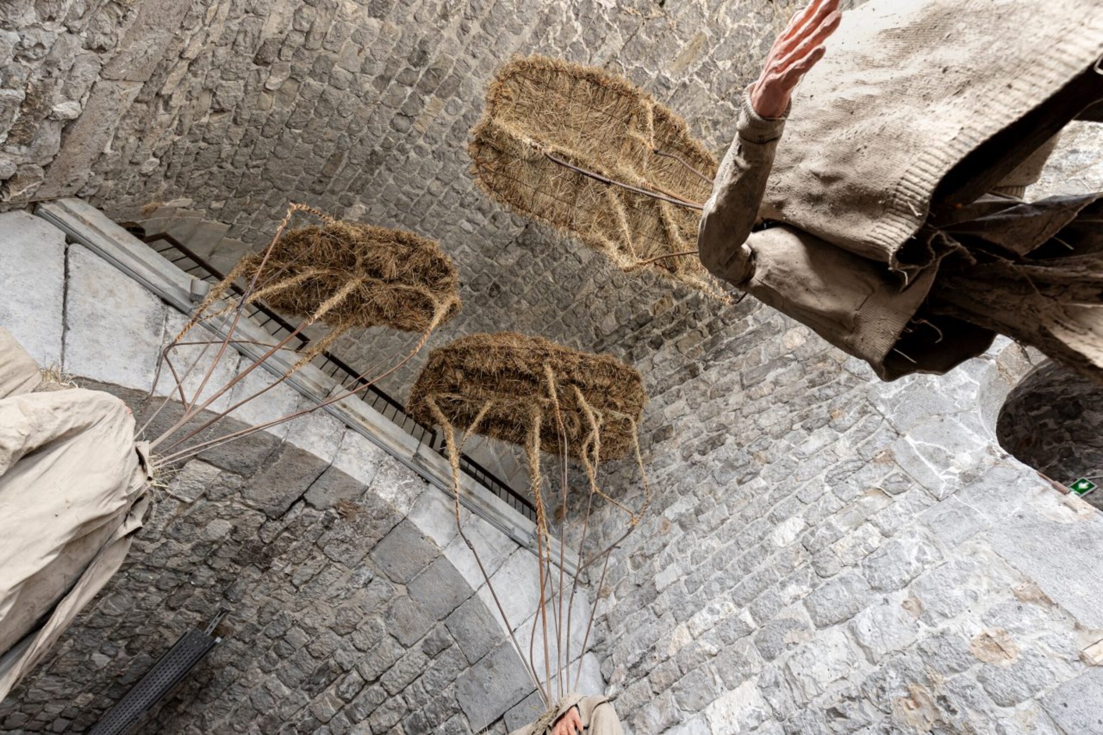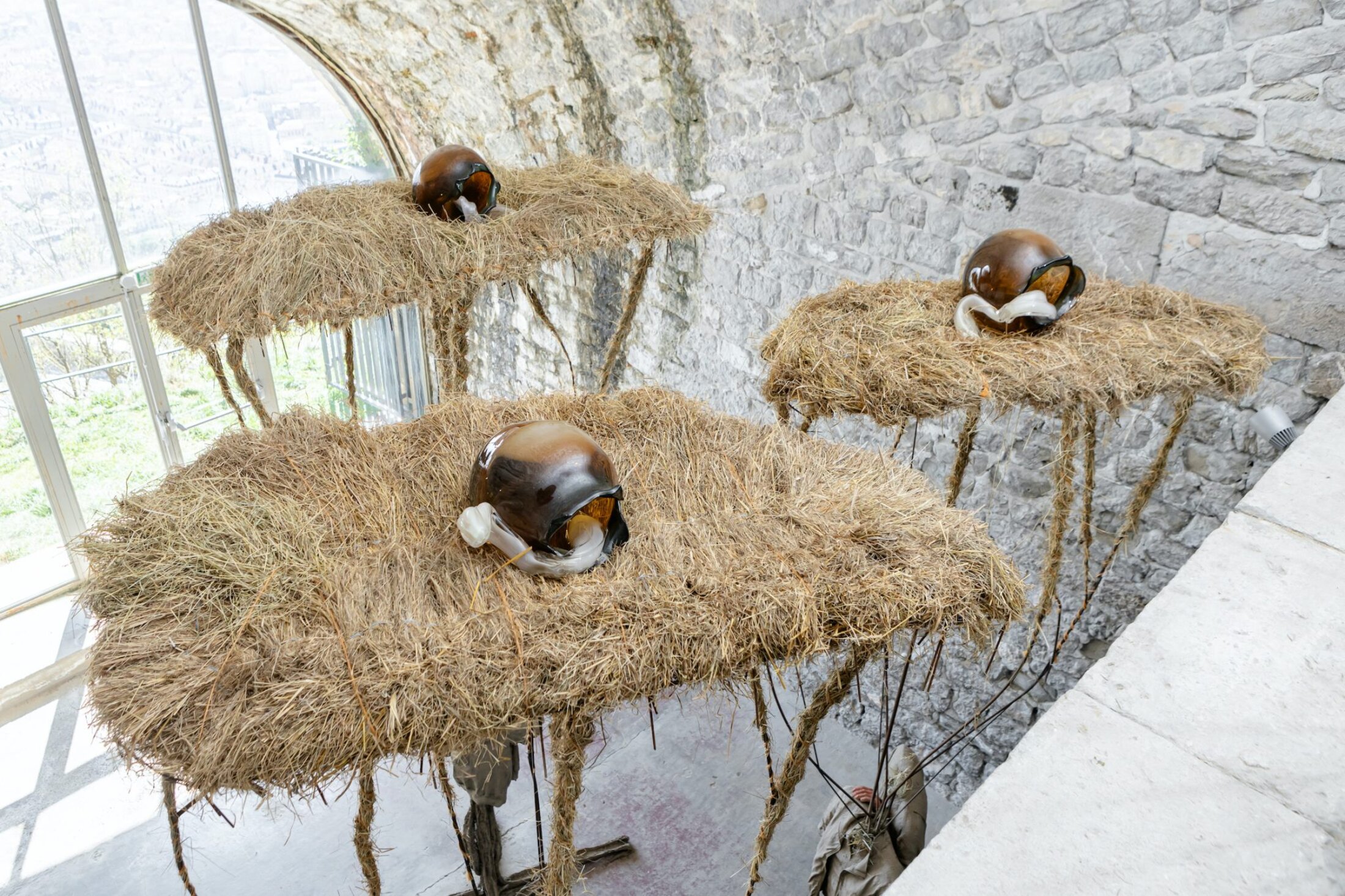 C’est dans cette configuration de prégnance d’un lieu à la fois refuge et belvédère qu’Aurélie Ferruel et Florentine Guédon ont imaginé l’exposition « Amitié : deuil, isolement, folie, tabou ». Les deux artistes, complices depuis 2010 et leurs années aux Beaux-Arts d’Angers, partagent le même contexte social et ont un intérêt commun pour la tradition en tant que lien intergénérationnel, vecteur de transmission de gestes et de savoirs. Elles poursuivent ici leur quête introspective débutée en 2023 à 40mcube à Rennes avec l’exposition « Nouaison »[1]. Leur travail, ancré dans une ruralité réinventée et une poétique du vivant, explore ici l’amitié non comme une simple relation, mais comme une force tellurique, un lien qui transcende les blessures intimes pour devenir un acte de résistance face aux fractures du monde. D’emblée, le visiteur est happé par l’intimité paradoxale du lieu. Le Centre d’art Bastille, avec son espace exigu taillé dans la roche, impose une proximité immédiate avec les œuvres, comme si celles-ci étaient des extensions organiques émanant des parois. Aurélie Ferruel, fidèle à son langage sculptural, présente une série de figures dont seules les mains, taillées à la tronçonneuse, sont incarnées. Le reste est suggéré. Ces formes, imposantes malgré la modestie du matériau, oscillent entre abstraction et figuration. Les nœuds du bois, laissés apparents, dialoguent avec les entailles brutales de l’outil, créant une tension entre la violence du geste et la douceur des courbes. Ces formes, silhouettes humaines dépourvues de tête et de corps, évoquent des totems archaïques, des gardiens silencieux qui semblent porter en eux des récits immémoriaux. Trois couples de foin, de terre, de textile, de bois et de métal, composent l’installation « Amitié » (2025) créée spécifiquement pour l’exposition. Chacun est couronné par une sorte de plateforme rectangulaire, tapis de foin accueillant en son centre une graine démesurée en verre en plein processus d’éclosion. Ces corps-couples, corps sommaires, sont recouverts de torchis, leur donnant une étrange impression d’absence-présence qui, loin d’inquiéter, transcrit une certaine bienveillance, une tendresse même, à travers la gestuelle des mains qui enlacent, qui, posée sur une épaule, rassurent.