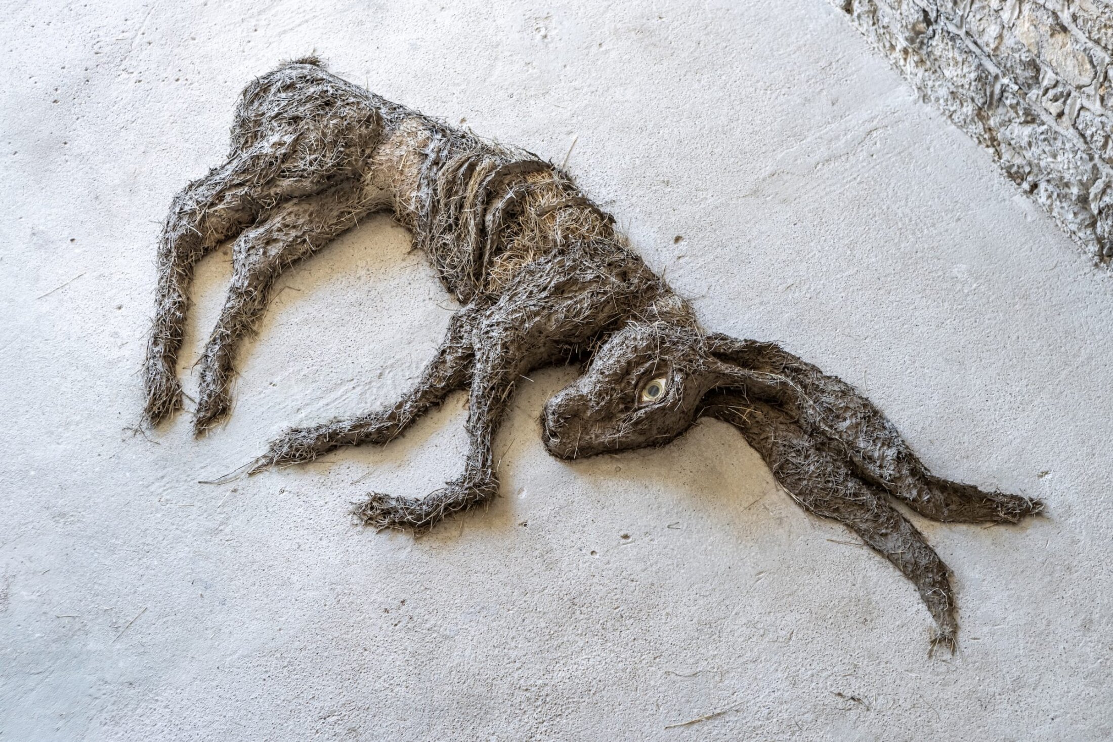 Tendre l’oreille, prendre le temps d’écouter, c’est ce que semble indiquer les oreilles démesurées du lièvre halluciné qui gît tout en dessous, en contrebas des couple-corps, ainsi que l’oreille en céramique, cassée et réparée, renvoyant à l’idée du soin, fixée au mur en bas de l’escalier. Le lièvre induit l’idée du costume, de la peau que l’on revêt, à l’image de Peau d’Âne. Le son du ruisseau est maintenant entrecoupé par les aboiements du chien de Florentine. Tandis qu’au-dessus, derrière les corps-couple, dans l’entrebâillement de la porte, le texte écrit par une mère qui a perdu son enfant, est dit par une de ses amies. « Ne le jetez pas dans la poubelle » peut-on entendre. De la difficulté du deuil prénatal. « Le jour où la douleur s’est inscrite dans ma chair. Te dire au revoir ».