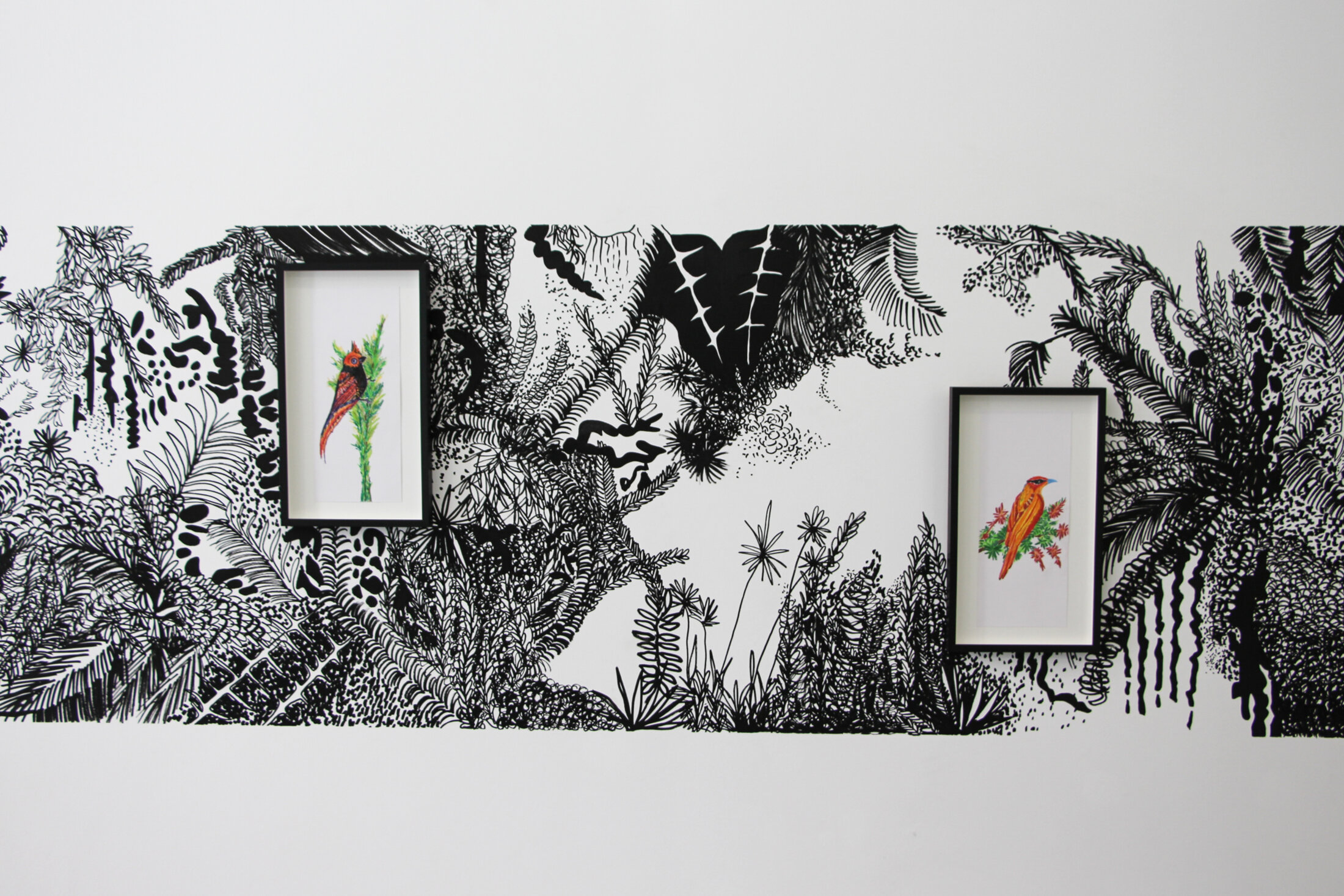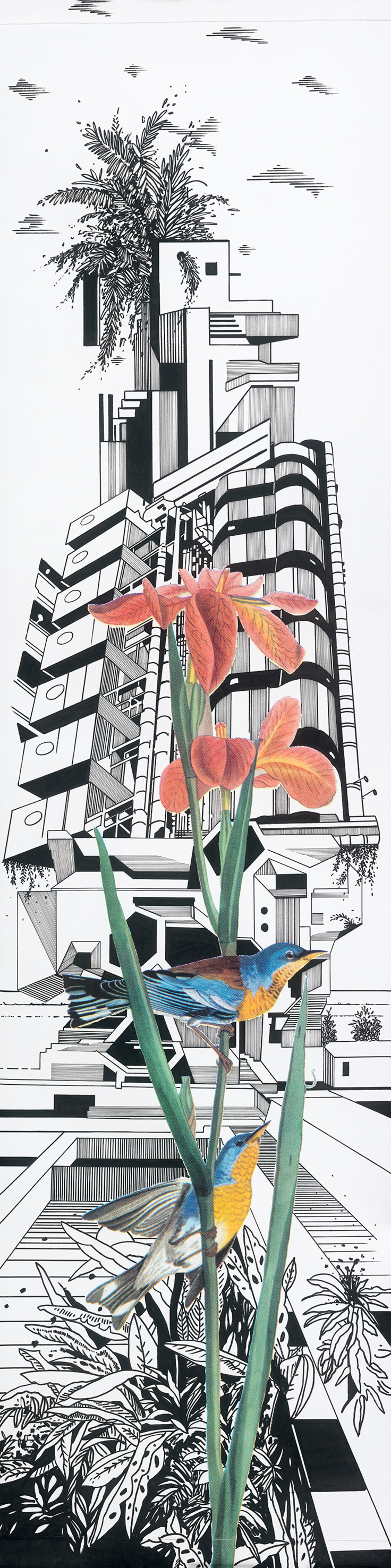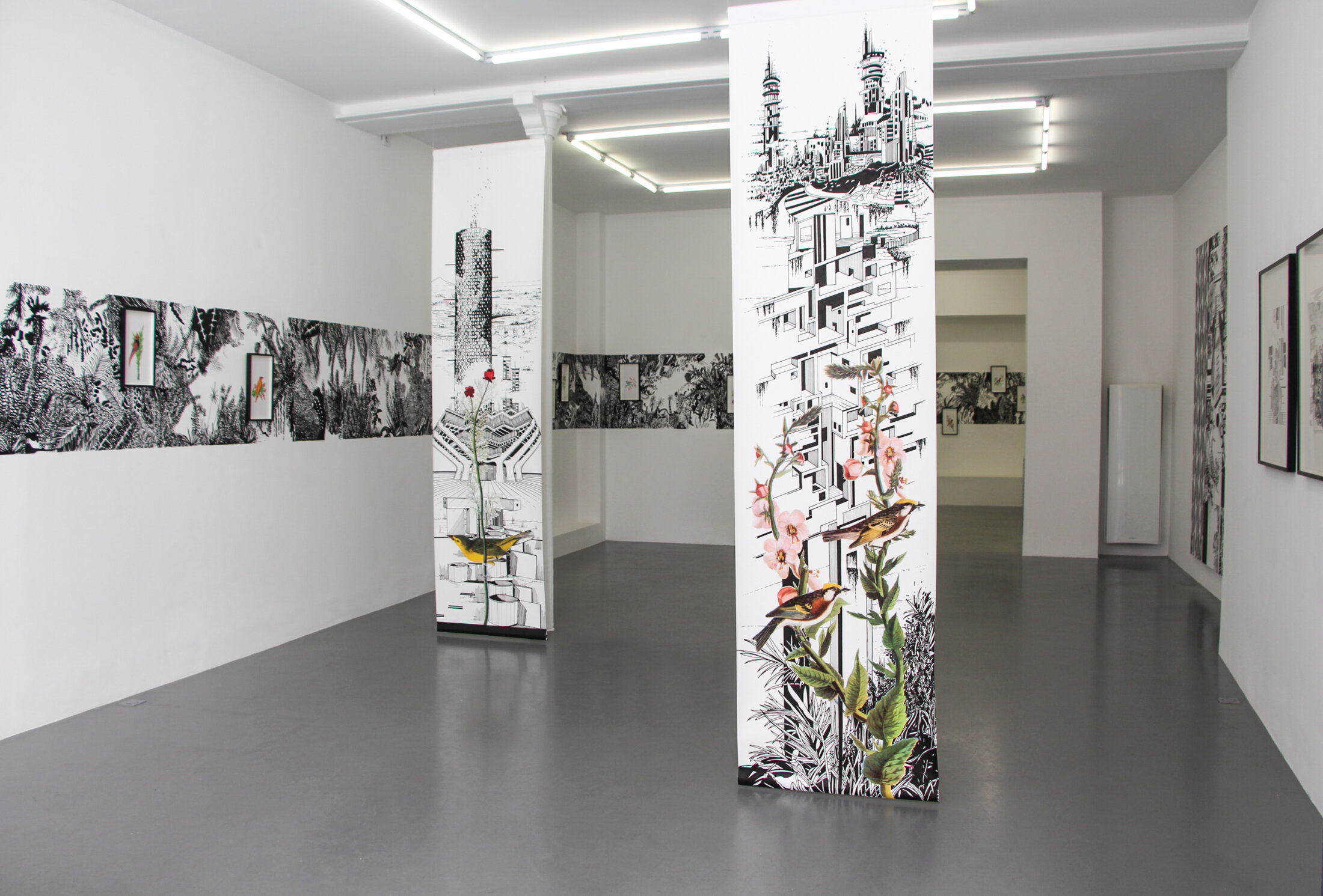 C'est un panorama de végétaux, un paysage dont la luxuriance évoque la jungle, qui se déploie sur une longue frise de papier imprimé, ponctuée de dessins encadrés figurant des oiseaux colorés, sur l'un des murs de la galerie Anne-Sarah Bénichou à Paris, à l'occasion de la seconde exposition personnelle de Chourouk Hriech (née en 1977 à Bourg-en-Bresse, vit et travaille à Marseille). L'artiste franco-marocaine appréhende l'espace de la galerie en faisant coexister cette ligne horizontale avec celles, verticales, des kakémonos de la série « La voce della luna », sur lesquels sont figurés des ensembles architecturaux brutalistes ou modernistes, immeubles imaginaires convoquant les réminiscences de son exploration de la ville. Empilés les uns sur les autres, ils construisent une cité haute dont le rendu noir et blanc définit la vision du monde de l'artiste. Au premier plan, en surimpression des habitations, apparaissent des oiseaux abrités par une nature démesurée. L'artiste s'inspire de planches dessinées au XIXème siècle par le botaniste et peintre belge Pierre-Joseph Redouté (1759 - 1840), que l'on surnommait le Raphaël des fleurs, pour la végétation, et par l'ornithologue et peintre américain d'origine française Jean-Jacques Audubon (1785 - 1851) pour les oiseaux dans l’inventaire qu’il dresse entre 1827 et 1839[1]. Avec l'appropriation par l’artiste du savoir et des images de ces oiseaux, elle s'empare pour la première fois de la couleur – crayons de couleurs et aquarelle – pour signifier l’urgence de la disparition en cours et ainsi ressusciter par une prise de conscience collective, dans les dessins encadrés qui scandent la frise, ces volatiles dont la plupart n'existent plus désormais que dans l'imaginaire. L’artiste travaille depuis plusieurs années sur la représentation des oiseaux – en 2016, elle les fait figurer à l’intérieur de vases aux formes anciennes dans la série les « puits du ciel ». Ils symbolisent pour elle la spiritualité, la manifestation d’un ailleurs inaccessible et infini. Sur les kakémonos, dans les paysages d'architecture figurant l'espace urbain dans lequel la nature, domestiquée par l'homme, voit sa place considérablement réduite, les oiseaux résistent. « ... Et des échelles pour les oiseaux », titre à la fois absurde et alarmant, joue sur les sens d’un mot. L'échelle, escalier transportable, outil inventé par et pour les humains, annonce une fuite abracadabrantesque d’oiseaux qui auraient alors cessé de voler. Mais l’échelle désigne aussi le rapport entre les dimensions d’un élément et celles de sa reproduction dans l’espace. L’échelle de reproduction des oiseaux est disproportionnée comparée aux habitations. Cette disparité indique le rôle important, essentiel même, qu'ils jouent dans l'équilibre de la terre et annonce l'espoir de leur survivance. La récente période de confinement que nous avons vécu a montré les prémisses d’une nature reprenant ses droits en l'absence des humains. Dans les rues des villes, en à peine quelques semaines, apparaissait timidement une végétation, là dans la fissure d’une marche en béton, ici au creux d’une brique fendue de la façade d’une maison. Le chant des oiseaux retrouvé, même de manière éphémère, est venu prouver que, malgré des pertes inéluctables, beaucoup peut encore être sauvé.