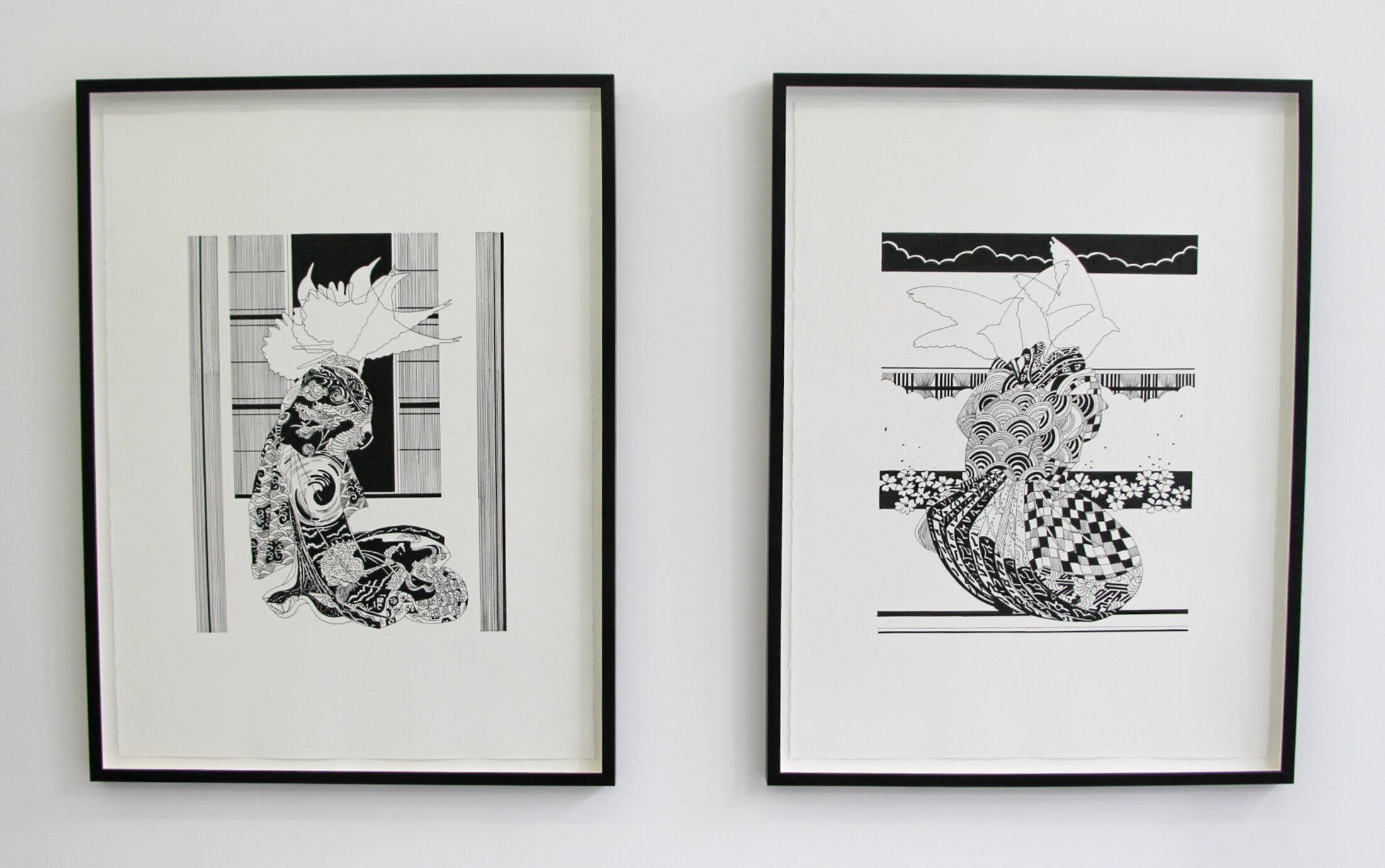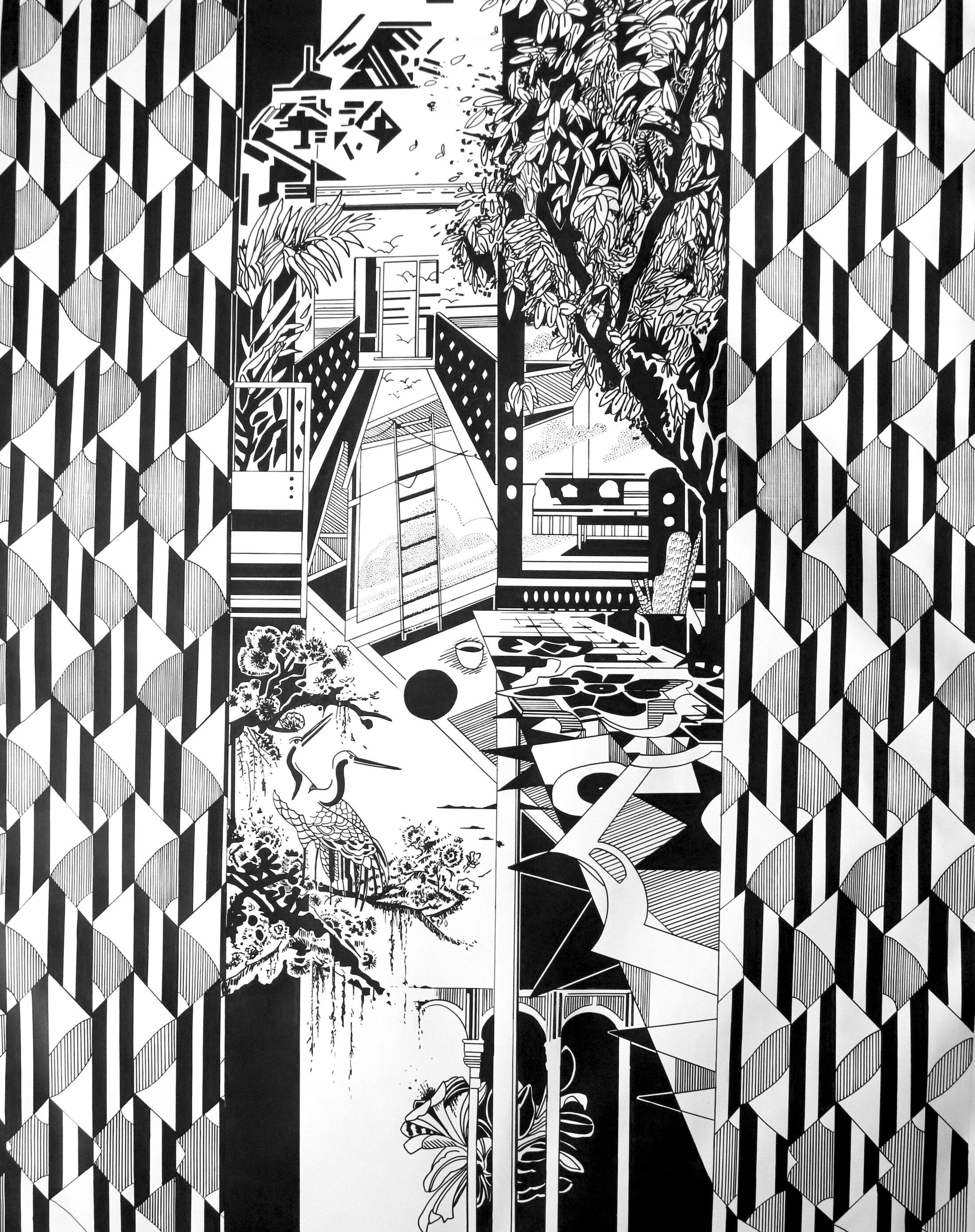Diplômée de l’Ecole nationale supérieure des beaux-arts de Lyon, Chourouk Hriech compose une œuvre sensible intimement liée à ce qui la constitue : une enfance nomade, entre le Maroc et la France, un peu d'Italie aussi, à la faveur d'une tante installée à côté de Bologne. Être polyglotte, c'est être capable de se mettre dans différents modèles de travail de la pensée. L'artiste revendique une approche très littérale du dessin. Sa pratique du monde correspond à sa découverte de la philosophie zen. Depuis plusieurs années, Chourouk Hriech s'intéresse à la dimension textile, interprétant l'habit comme une sorte d'entité, une enveloppe. C'est précisément ce qu'exprime la série de dessins « Illusion of you » dans laquelle elle compose des formes hybrides : le tissu de kimono japonais trouve son prolongement dans les ailes déployés d’un oiseau, métamorphose qui lui permet de se libérer. Une toile présente un ensemble d'éléments suggérant les saisons de façon suffisamment large pour que chacun s'en saisisse et matérialise, à travers ses références personnelles, sa propre représentation. Cette fenêtre ouverte sur notre imaginaire est le moyen de l'envol, à une époque où tout ce qui semblait aller de soi, être la conséquence naturelle d'un fait, ne l'est plus. Chourouk Hriech questionne le réel et le réalisme en les confrontant à un imaginaire onirique. Sa pratique du dessin s’apparente à un voyage dans l'espace et le temps, à l’invention d’un monde flottant peuplé de figures aux formes stylisées, architecturales, végétales ou animales, parfois humaines, anciennes ou contemporaines. L’intention immersive de ses grands wall drawings, exécutés sur papier ou à même le mur, dans lesquels les constructions urbaines s’entrechoquent pour restituer la verticalité et le chaos des villes, convoque un art de la fresque que la répétition du motif ornemental inscrit dans une sorte d’art pariétal, un art rupestre contemporain.