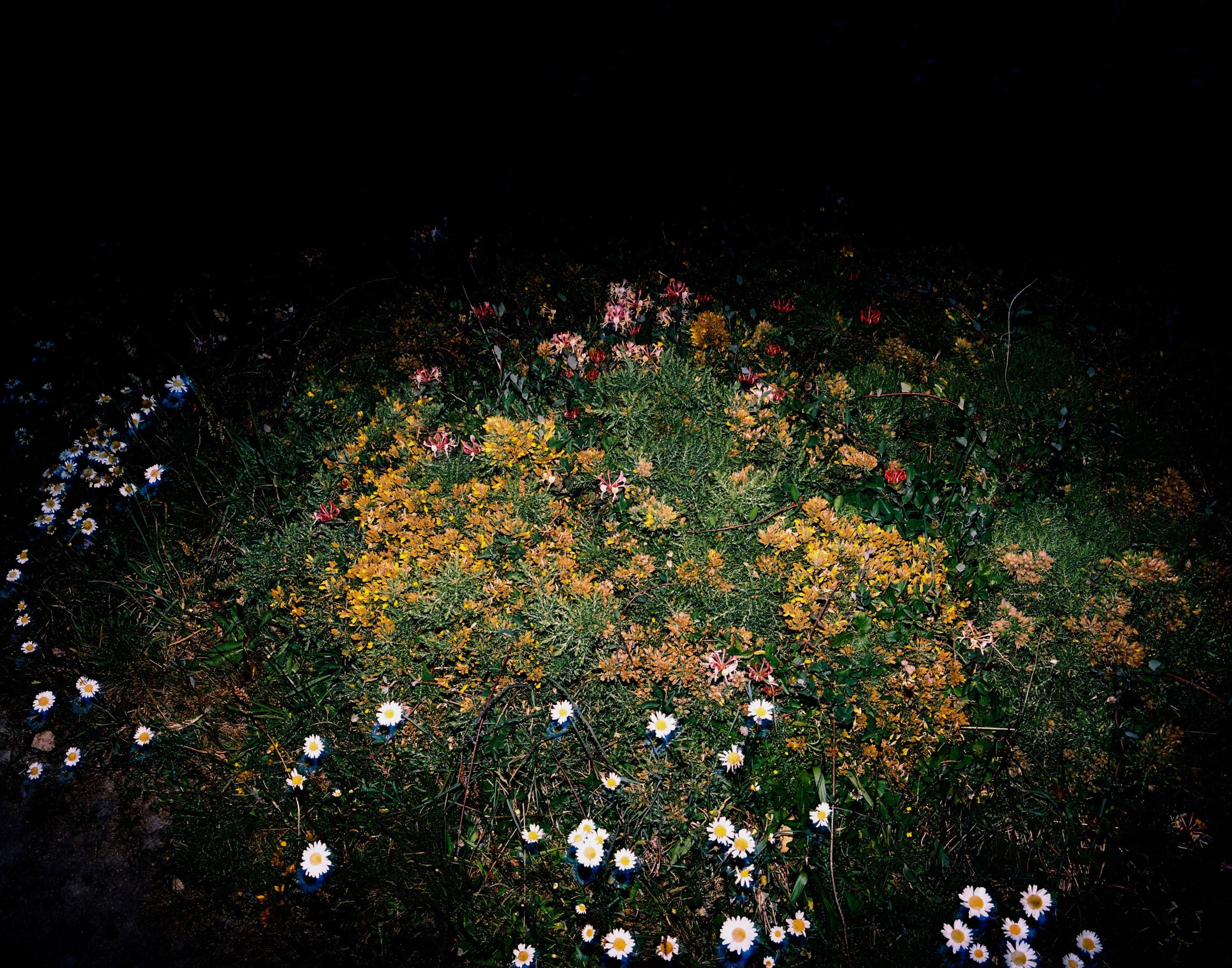 Interroger le futur floral à travers une mystérieuse matière noire – unique couleur que ne possède aucune fleur. Tel un apprenti sorcier, Hicham Berrada (né en 1986 à Casablanca, vit et travaille à Paris) utilise la morphogénèse, c’est à dire la capacité de la plante à modeler elle-même des parties de son corps au fur et à mesure de sa croissance, détournant la biologie à des fins artistiques. Ses « augures mathématiques » (2019) sont mis en regard avec un tirage de Josef Sudek (1896 – 1976), « White Rose Bud » (1954) dans lequel le photographe parvient à capter les microscopiques bulles d’eau qui remontent le long de la tige. Berrada comme Sudek se posent en regardeurs, observant en retrait ce qui se passe sous leurs yeux. Enfin, laisser s’exprimer l’être-fleur qui sommeille en nous, à la faveur de l’air et du pollen que l’on respire, hésiter entre abandon et activisme. Le portrait en plan serré de Lois Weinberger (1947 – 2020) en Greenman (2004) en est sans doute le meilleur exemple. Le visage recouvert d’une peinture verte, un pétale blanc au bout du nez, l’artiste autrichien a le regard tourné vers le bas pour marquer son attachement à la terre. Il incarne l’homme vert, géant païen apparu en Europe au XIIIème siècle. Dans le film « Sea and flowers » (2013), l’artiste japonais Shimabuku (né en 1969 à Kobe, vite et travaille au Japon) interroge l’origine et le trajet d’une fleur rouge flottant dans les vagues près de la côté de Noto, en offrant à son tour des pétales à la mer. Initiée aux plantes, au chamanisme ou encore à la permaculture[5] à San Francisco par Starhawk[6], l’une des figures de l’écoféminisme, Suzanne Husky (née en 1975 à Bazas, vit et travaille entre Bazas et San Francisco) dresse un lieu de culte païen afin de créer une perméabilité entre le monde humain et le monde végétal. Narcisse, appelé également Jacinthe, est l’une des premières fleurs à éclore au printemps. Le personnage des « Métamorphoses » d’Ovide porte en lui le renouveau. La série « Welcoming the flowers » (2007) abrite des phrases radicales de l’artiste et poète américain John Giorno (1936 – 2019). Entre devise et haïku, scandées ou chantées, mêlant mythe, jeux de mots, images et poésie concrète, elles bousculent les noms des fleurs pour en interroger le sens dans une époque de mutation. Arrivé au bout du voyage, la mue se révèle transfiguration. Le langage décloisonné de John Giorno apparaît comme le pendant cognitif de la création, à la fois décodeur et amplificateur de l’expression florale. Aujourd'hui, seulement un cinquième de la faune terrestre a été étudié. La fleur ultra contemporaine semble nous donner des raisons d’espérer. Narcisse s’envisage comme l’expérience désespérée de l’altérité.