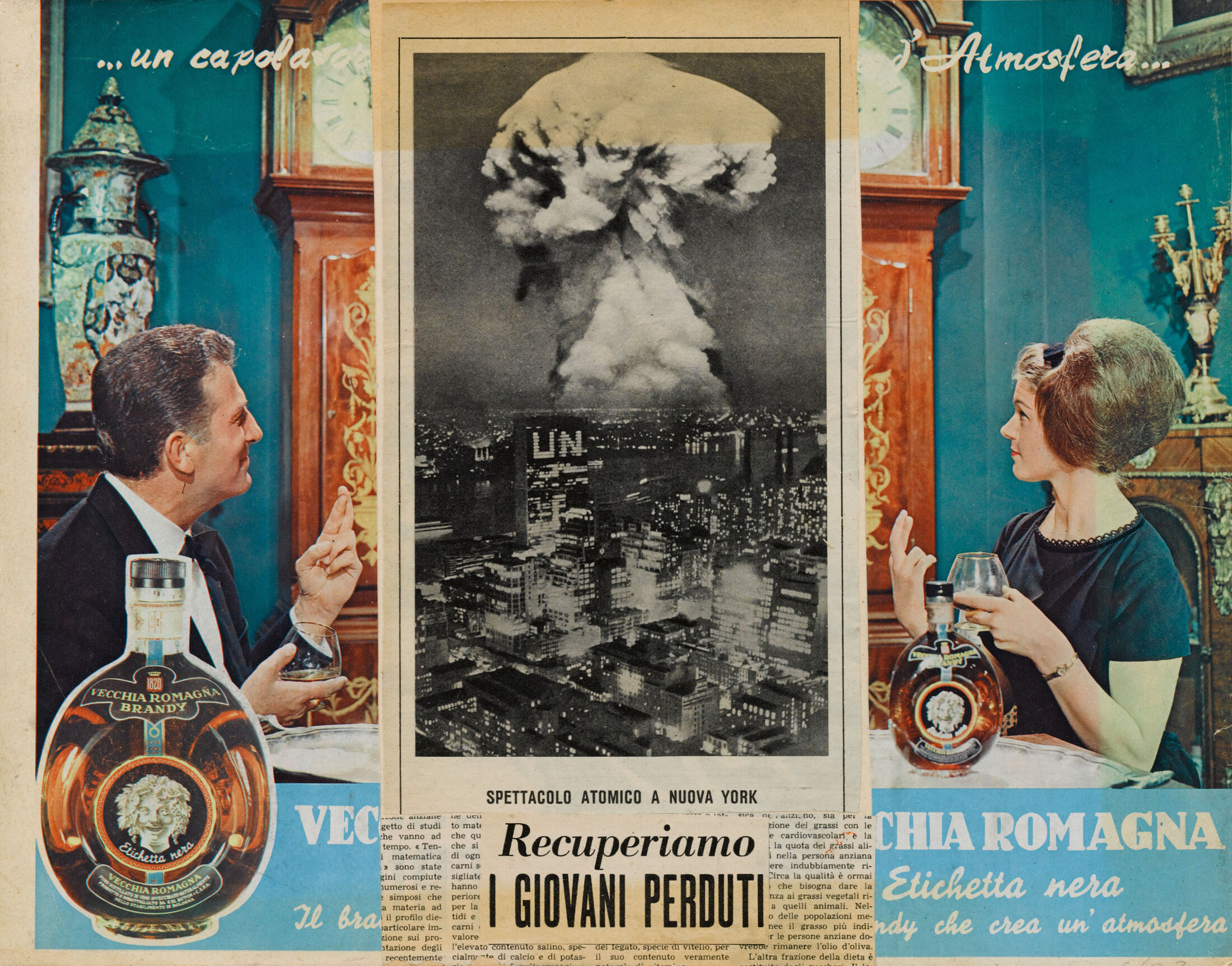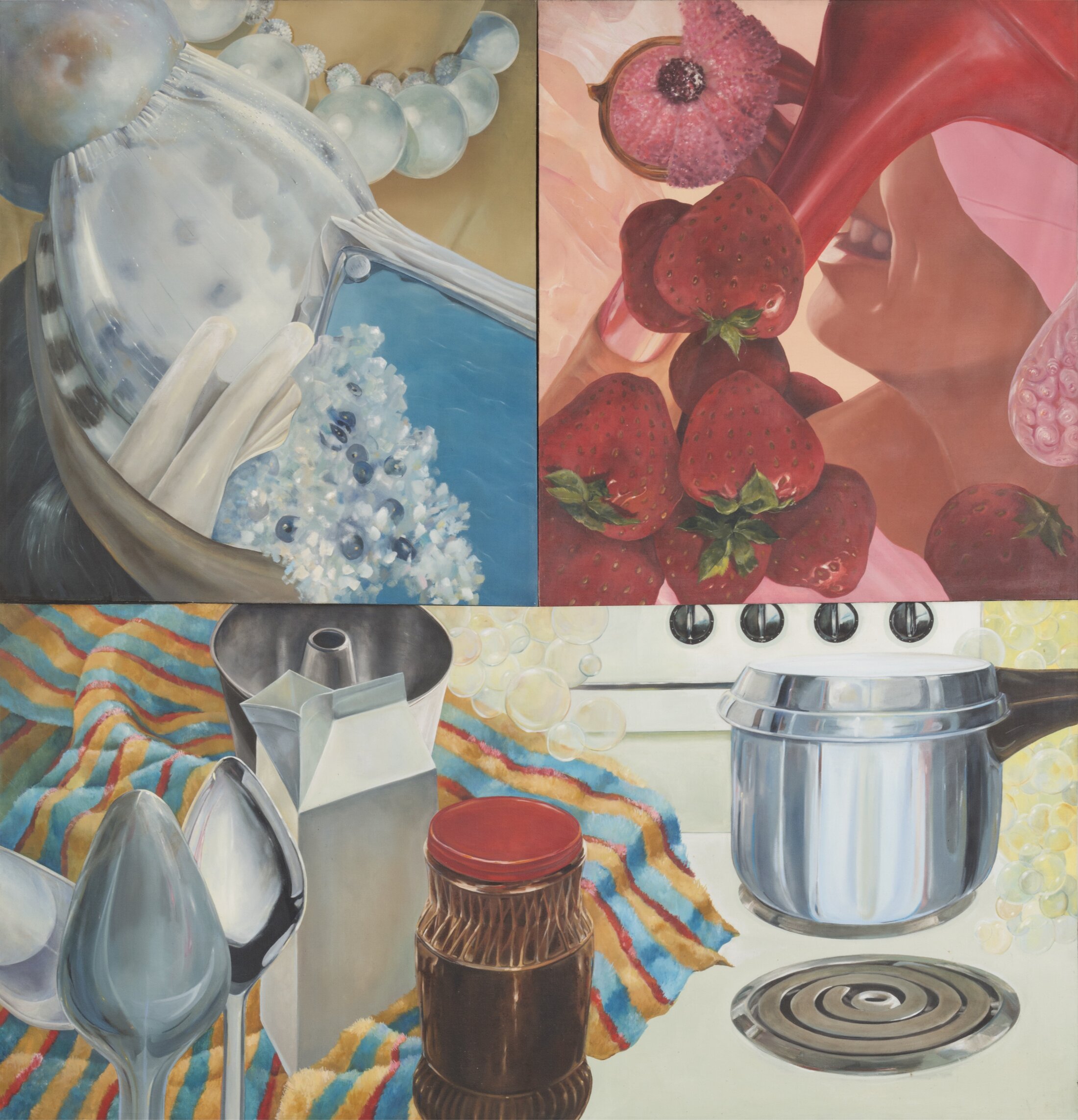 Lourdes Castro fuit la dictature portugaise et s’installe à Munich puis à Paris. Elle se rapproche des Nouveaux réalistes. A partir de 1961, elle assemble des objets hétéroclites réunis dans des boîtes à la manière d’une archive du présent, une archéologie du quotidien, comme en témoignent ses « Assemblages d’objets » (1963), composition abstraite réalisée à partir de tubes des peinture, capsules de bouteilles, un miroir et même un 45 tours. Ils forment un instantané de l’époque. Dans ses peintures hyperréalistes et relevant d’un procédé d’agrandissement, l’américaine Kay Kurt élève la cuisine de tous les jours au rang de peinture d’histoire dans « Triptych » (1967). Les friandises industrielles deviennent ses sujets de prédilection. L’artiste allemande Ulrike Ottinger mêle, à la façon d’un songe, vie domestique et désir d’évasion dans la toile « Bande dessinée », justement organisée en vignettes.