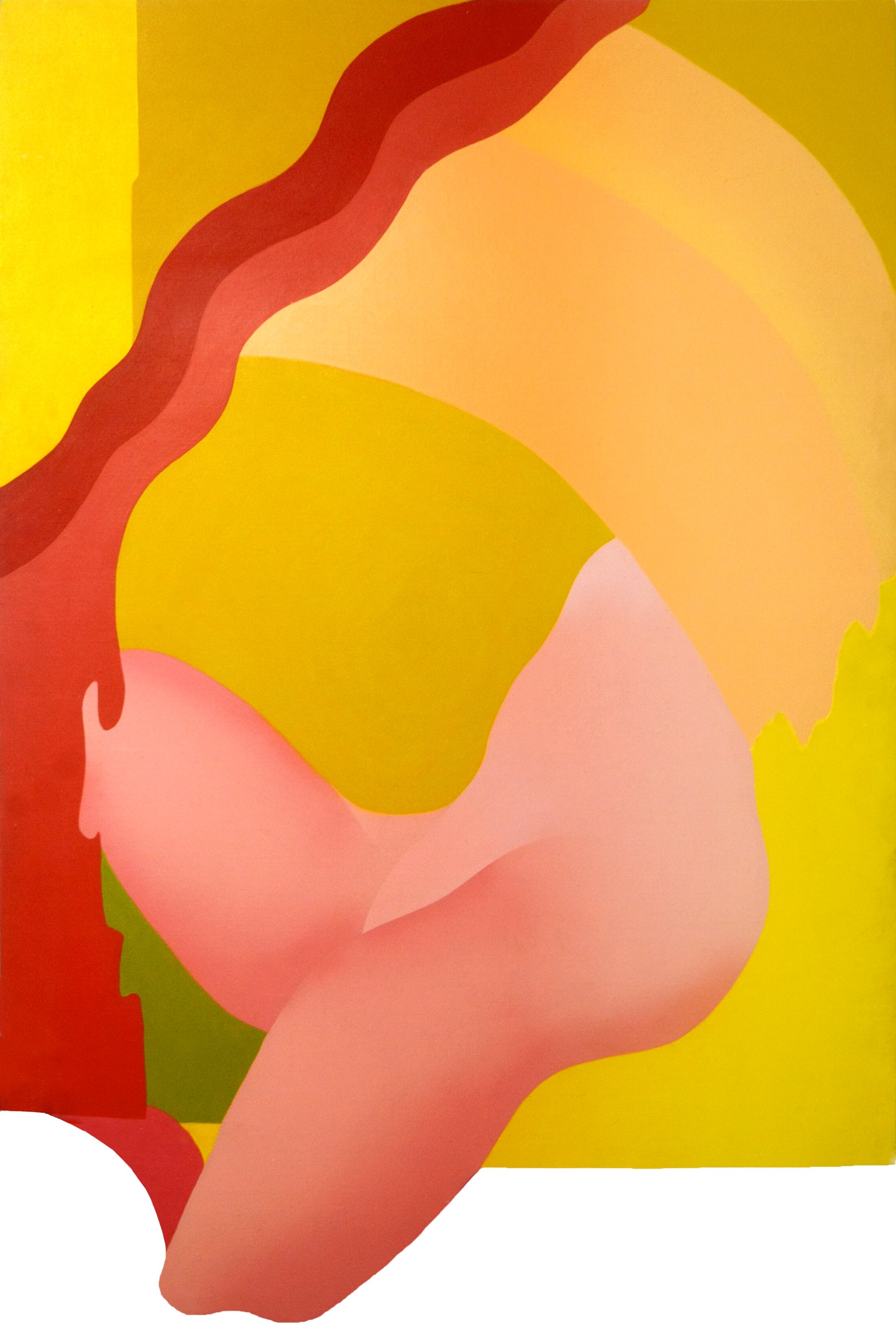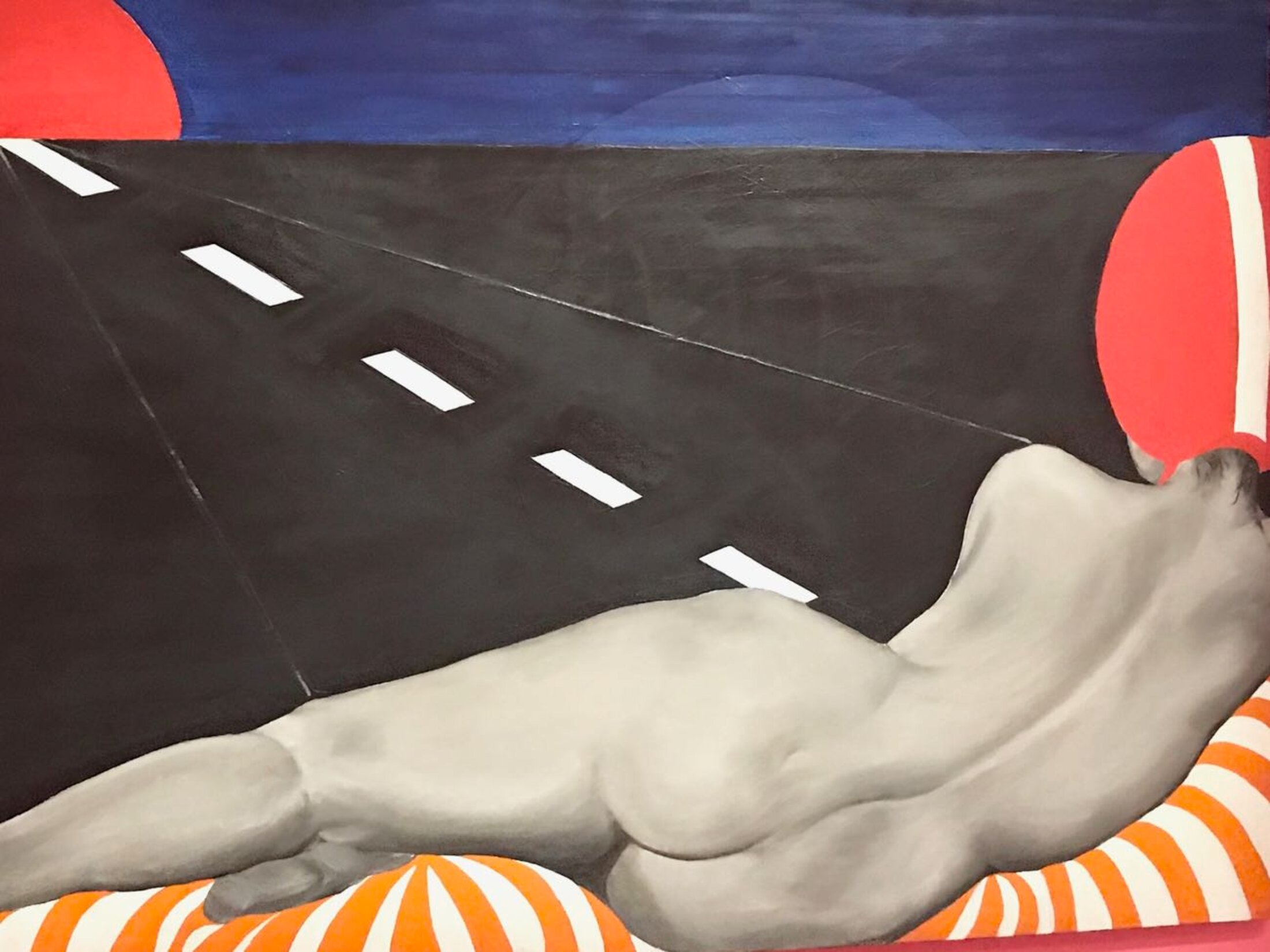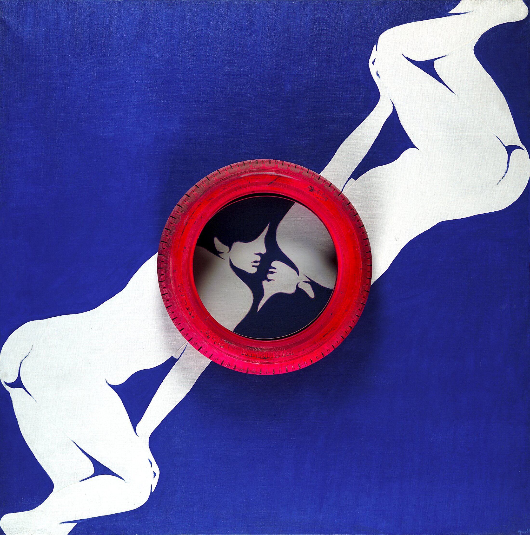 L’omniprésence des corps flottants marque aussi la production de la peintre belge Evelyne Axell[3] qui incorpore des objets à ses tableaux leur donnant du relief à l’instar de « Erotomobile » (1966) qui mêle deux représentations stylisées de corps féminins figurés tête bêche si bien qu’ils forment une diagonale qui traverse la toile occupée en son centre, là où se rejoignent les visages, par un pneu peint en rouge, véritable halo automobile. L’instant, saisi juste avant le baiser, rend la scène à la fois sensuelle et clairement érotique. Un an auparavant, elle peint « Auto-stop », une Vénus casquée, allongée de dos sur un lit à rayures, au milieu d’une route, contemplant un coucher de soleil. Elle la représente alanguie à la manière des Vénus de Vélasquez. À une époque de démocratisation de la voiture, elle s’approprie la question de l’automobile, l’érotisme de la vitesse, images jusque-là réservées à l’univers masculin.