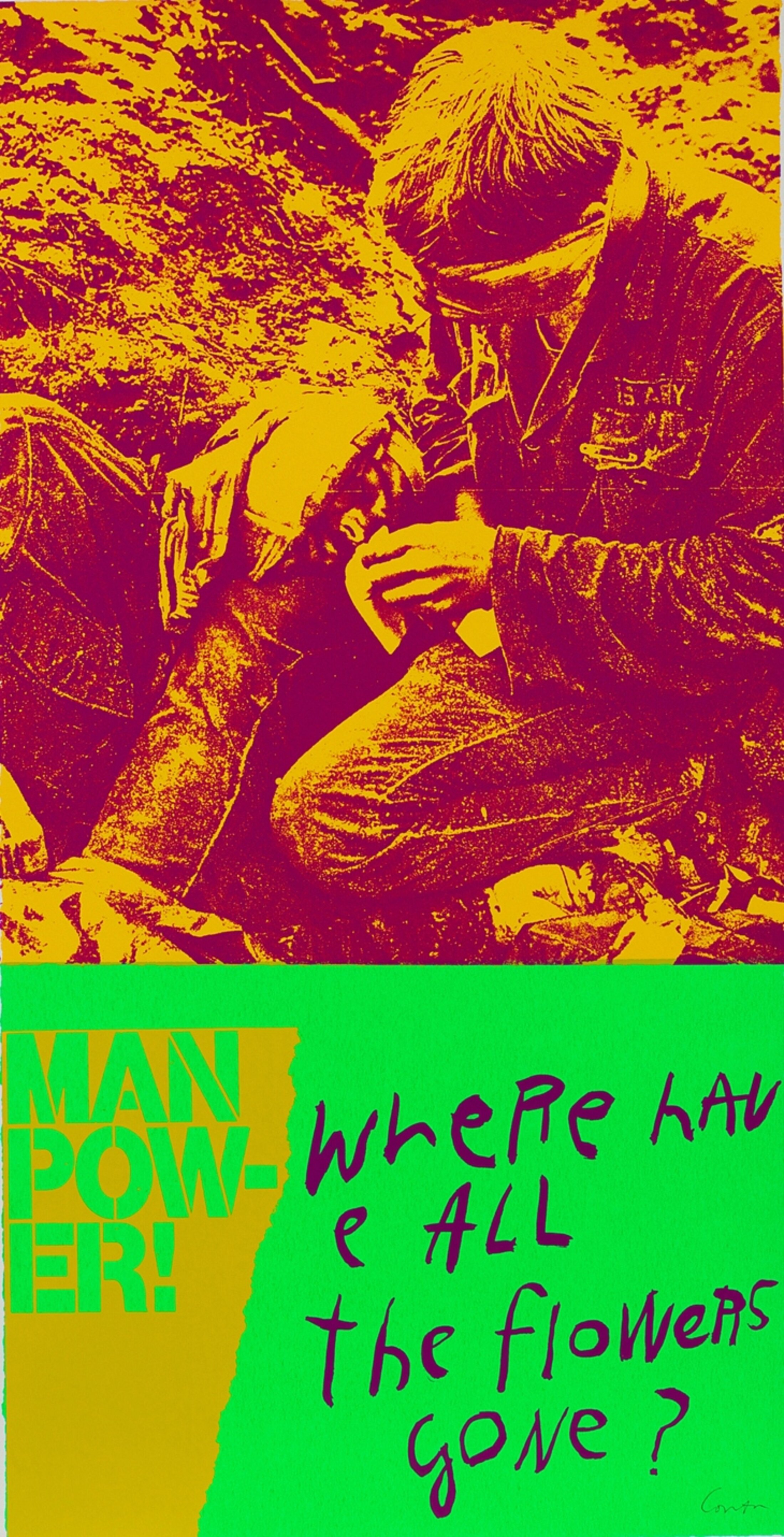 La dernière partie de l’exposition s’ouvre sur la sculpture lumineuse éponyme (1972) de l’artiste belge Martine Canneel qui, avec son arc-en-ciel, incarne l’utopie de la modernité, à bonne distance tout de même puisqu’il faut alimenter le néon en insérant un jeton dans la fente prévue à cet effet et presser le bouton, « pour ESPERER » est-il précisé en préambule. Le travail plastique des artistes pop, particulièrement des femmes, se politise parfois assez tôt. 1962 marque la fin de la guerre d’Algérie qui avait officiellement commencé huit ans plus tôt. Cette même année, Niki de Saint Phalle expose dans la vitrine de la galerie Rive Droite à Paris, son « Autel OAS », triptyque doré produit à partir d’une œuvre tir, au centre duquel trône une chauve-souris. Le titre, ambigu, renvoie autant à l’acronyme d’œuvre d’art sacrée qu’à l’organisation terroriste tentant de conserver l’Algérie française. L’œuvre, qui reprend l’iconographie du retable chrétien, croise crucifix, armes, gousse d’ail, grenades, Vierges, Sacré-Cœur, révolvers chauve-souris empaillées… L’artiste signe ici un manifeste de son engagement pour la paix et les droits civiques qui l’animera tout au long de sa vie. Toujours en 1962, Dorothy Iannone crée, dans un langage proche des bannière de manifestations, son collage « This is a call for a World-Wide General strike for peace ». Originaire de Los Angeles, Sister Corina Kent entre dans les ordres en 1936 et commence à enseigner l’art en 1946. En 1951, elle expose pour la première fois ses œuvres marquées par une iconographie biblique. À partir du milieu des années soixante, elle produit des sérigraphies résolument pop qui diffusent des messages de paix prenant la forme de slogans publicitaires : « Stop the bombing » ou encore « Make love not war », « Where have all the flowers gone »... Elle prend position contre la guerre du Vietnam et est élue personnalité de l’année 1967 par l’hebdomadaire Newsweek. En conflit avec son ordre catholique qui lui reproche ses engagements, elle quitte la religion l’année suivante pour vivre pleinement de son art.