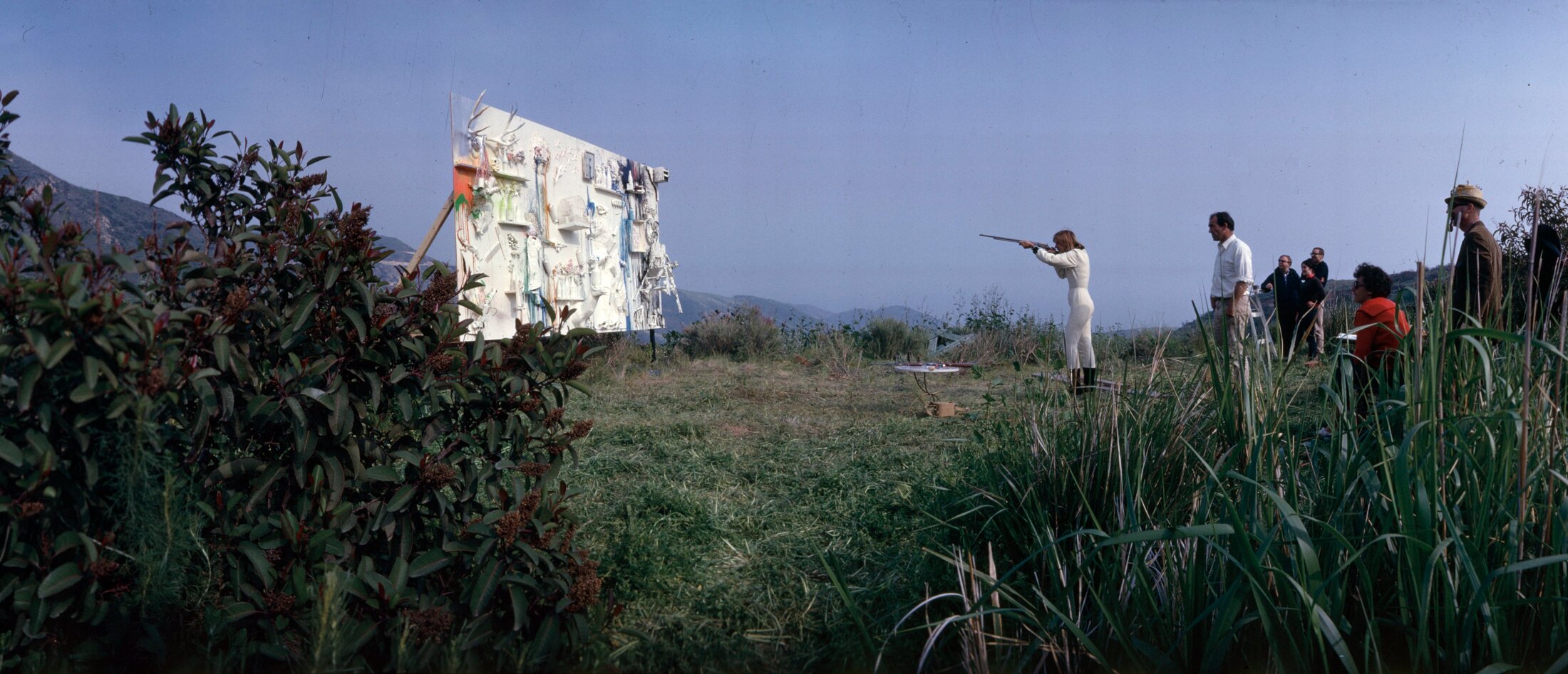 Avec le protocole de tir édicté par Niki de Saint Phalle dans une lettre à Karl Gerstner à l’été 1964, chacun peut faire sa peinture-tir à la maison. Débutée en 1961, cette série s’achève dix ans plus tard avec le film « Daddy » réalisée avec Peter Whitehead, cinéaste de la contre culture et apôtre de la libération sexuelle. Le long-métrage raconte la relation ambiguë entre un père et sa fille, de sa petite enfance à son adolescence. L’histoire est largement autobiographique, le projet, une tentative de régler ses comptes avec un père incestueux. En 1964-65, Diana Rigg triomphe à la télévision britannique dans le rôle d’Emma Peel, indispensable partenaire de Patrick McNee dans la série « The Avengers » (« Chapeau melon et bottes de cuir »). La ressemblance avec Niki de Saint Phalle est saisissante.