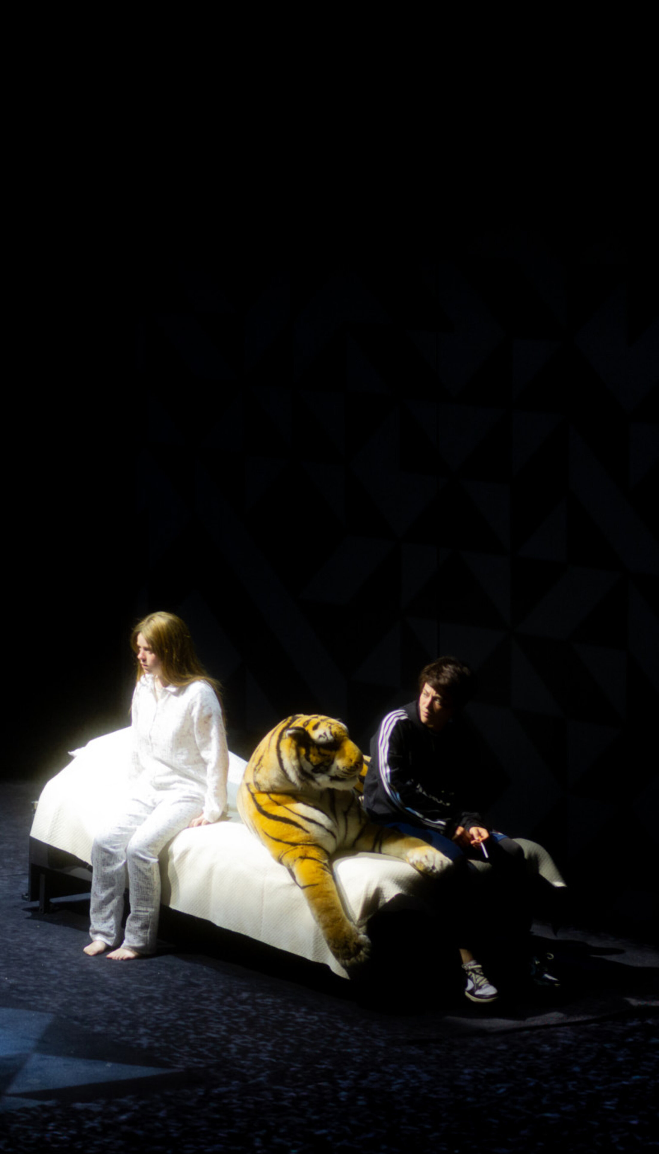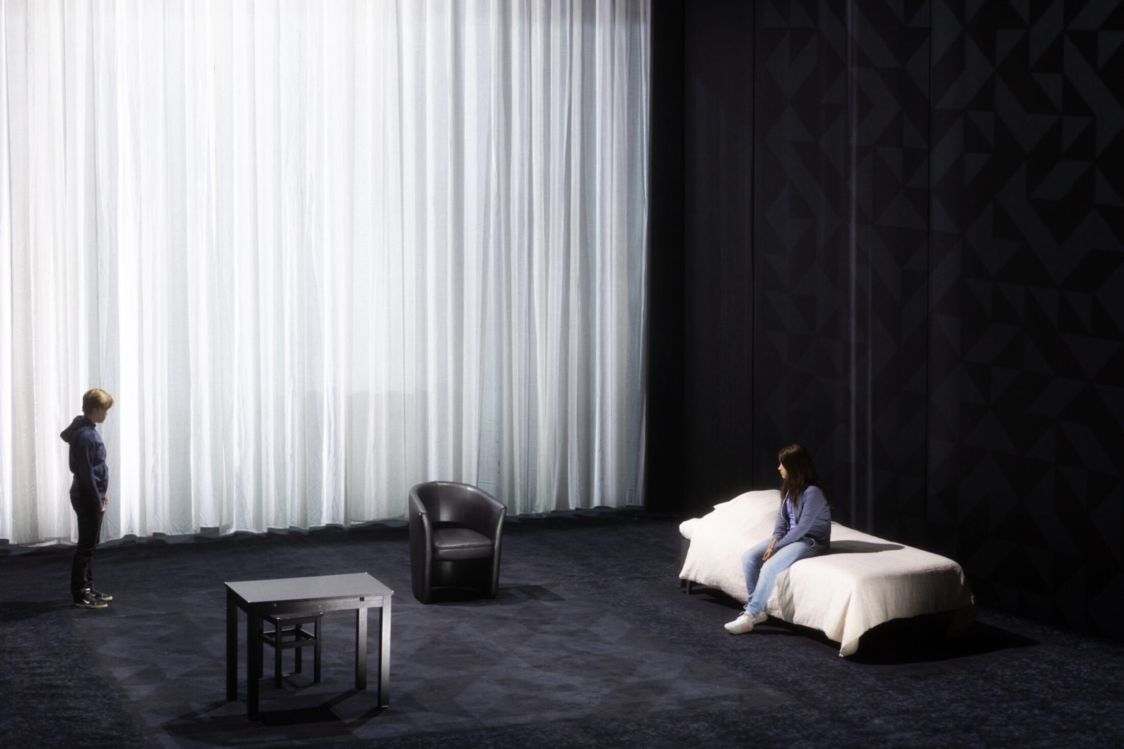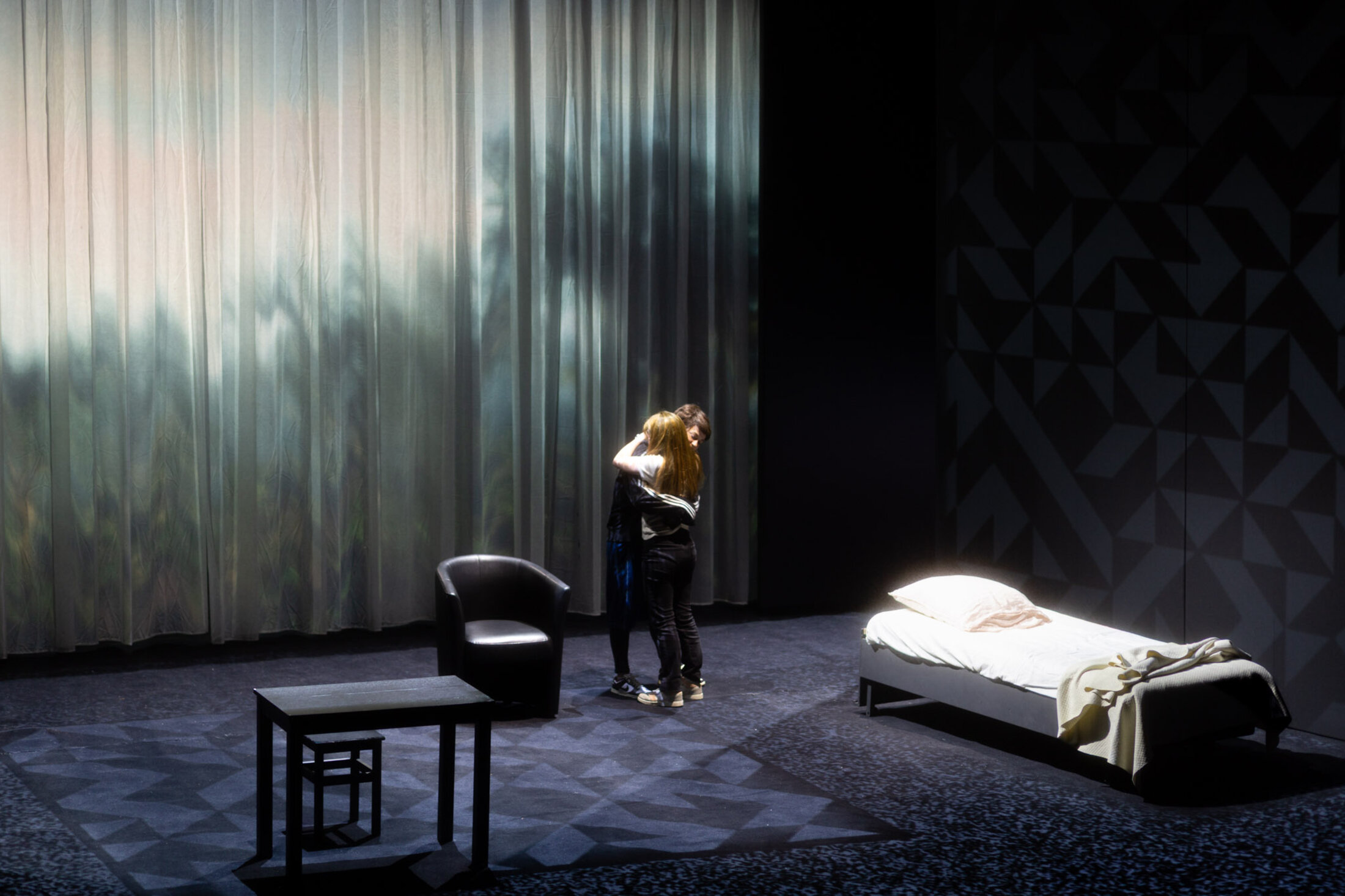 Au cœur de la pièce, l’installation narrative agit comme un centre de gravité sensible qui absorbe et redistribue les vibrations émotionnelles. En empruntant aux archives de l’enfance réprimée, Pommerat fait état des « guerres » intimes de l’adolescence, quand l’identité en construction se heurte à la norme. Il transforme ces voix en une chambre d’écho dans laquelle la fiction devient une stratégie de résistance, clandestine et mouvante. Les scènes, à la fois cruelles et naïves, superposent le fantastique au quotidien via cette amitié si puissante qu’elle en altère la réalité, faisant surgir des doubles spectraux et des mondes parallèles dans lesquels les adultes deviennent des ombres menaçantes tapies dans le hors-champ. Les tableaux successifs forment des bouts de mondes, des portails vers des temporalités décentrées. Dans la pièce, l’avatar de l’amitié, inspiré des mythes antiques d’Éros et de Philia[5] revisités à l’ère numérique, navigue à travers des monceaux émotionnels, des fragments de souvenirs et des archives familiales, narrant l’insurrection juvénile d’une voix synthétique, presque robotique.