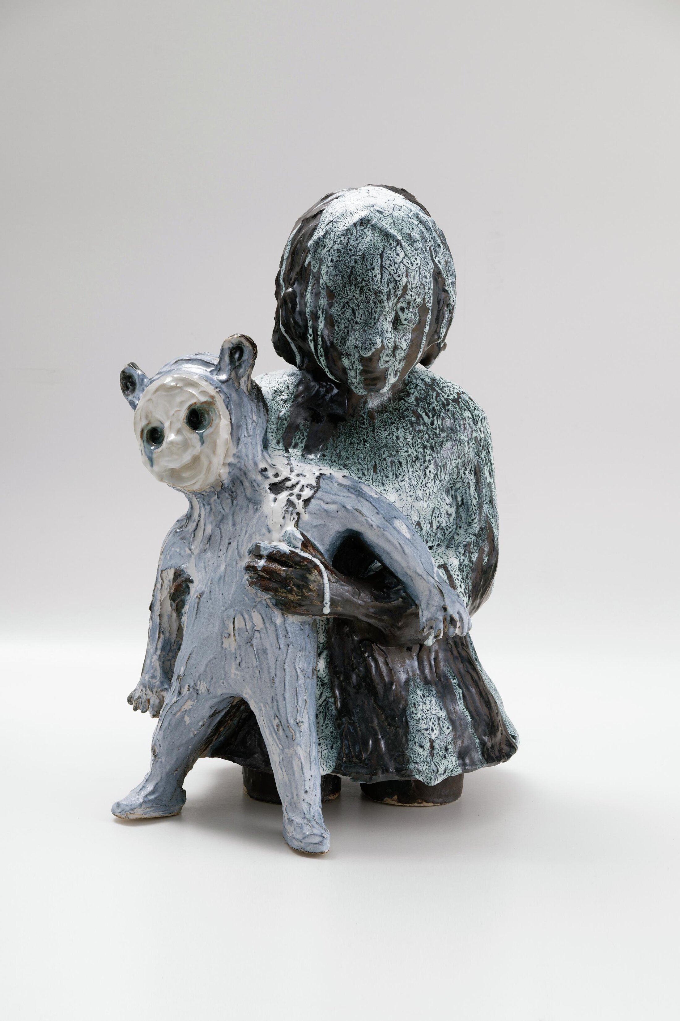 Au fil des salles, l’exposition tisse une trame thématique qui pourrait sembler linéaire – de l’intime au fragment, du double à la disparition, de la solitude à la transition, jusqu'à la cruauté sous-jacente – mais qui, en vérité, forme un rhizome, un réseau souterrain dans lequel chaque pièce renvoie à l’autre comme des os interconnectés dans un squelette invisible. Les créatures hybrides prennent forme et se traduisent en volume à travers des sculptures en bronze ou céramique au sous-sol du MO.CO. Depuis plusieurs années en effet, Pétrovitch s’intéresse à la sculpture. En infusant ses bronzes d’une douceur presque charnelle, elle transcende le matériau froid pour en faire un vecteur d’émotion, une caresse minérale qui touche à la cruauté de l’immobilité.