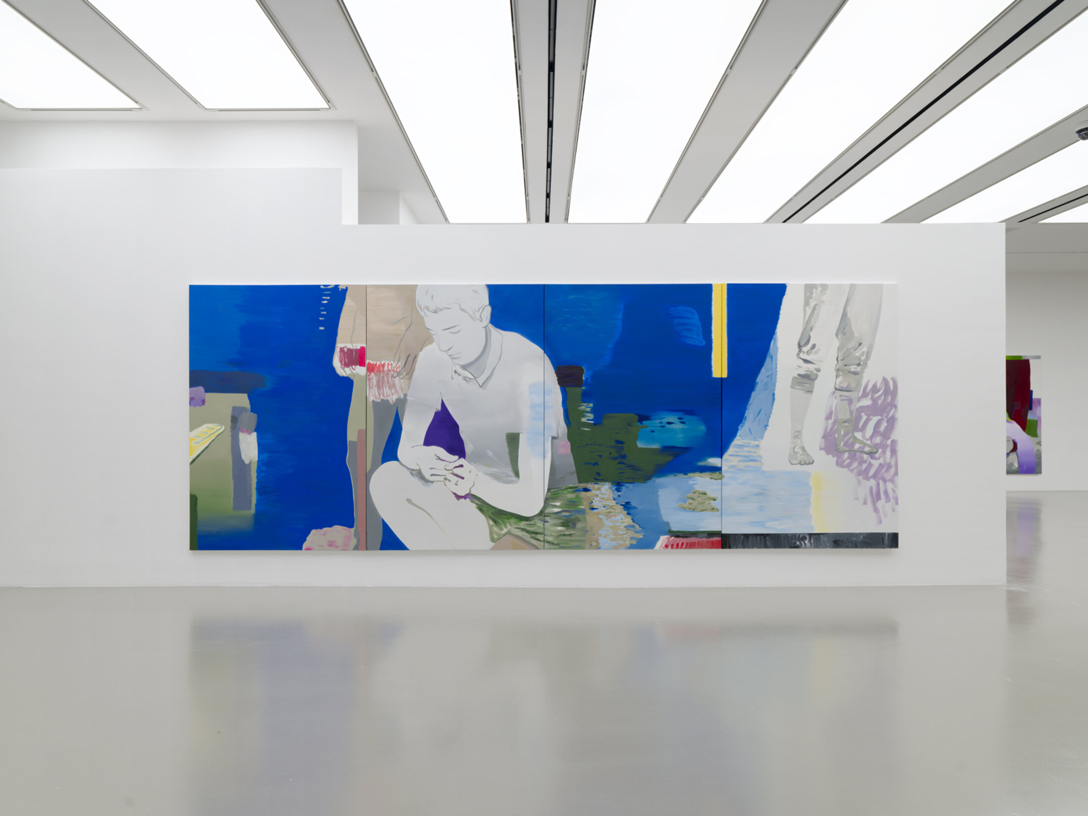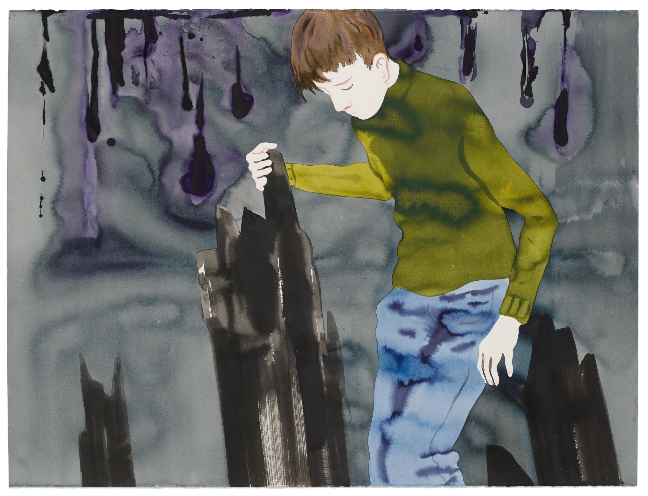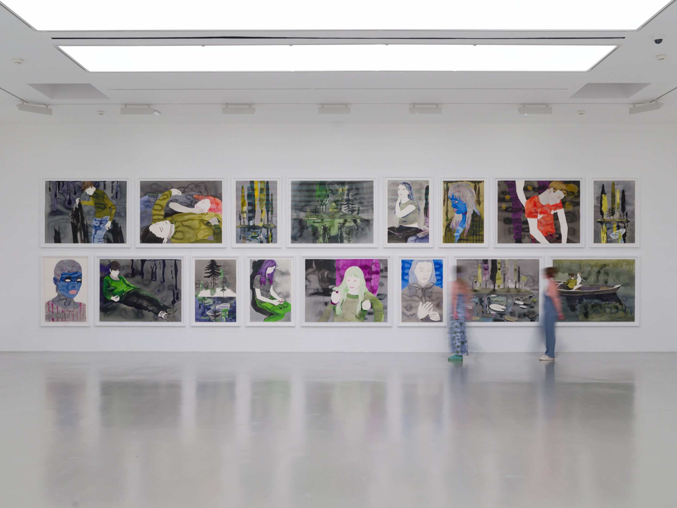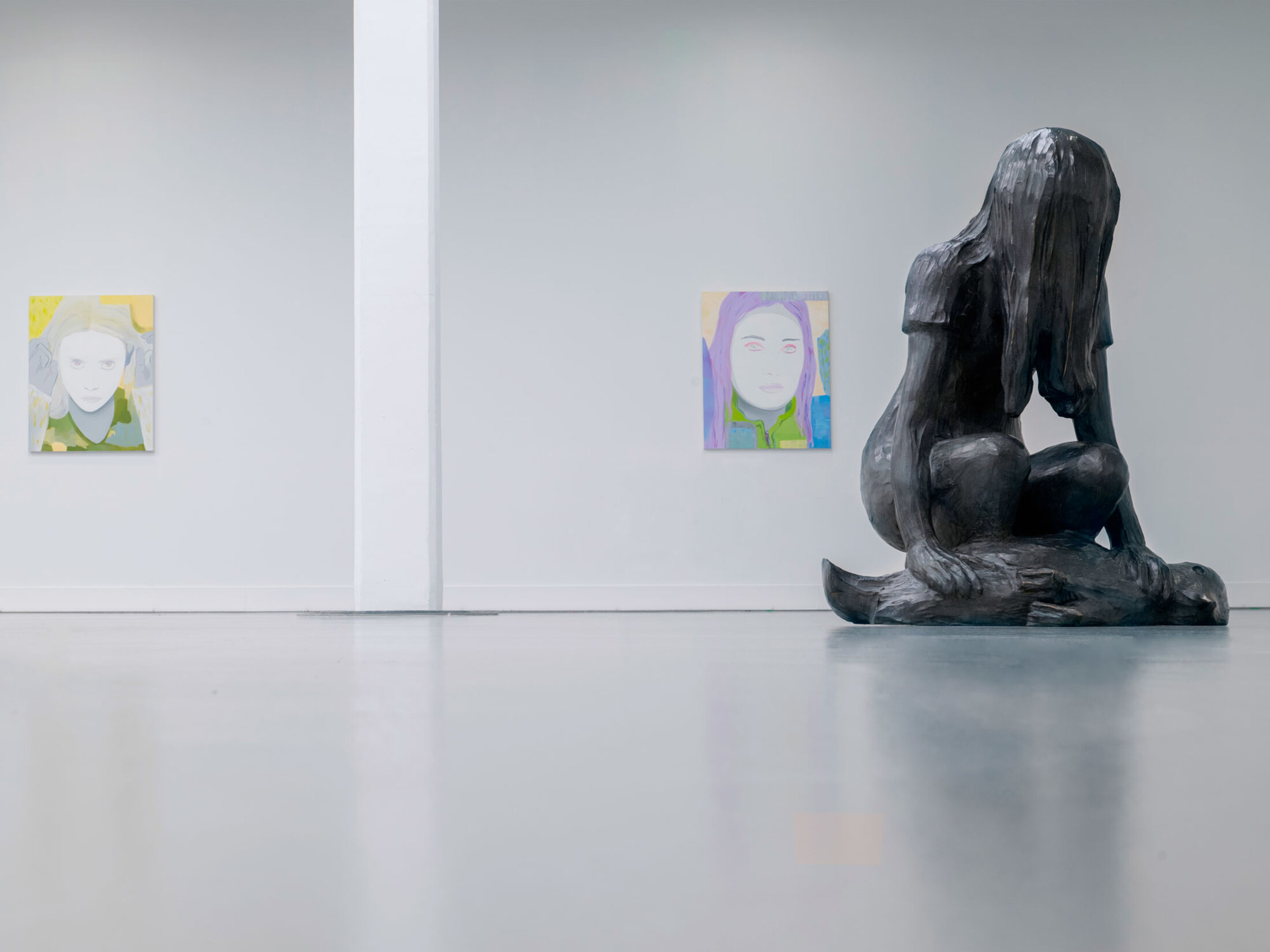 On entre dans l’exposition par une série de quinze portraits monumentaux, intitulée « Cinémascope » (2020-2024), dans laquelle des lavis d’encre sur papier aux formats panoramiques – « Je voulais des portraits qui ne soient pas en format portrait : ça me permet de couper un peu, ici la tête, là un peu plus bas, là plus court près du menton » précise Françoise Pétrovitch dans une conversation avec Rahmouna Boutayeb, curatrice au MO. CO. et commissaire de l’exposition, publiée dans le catalogue qui l’accompagne – déploient une galerie de figures adolescentes, yeux clos ou baissés, casques audio vissés sur les oreilles ou regards perdus dans l’écran luminescent d’un téléphone. Ces jeunes gens hybrides, mi-humains mi-spectres numériques, ne regardent pas le visiteur. Ils l’esquivent, plongés dans un monde intérieur qui l’exclut et l’attire à la fois. L’artiste excelle dans cette poétique de l’évitement. L’encre, fluide et indécise, coule en traînées sombres qui suggèrent plus qu’elles ne dépeignent, comme si le portrait n'était pas une capture mais une fuite. Ces ados mélancoliques sèment le trouble, leurs présences énigmatiques emplissant les cimaises d’une absence palpable. Ils sont une invitation à contempler non pas l’individu, mais le vide qu’il laisse, cet interstice dans lequel se niche la solitude contemporaine, amplifiée par les écrans qui isolent autant qu'ils connectent. Dans ce « Cinémascope », Pétrovitch ne juge pas. Elle ausculte avec une tendresse cruelle qui rappelle les grands anatomistes de l’âme, de Rembrandt à Bacon, l’encre remplaçant la chair écorchée. De là, l’exposition s’ouvre comme une charnière pivotant vers les médiums pluriels qu’affectionne l’artiste, qu’il s’agisse de peintures à l’huile mêlées de collages, de broderies incorporant du tissu sur toile, de sculptures en bronze aux lignes épurées, ou même d’incursions dans la mise en scène, avec des vidéos et des installations performatives très théâtrales.